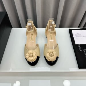 Chanel Sandals Camellia Flower Leather Shiny Beige/Black Color