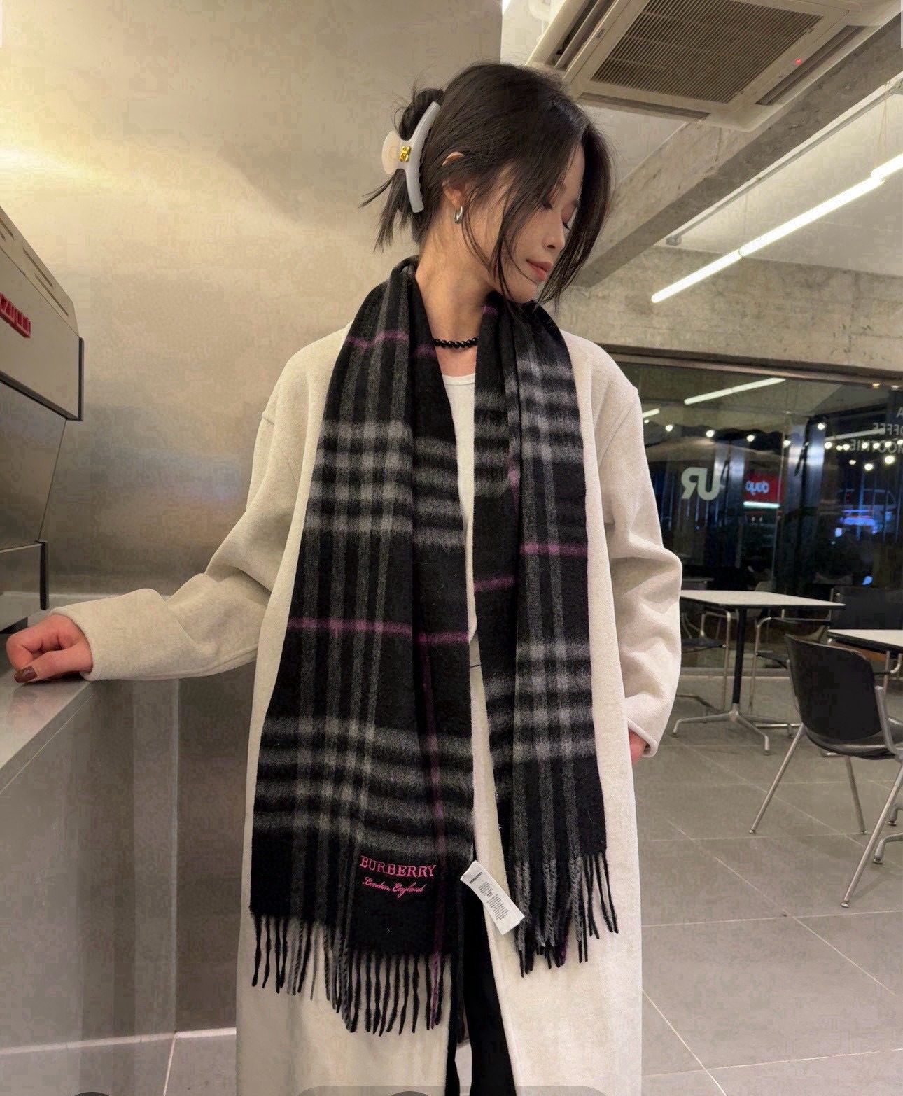 With its distinctive plaid pattern and classic color palette, the scarf easily elevates any outfit.