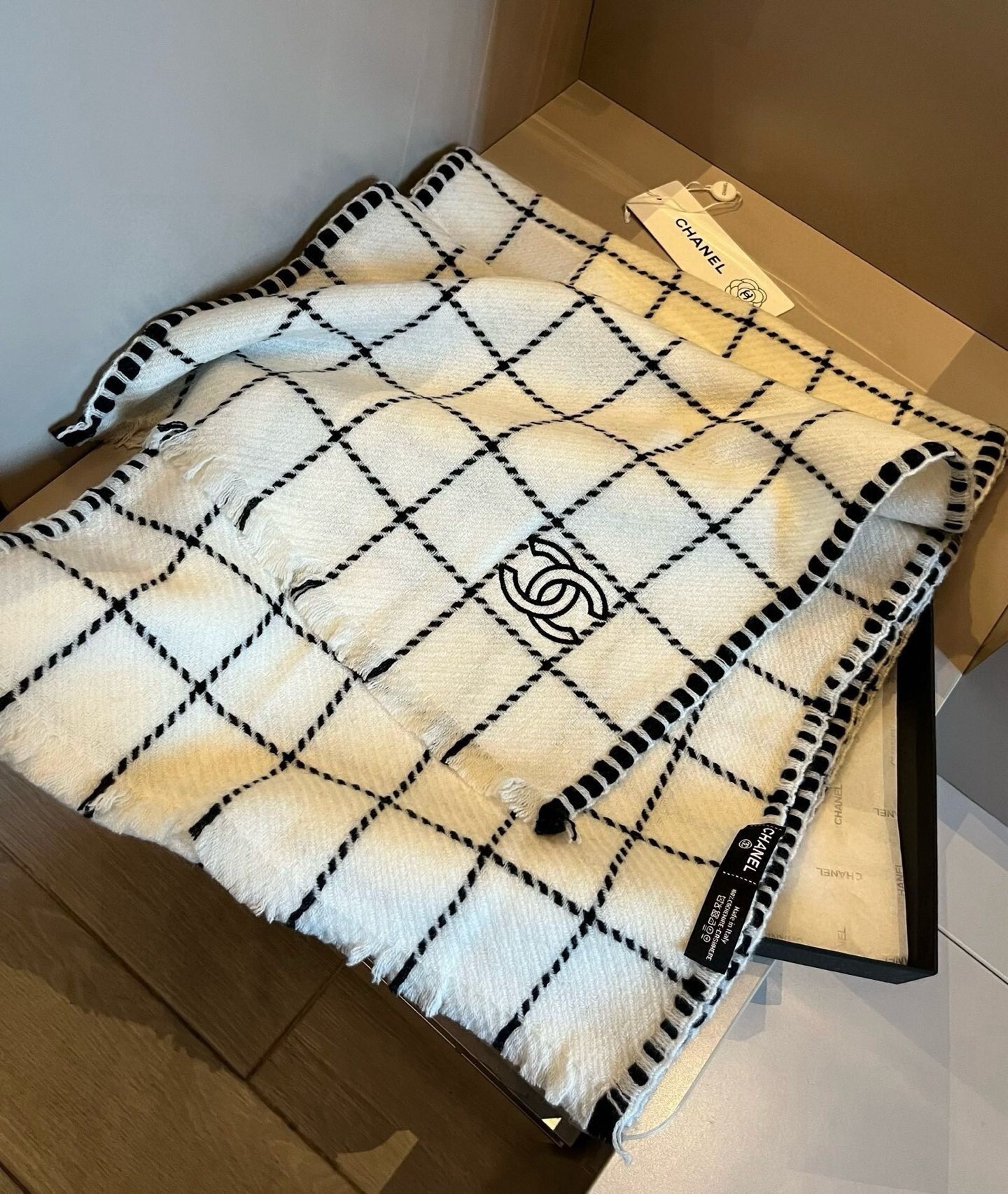 Chanel Cashmere Scarf Checkered White For Women 185cm