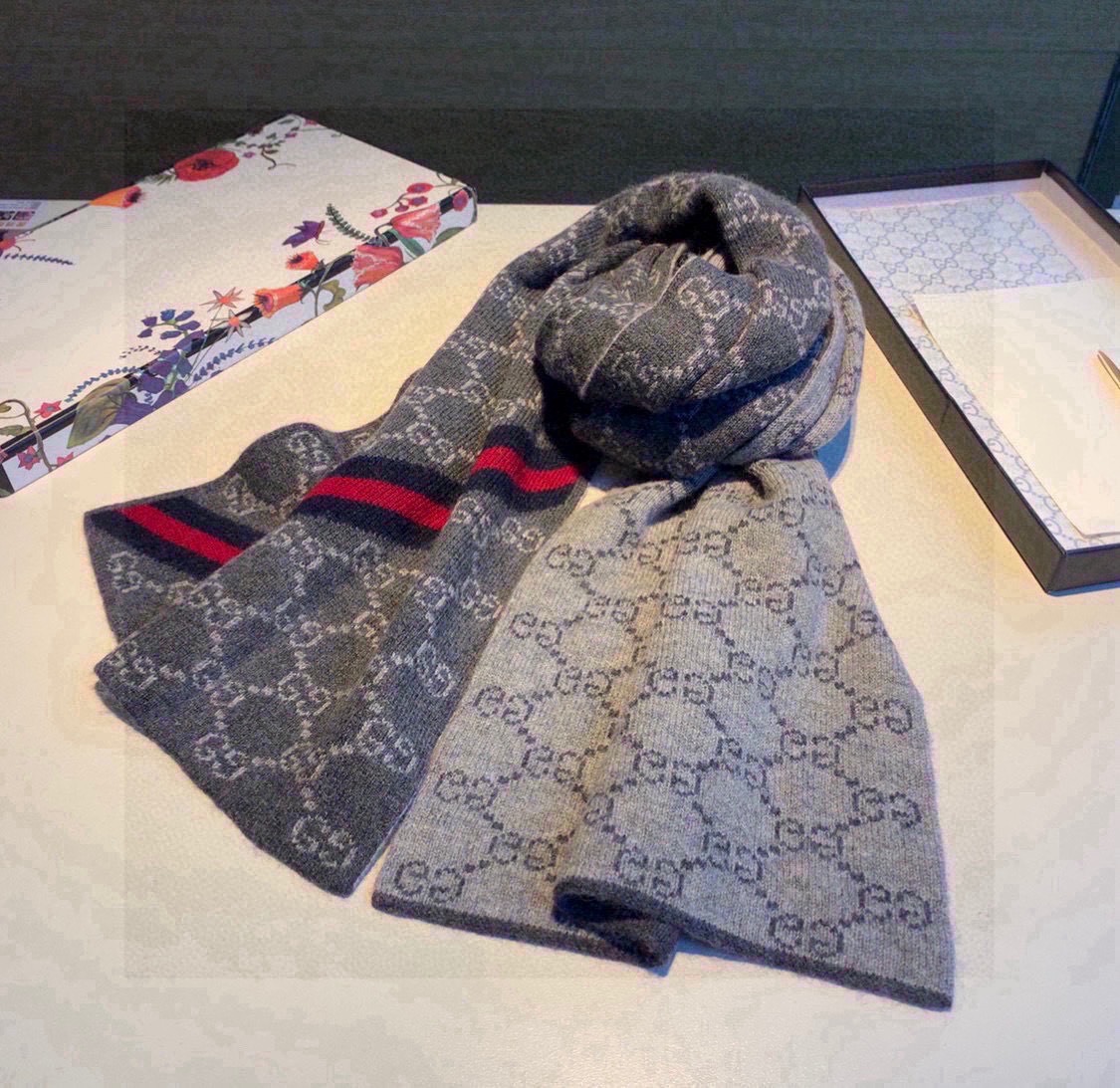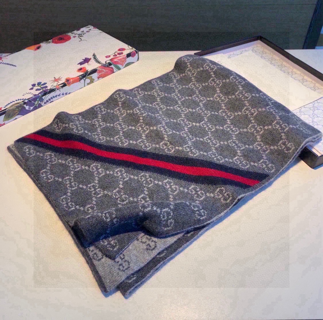 Home Shop Accessories Scarves Gucci Cashmere Scarf GG Monogram Stripe Grey For Women 180cm