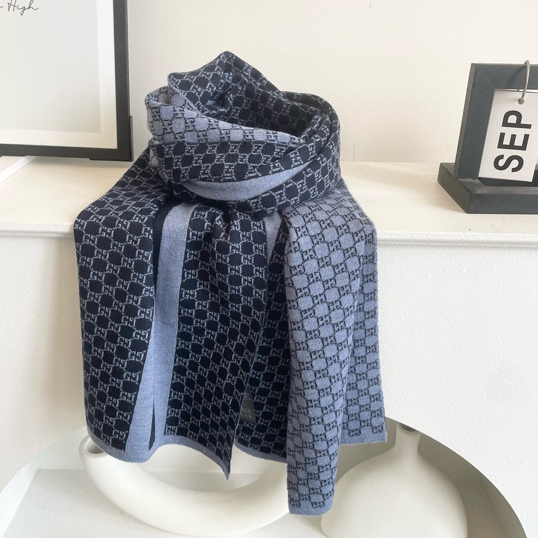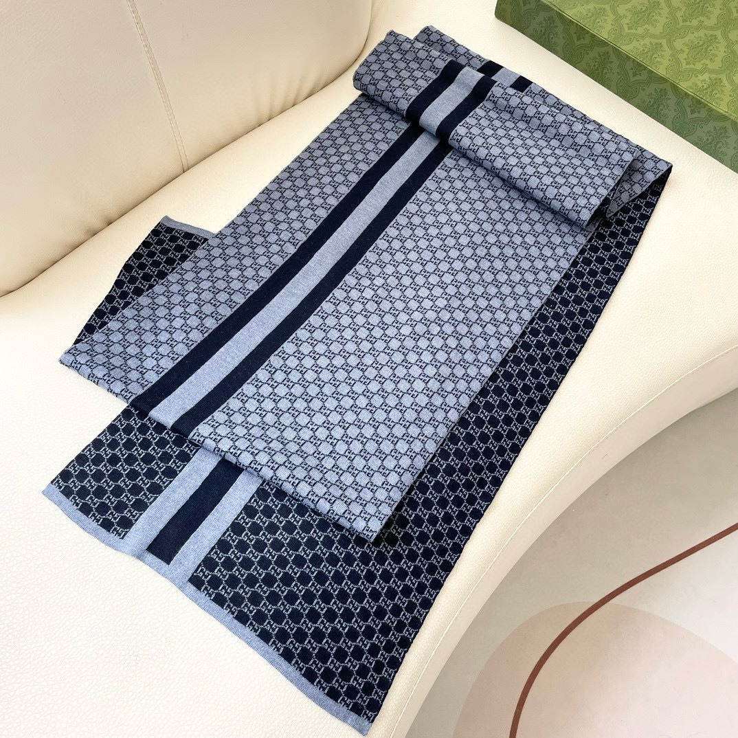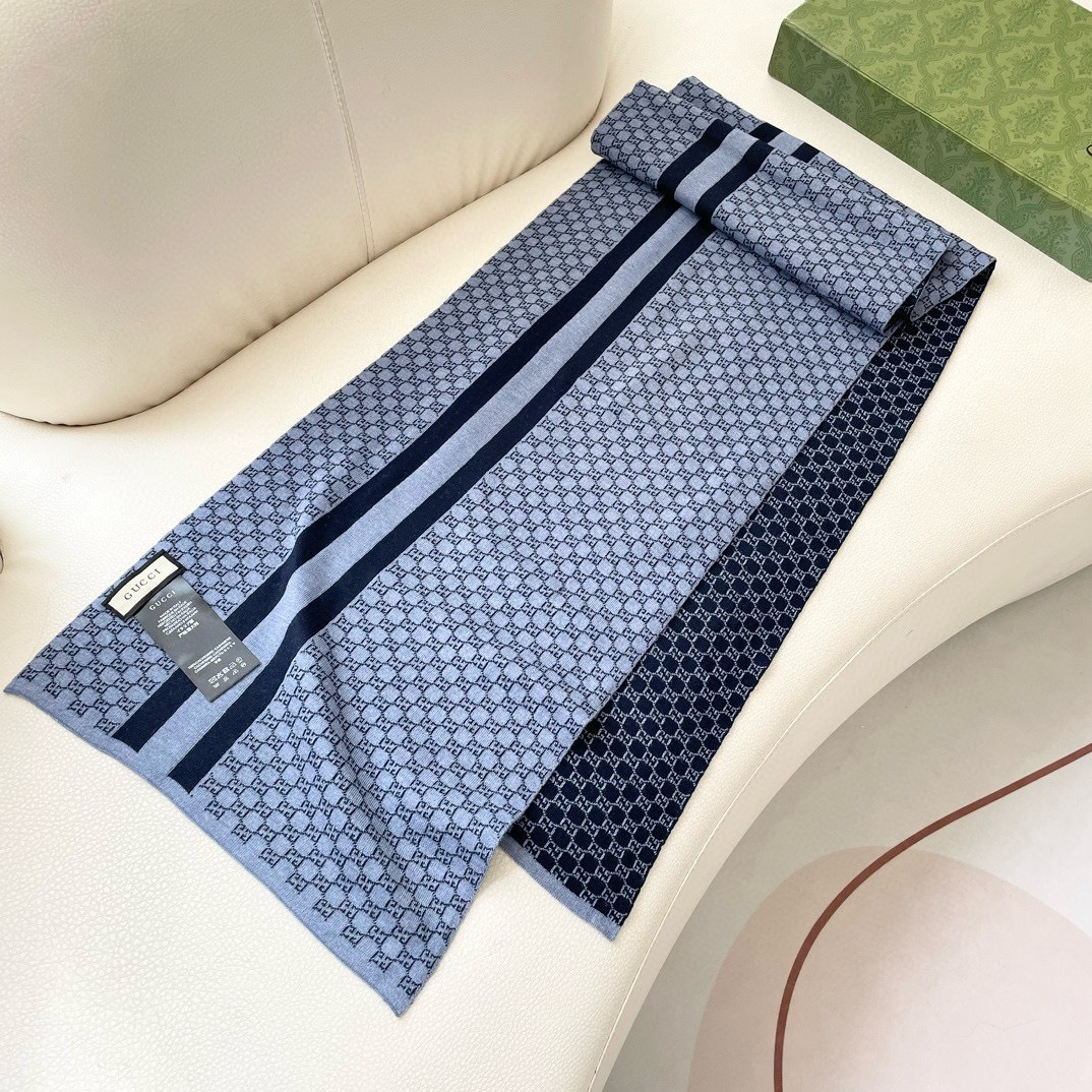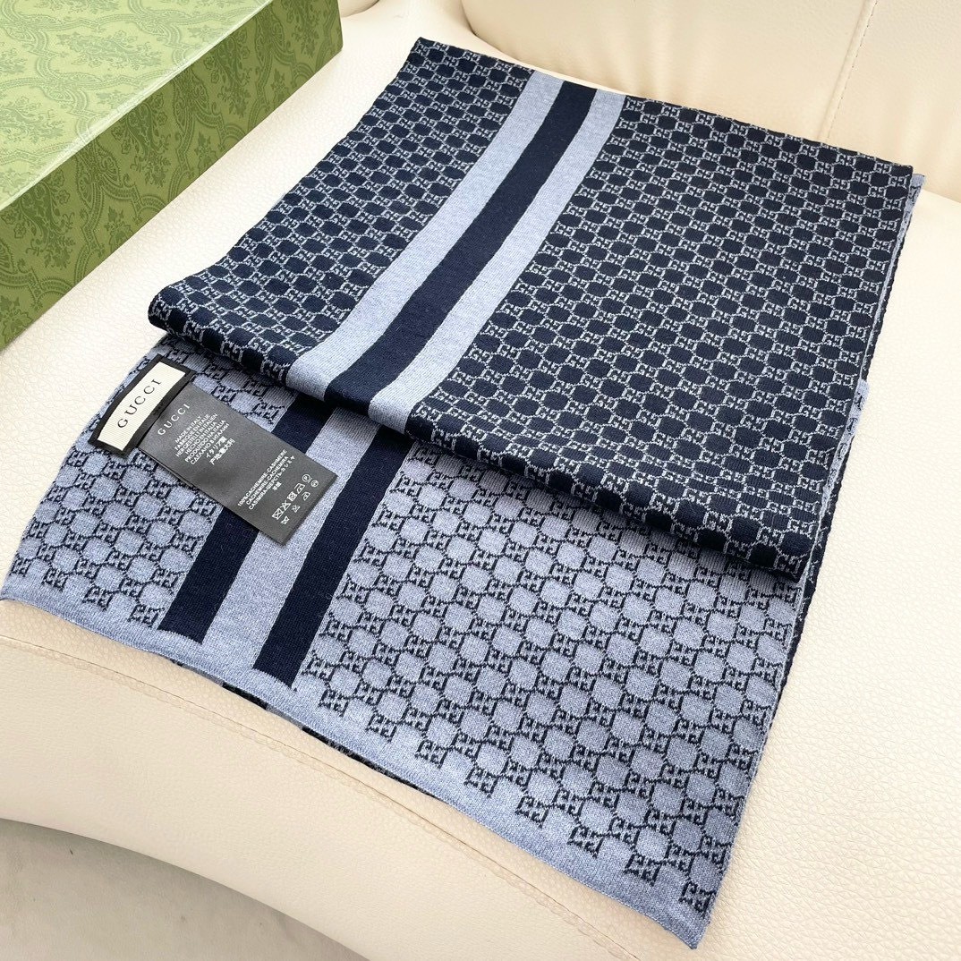This Gucci scarf is a luxurious accessory featuring the brand’s iconic GG monogram.
