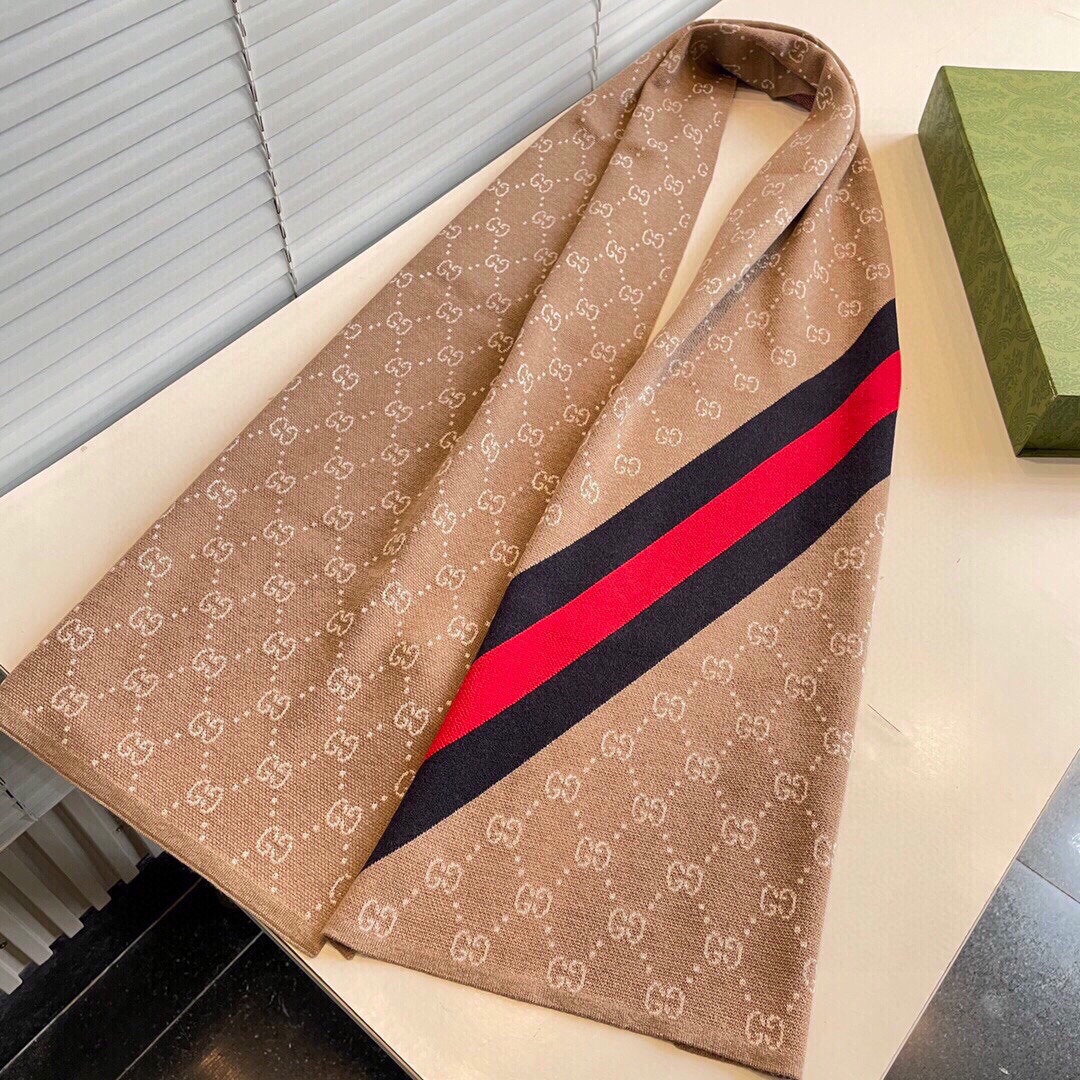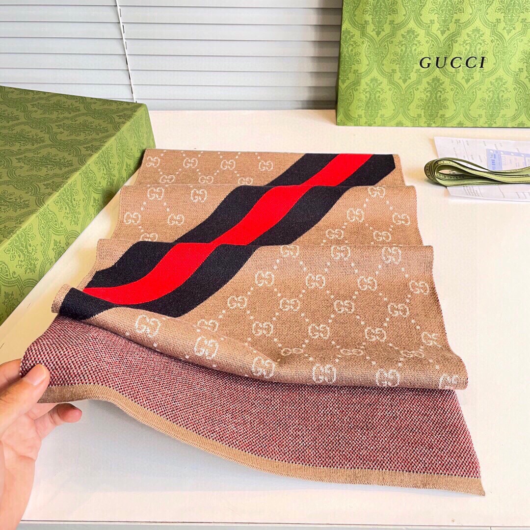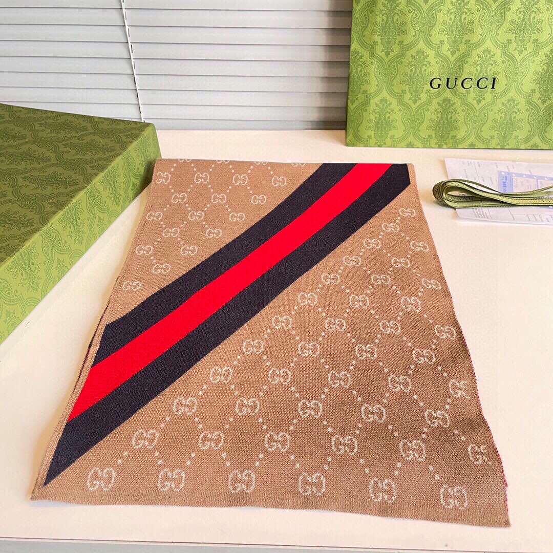 This Gucci scarf is a luxurious accessory featuring the brand’s iconic GG monogram. The rectangular scarf showcases the brand’s iconic GG monogram pattern across one side, complemented by a bold red stripe that adds a vibrant contrast.