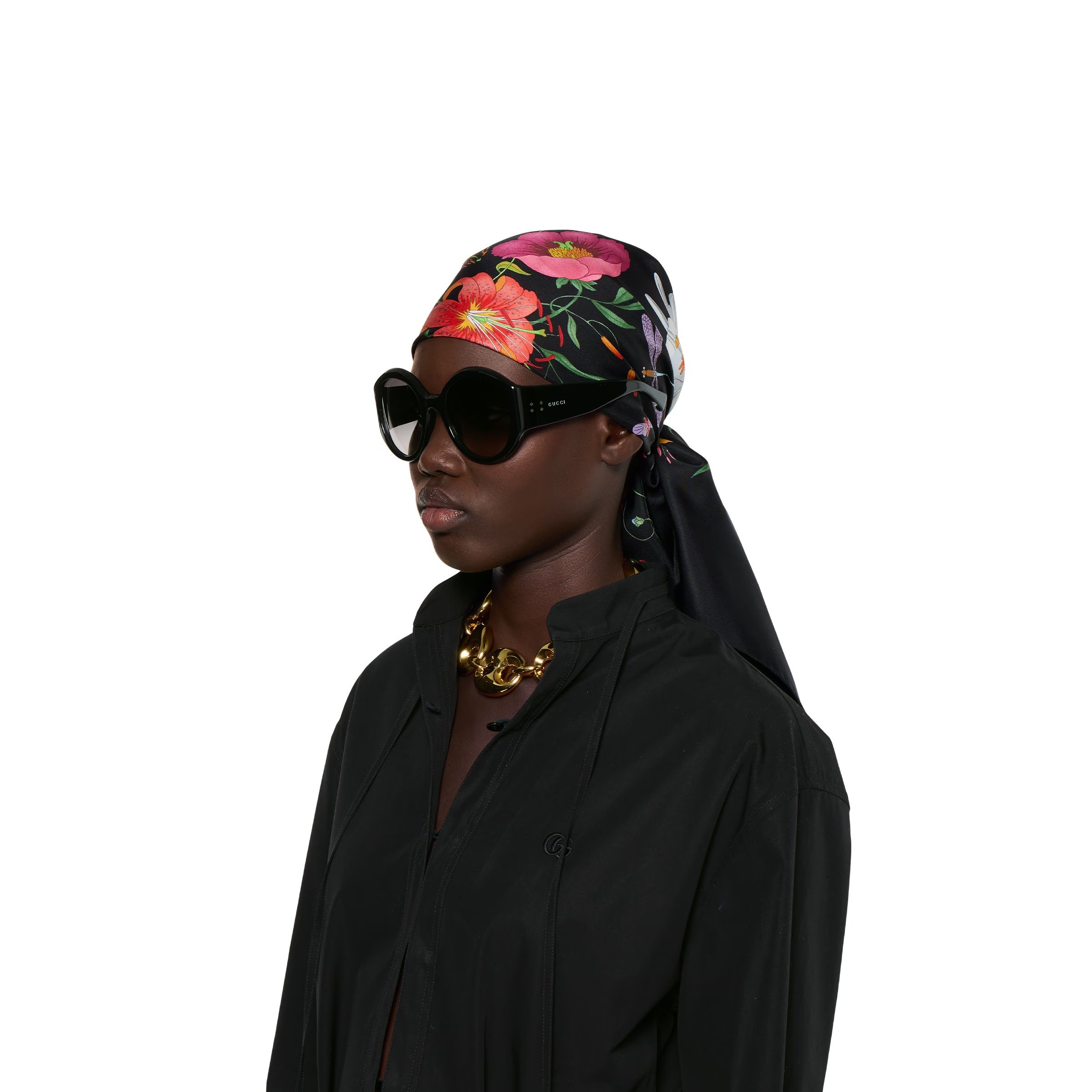 The Pre-Fall 2025 eyewear collection blends an effortless silhouette and signature motifs in a classic design. These sunglasses feature a round frame and a Gucci logo detail with rivets across the temples.
