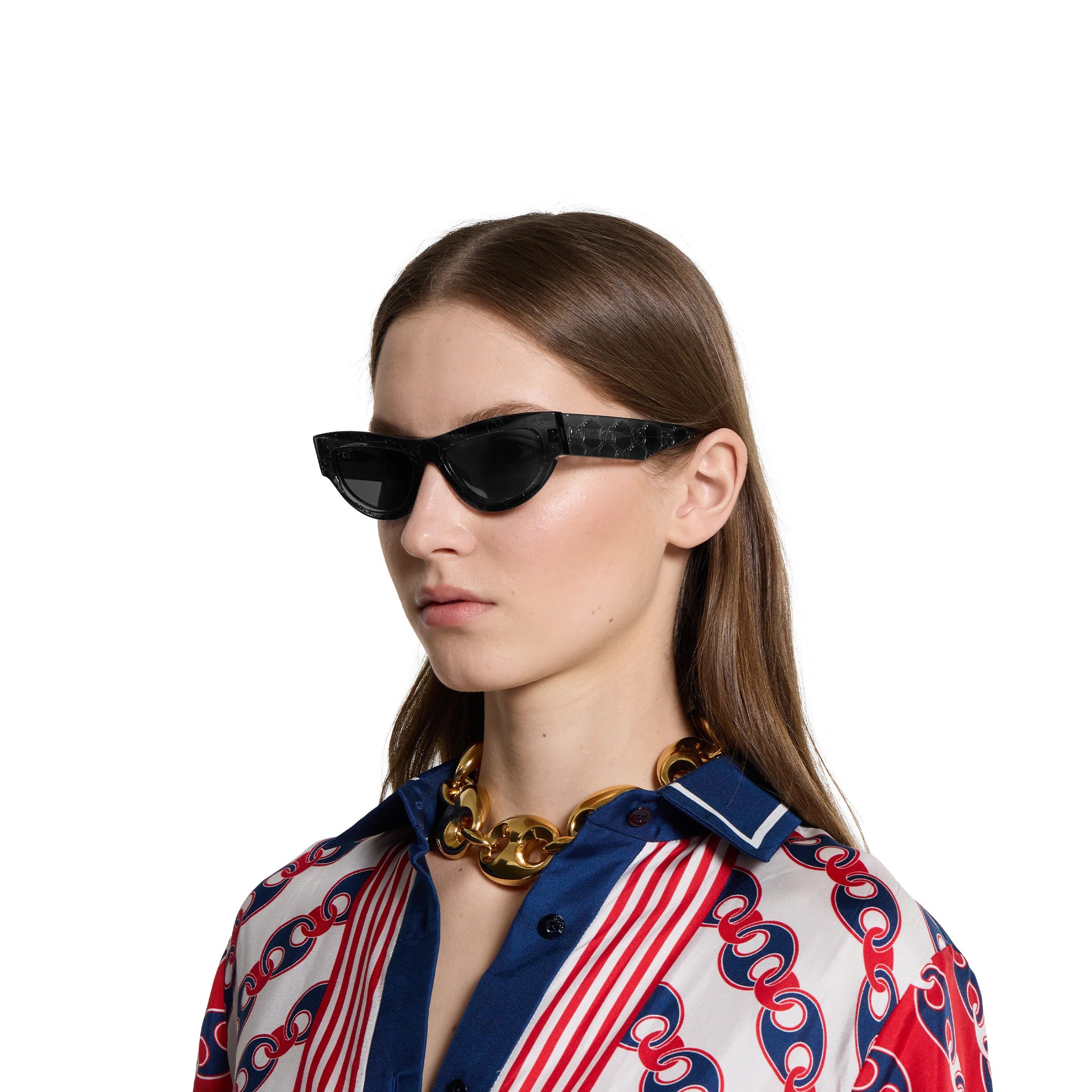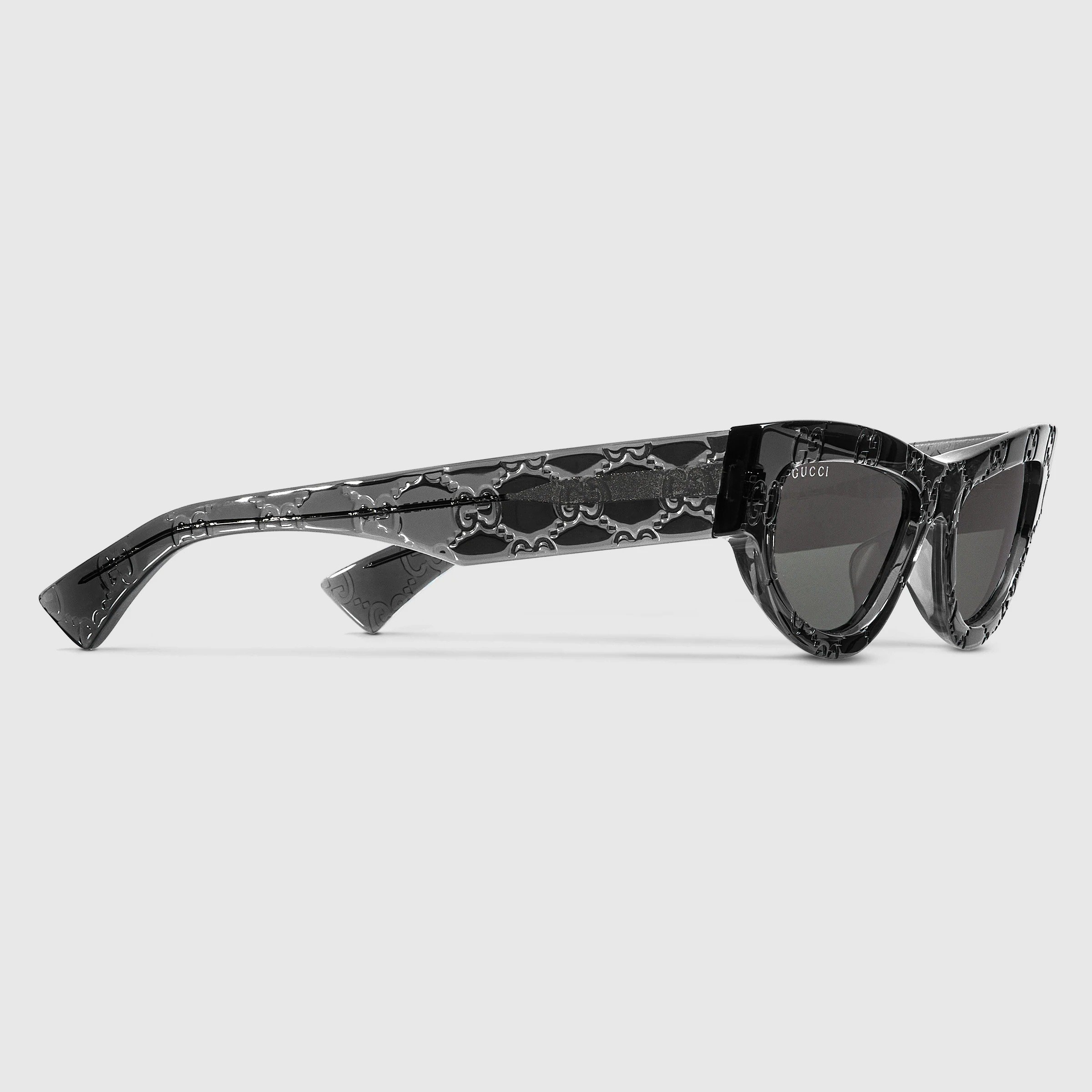 The Pre-Fall 2025 eyewear collection presents the Guccissima motif in a bold hue and silhouette. These cat eye sunglasses are stated in acetate with an allover GG motif. A solid grey lens completes the silhouette.