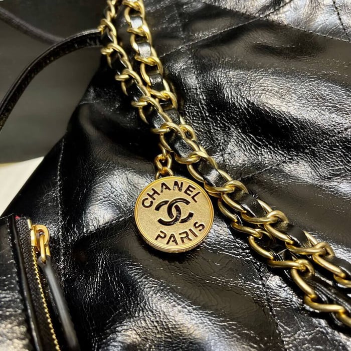– Shiny Calfskin leather strap with interwoven chain detail