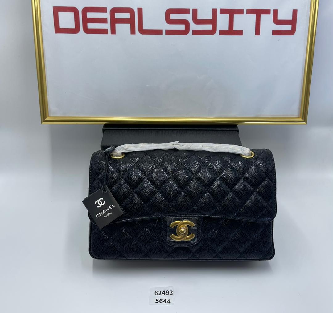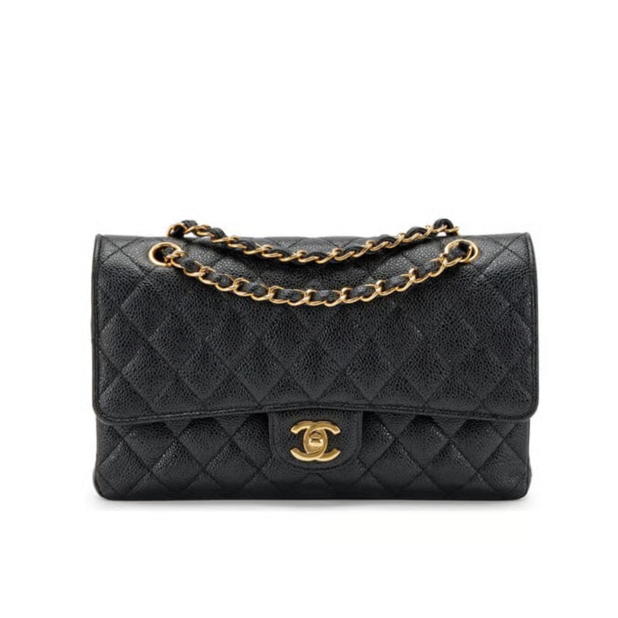 The Medium Classic has a double flap like all Chanel Flap bag sizes (excluding the minis). You will recognize the Medium Chanel Classic bag by the diamond-pattern stitching with eight whole diamonds to a row across the flap. It holds everything from the Small, as well as sunglasses and small toiletries bag.