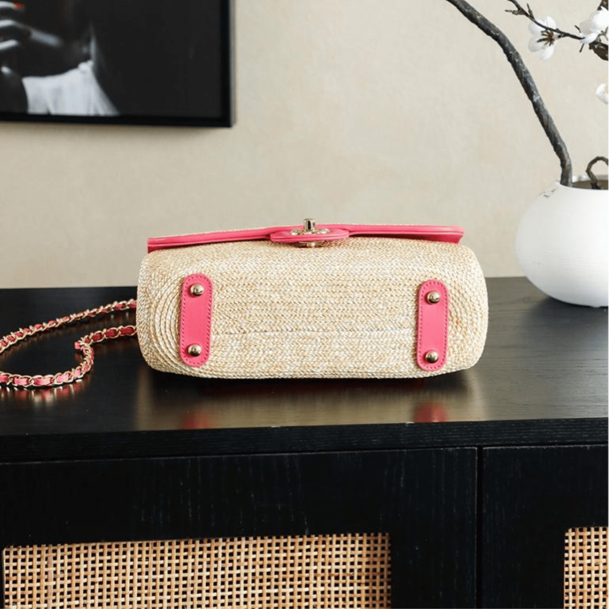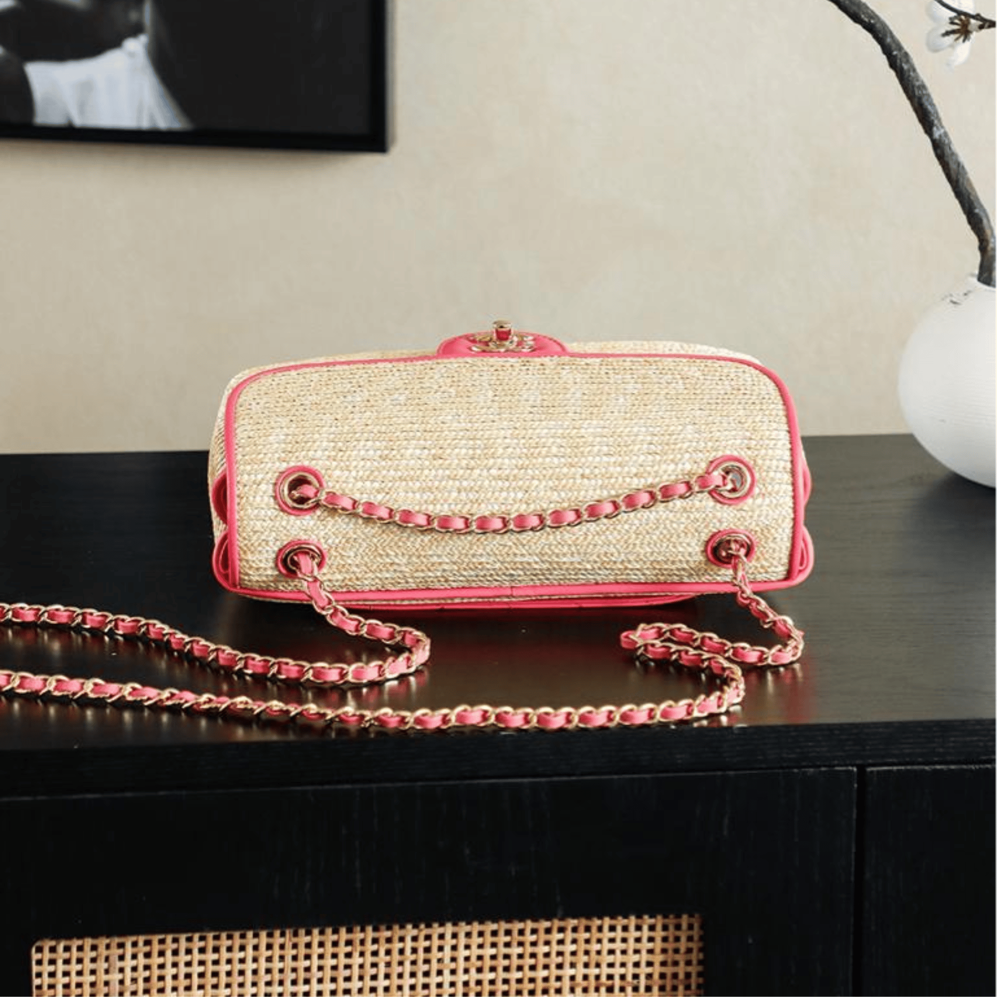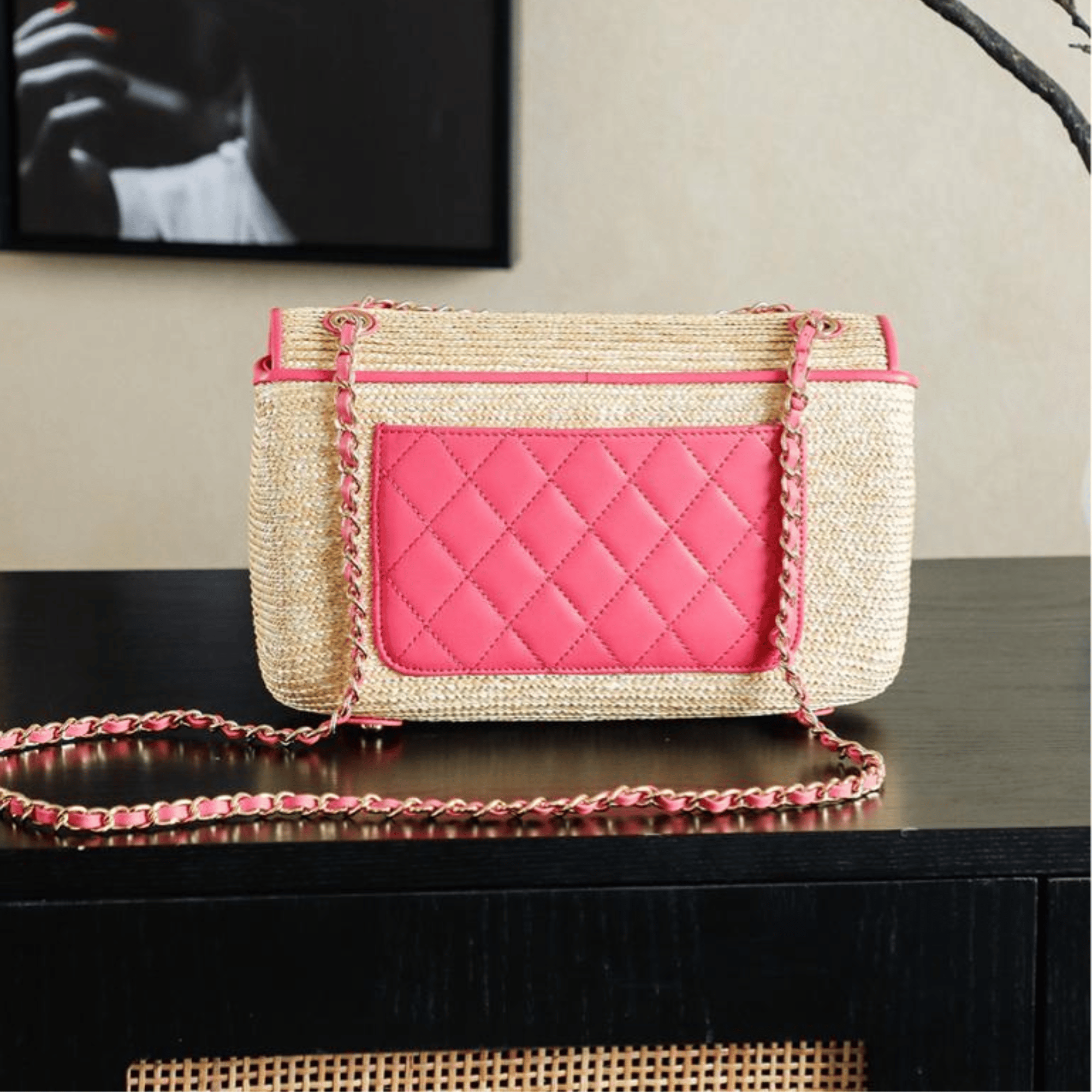 It is equipped with both a top handle for carrying by hand and a chain for wearing on the shoulder or crossbody for versatile styling options.
