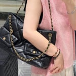 It is equipped with both a top handle for carrying by hand and a chain for wearing on the shoulder or crossbody for versatile styling options.
