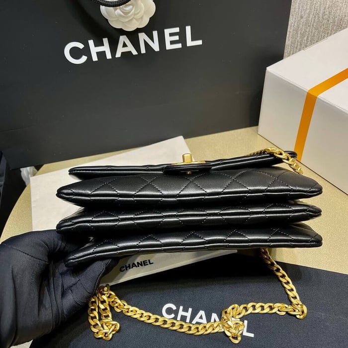 – Gold Lambskin leather strap with interwoven chain detail
