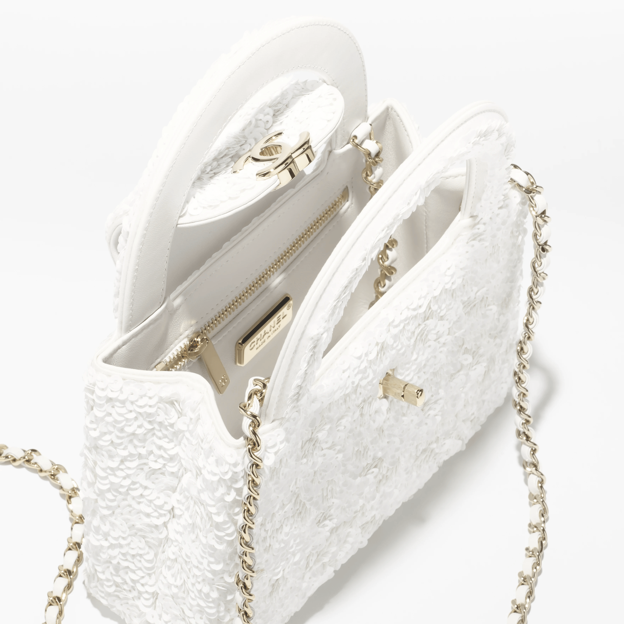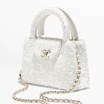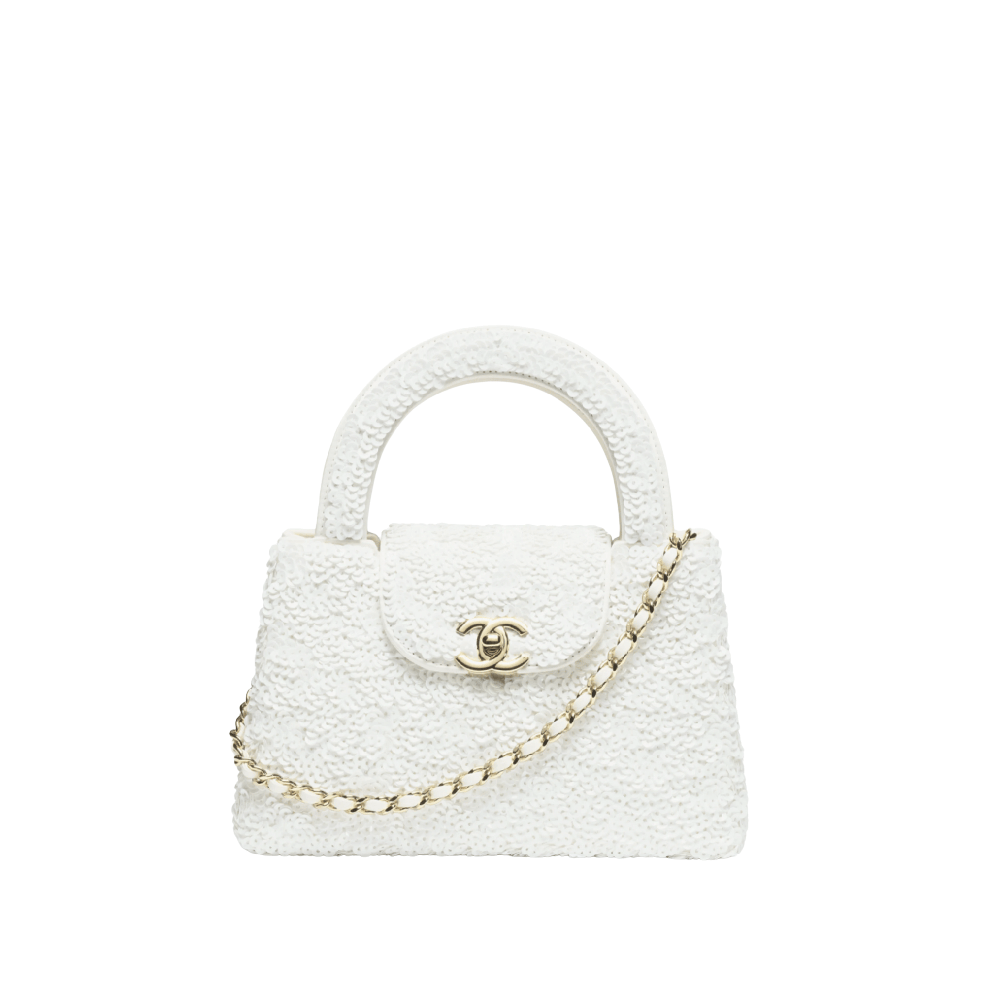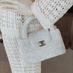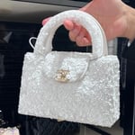 It is equipped with both a top handle for carrying by hand and a chain for wearing on the shoulder or crossbody for versatile styling options.