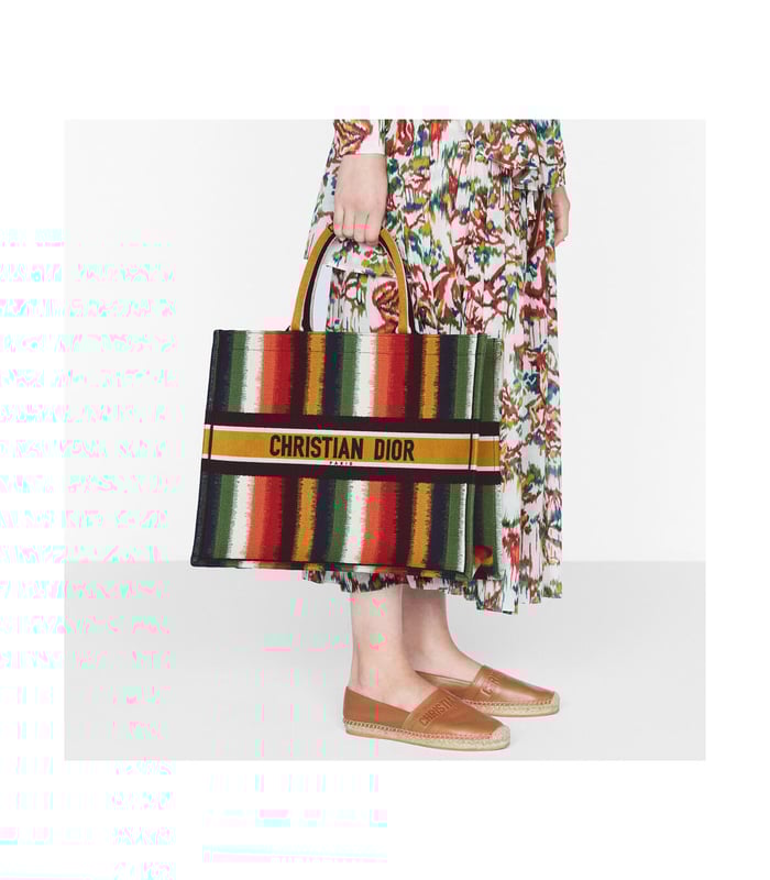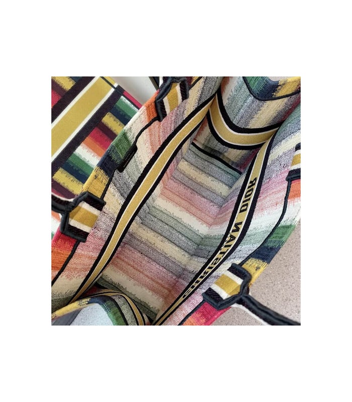 The Dior Book Tote, an original style introduced by Creative Director Maria Grazia Chiuri, has become a staple of the Dior aesthetic. Designed to carry all the daily essentials, the silhouette offers a new take on the bayadère motif with a modern variation, fully embroidered with the multicolor and heathered-effect D-Stripes motif. The carryall boasts a ‘Christian Dior’ signature on the front and is a prime example of Dior savoir-faire.