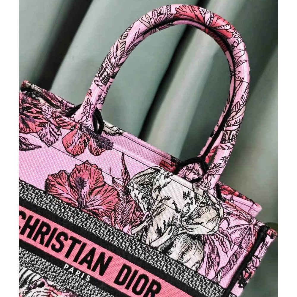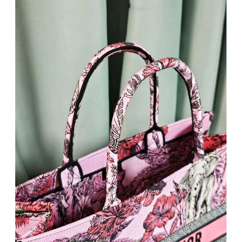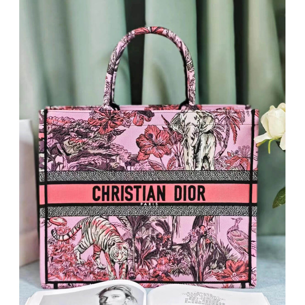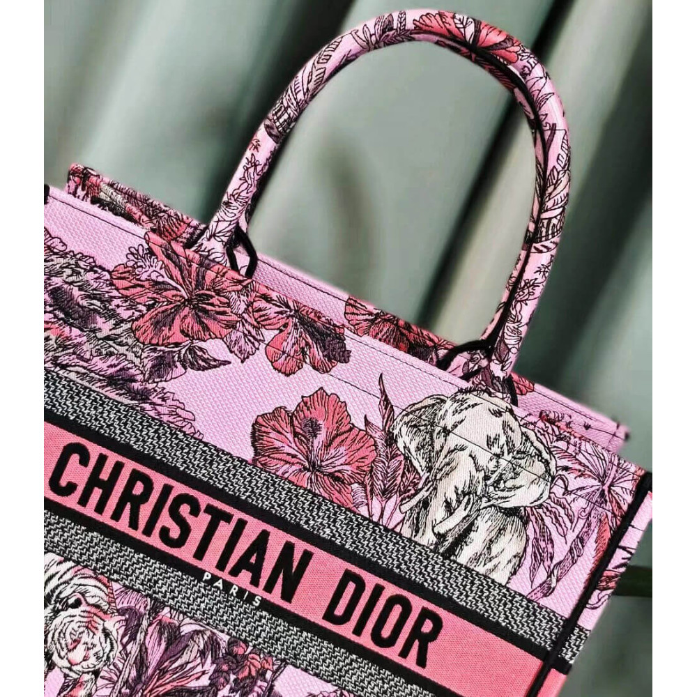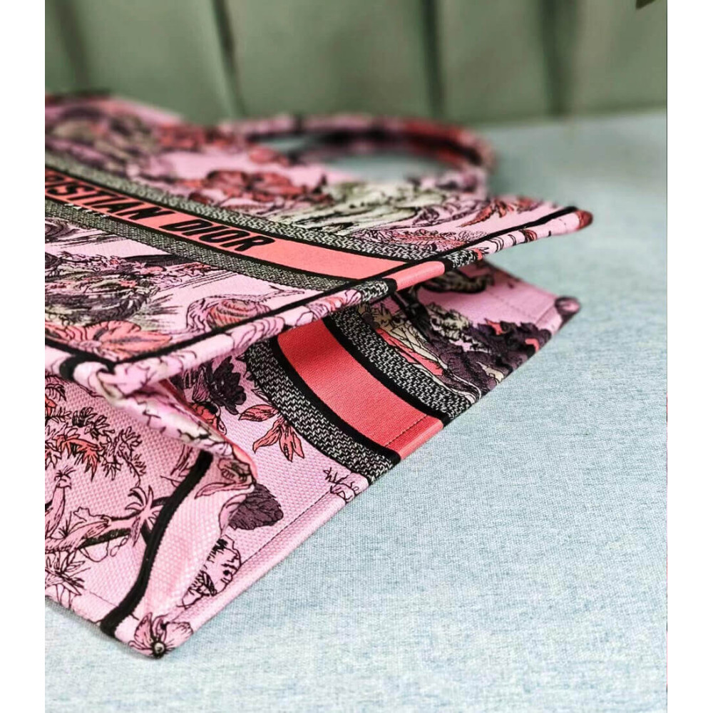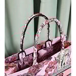 Introduced by Maria Grazia Chiuri, Creative Director of Christian Dior, the Dior Book Tote has become a staple of the Dior aesthetic. Designed to hold all the daily essentials, the pink multicolor style is fully embroidered with the Toile de Jouy Voyage motif by Pietro Ruffo, setting Mr. Dior’s iconic pattern into the heart of Indian flora and fauna. Adorned with the Christian Dior Paris signature on the front, the large tote exemplifies the House’s signature savoir-faire and may be carried by hand or worn over the shoulder.