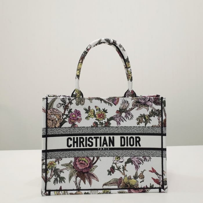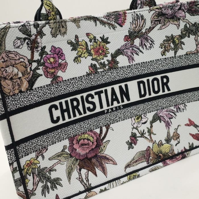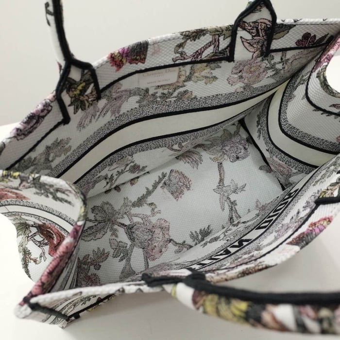 The Dior Book Tote is an original creation introduced by Maria Grazia Chiuri, Dior’s Creative Director, and has become a staple of the Dior aesthetic. Designed to hold all the daily essentials, it is fully embroidered with the white multicolor Dior Jardin Botanique motif and presents a romantic floral pattern inspired by Mr. Dior’s beloved Granville gardens. Adorned with the ‘CHRISTIAN DIOR PARIS’ signature on the front, the medium tote exemplifies the House’s signature savoir-faire and may be carried by hand or worn over the shoulder.