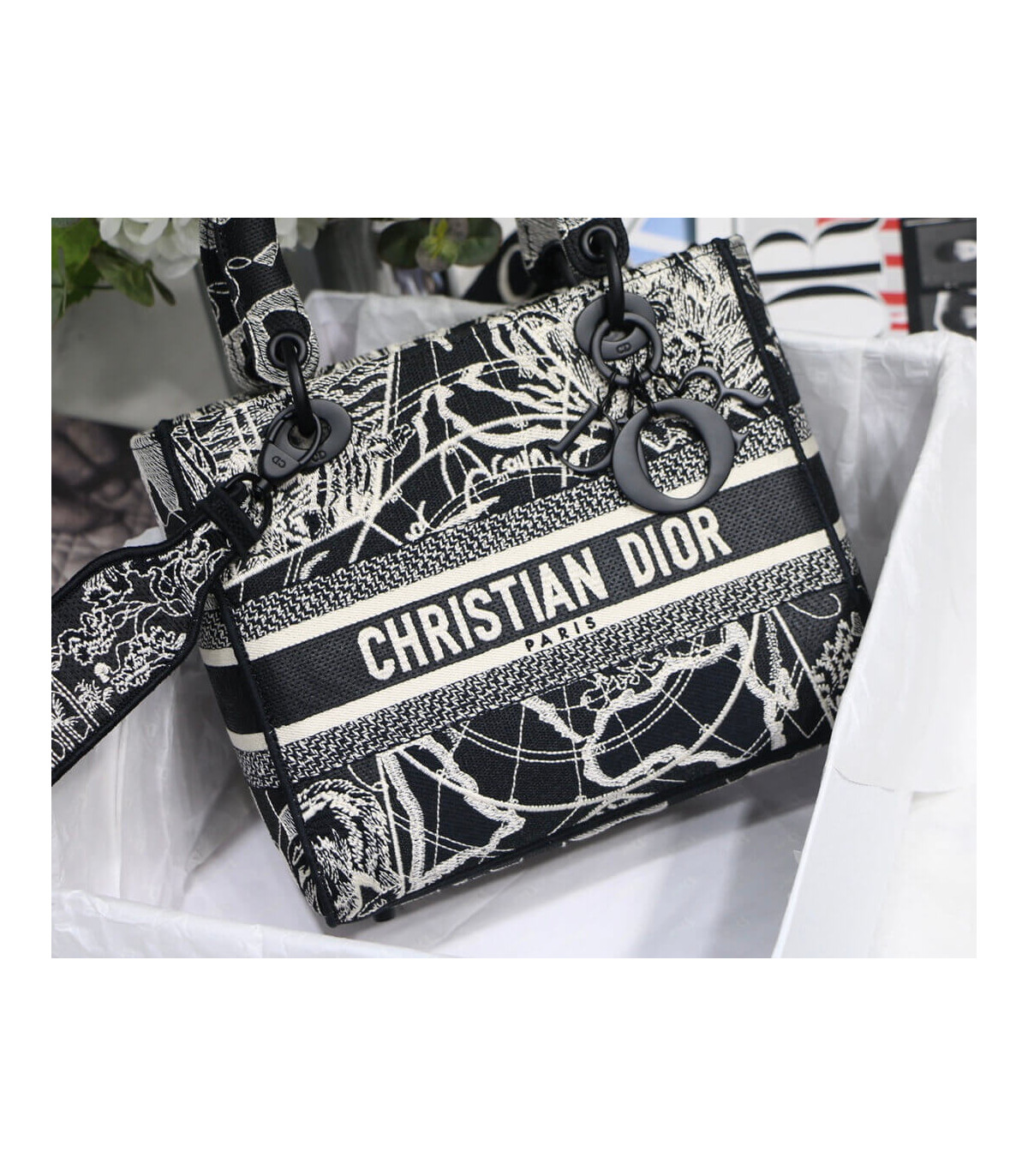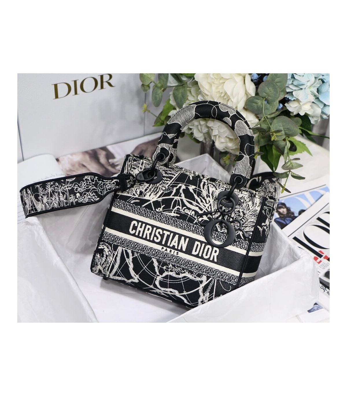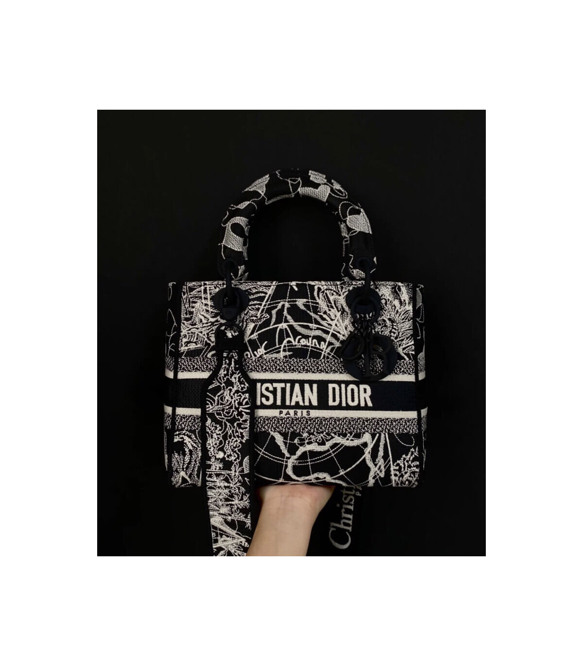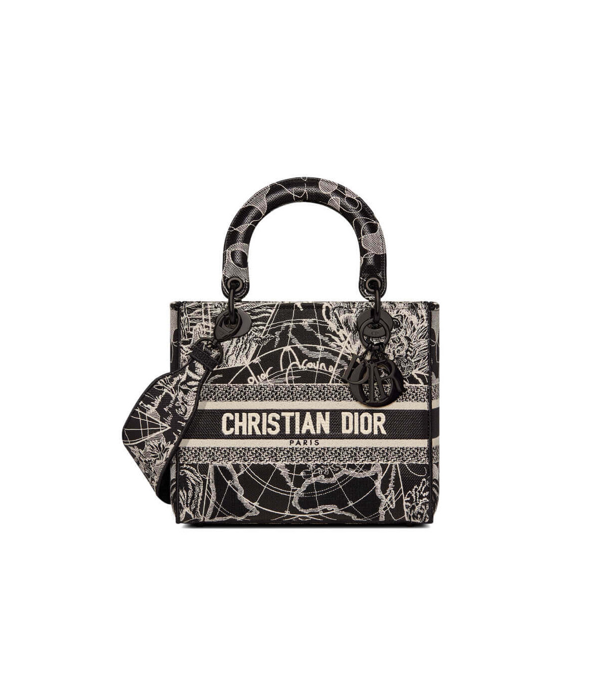 The Lady D-Lite bag combines classic elegance with House modernity. The black style is fully embroidered with white the Dior Around the World motif and embellished with a play on contrasts of shiny and matte thread. The front features a ‘CHRISTIAN DIOR’ signature while the thick ‘D.I.O.R.’ charms reveal for the first time a shiny black metal, further enhancing the silhouette. Equipped with a wide, reversible and removable embroidered shoulder strap, the medium Lady D-Lite bag can be carried by hand, worn over the shoulder or crossbody.