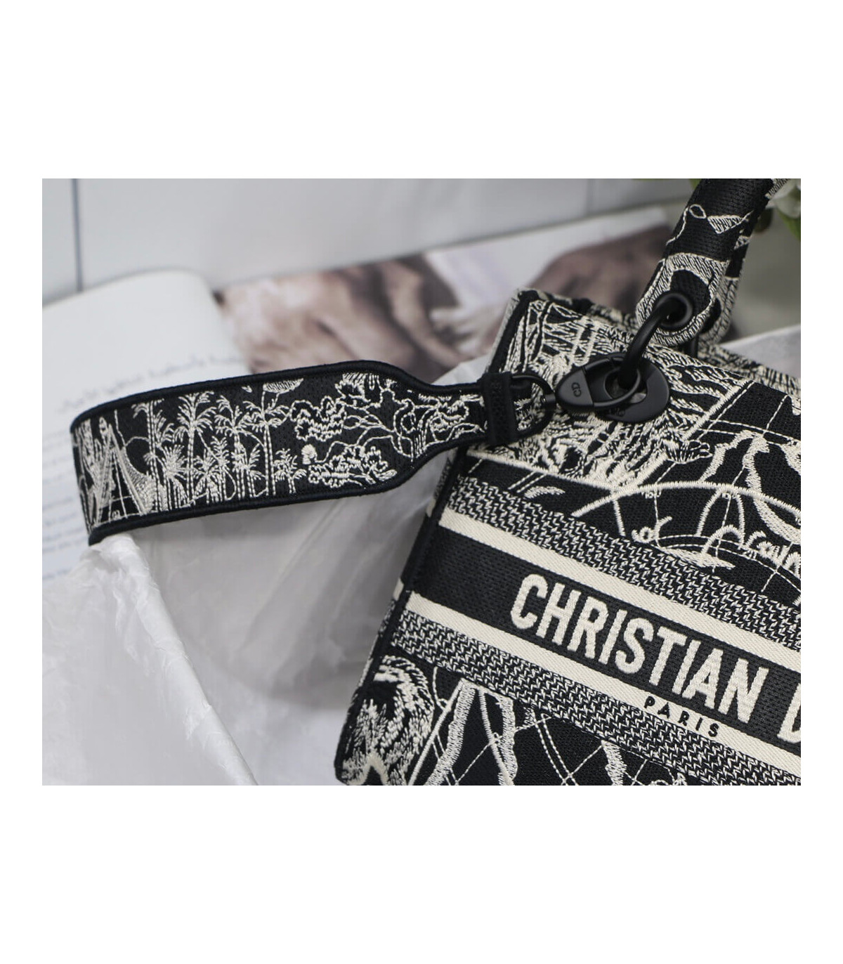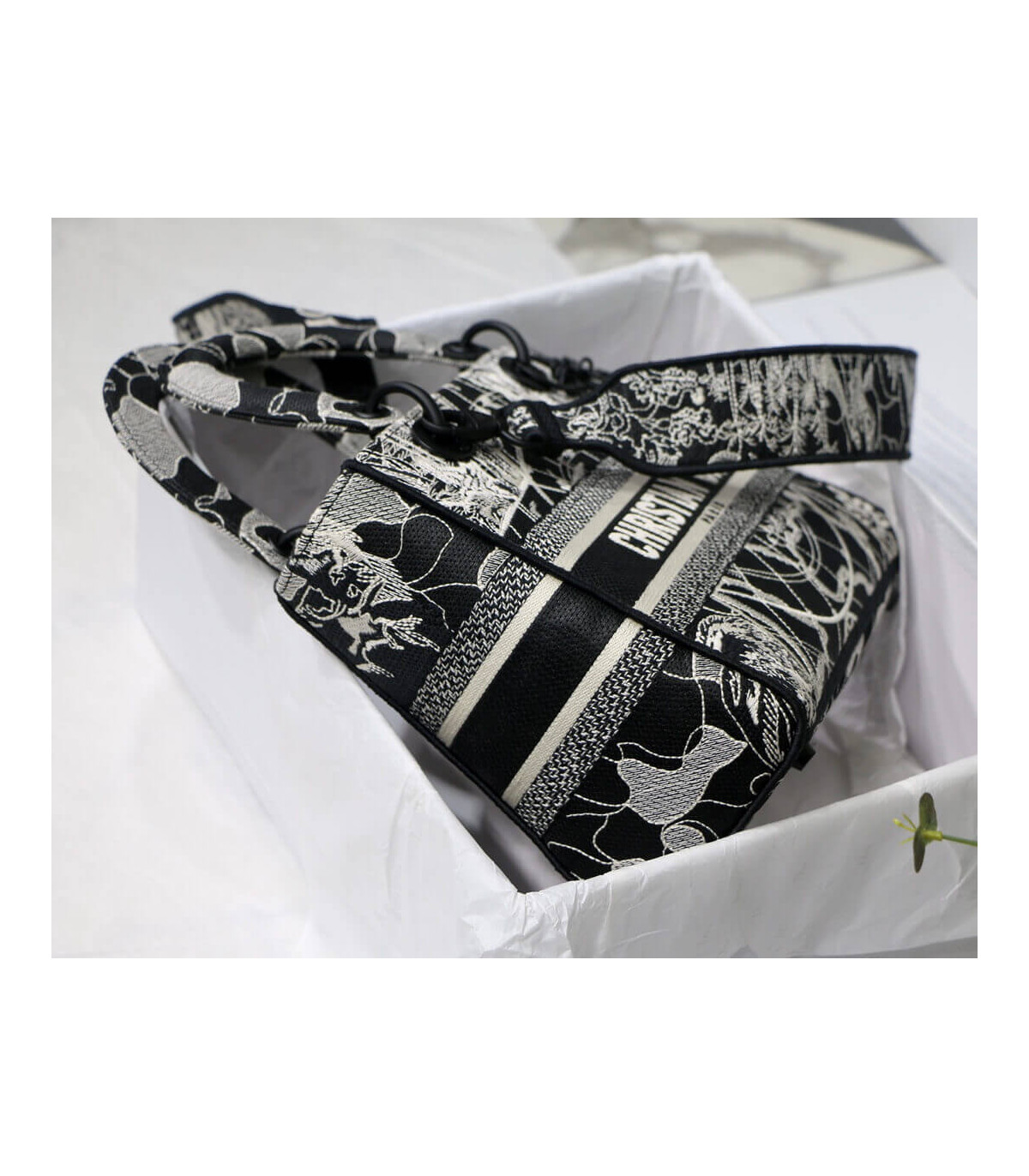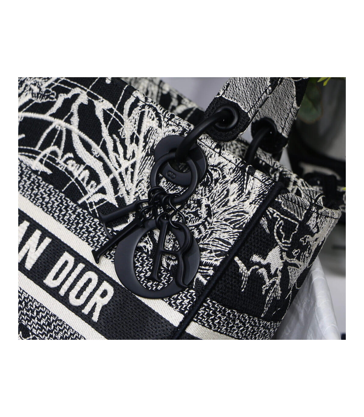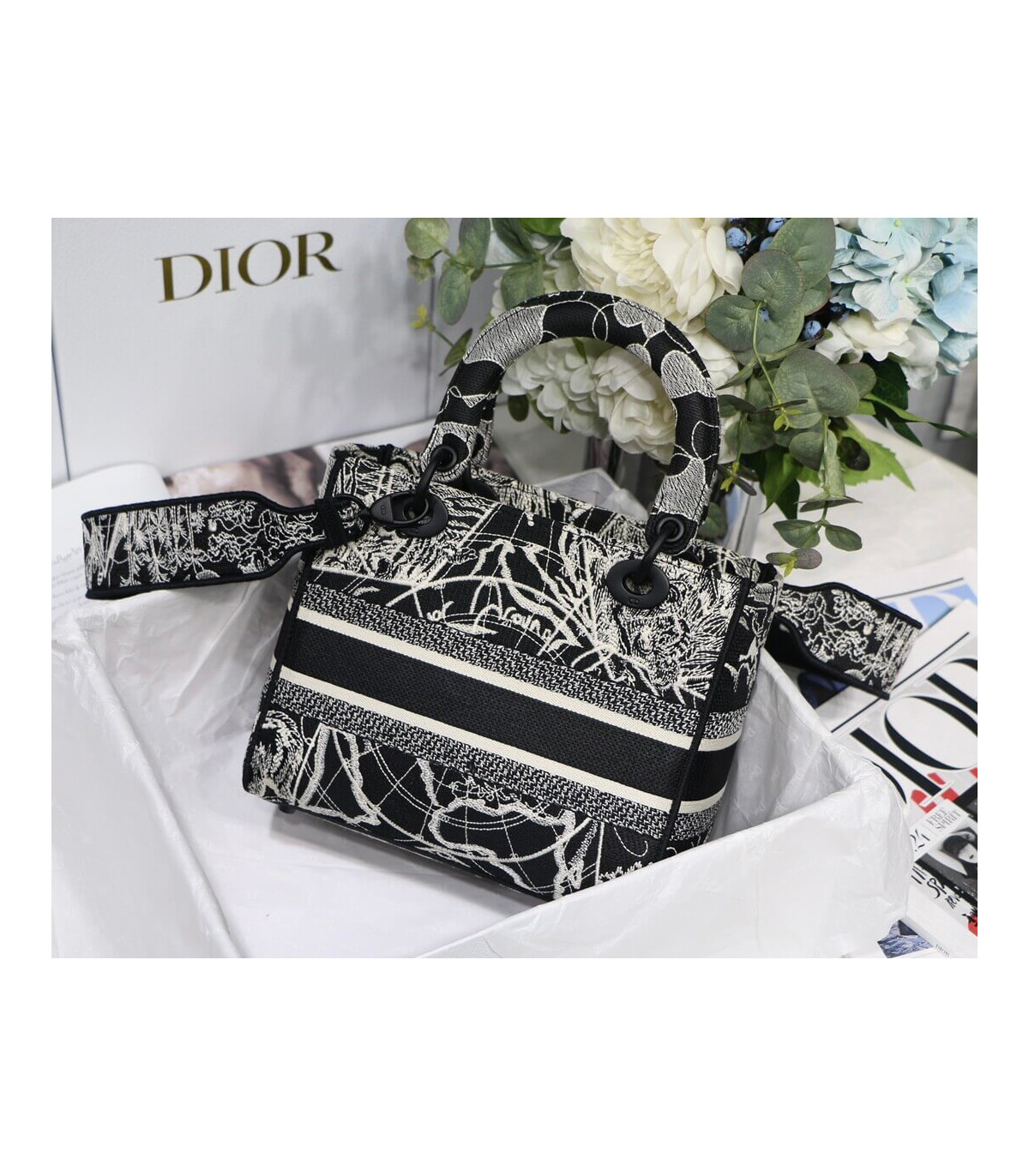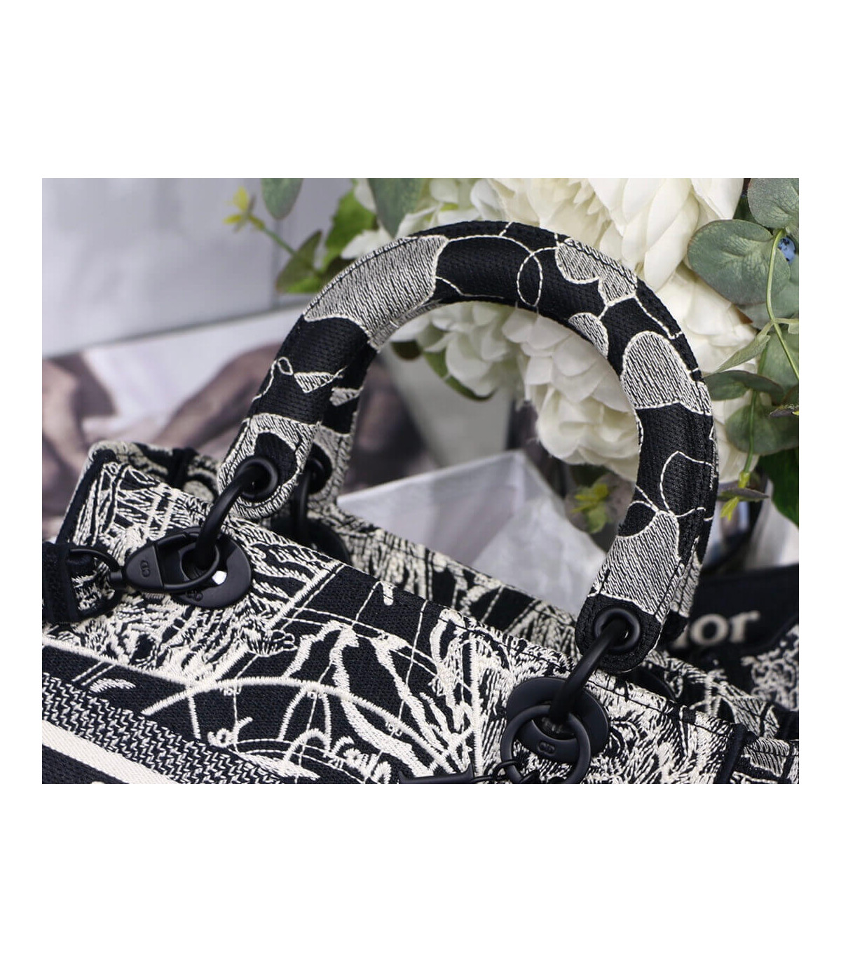 The Lady D-Lite bag combines classic elegance with House modernity. The black style is fully embroidered with white the Dior Around the World motif and embellished with a play on contrasts of shiny and matte thread. The front features a ‘CHRISTIAN DIOR’ signature while the thick ‘D.I.O.R.’ charms reveal for the first time a shiny black metal, further enhancing the silhouette. Equipped with a wide, reversible and removable embroidered shoulder strap, the medium Lady D-Lite bag can be carried by hand, worn over the shoulder or crossbody.