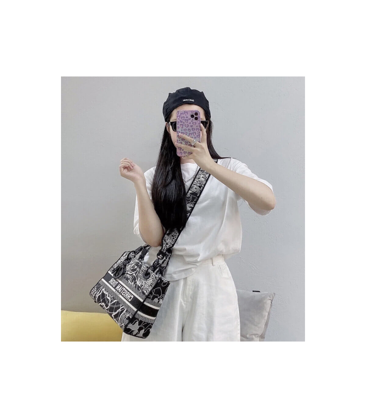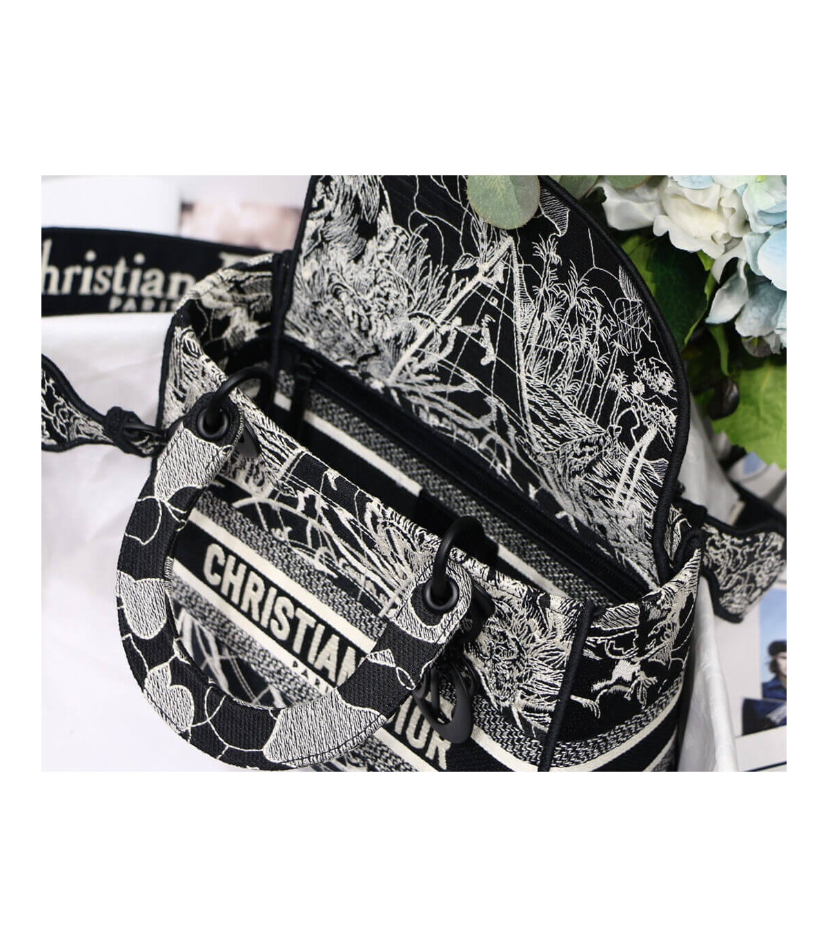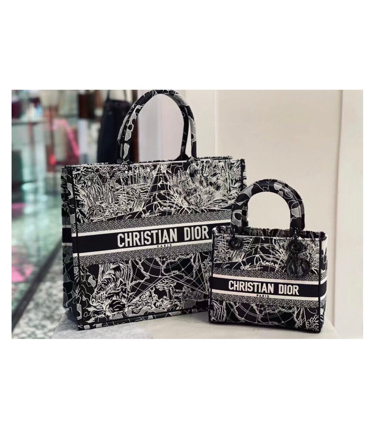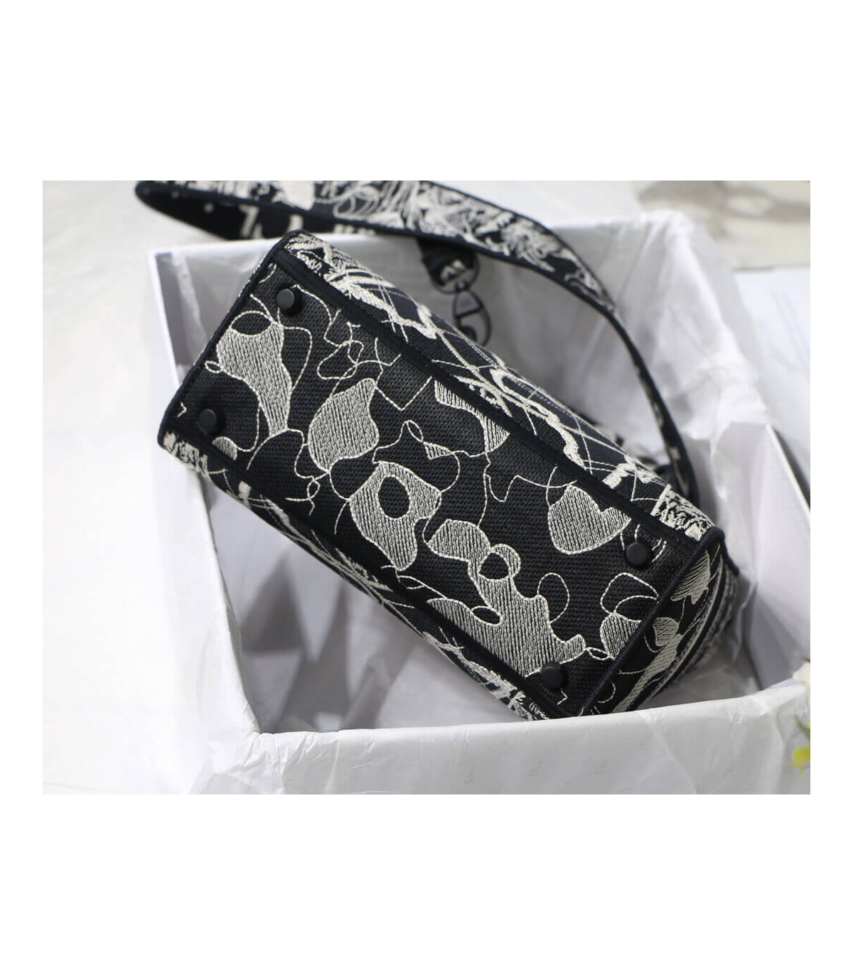 The Lady D-Lite bag combines classic elegance with House modernity. The black style is fully embroidered with white the Dior Around the World motif and embellished with a play on contrasts of shiny and matte thread. The front features a ‘CHRISTIAN DIOR’ signature while the thick ‘D.I.O.R.’ charms reveal for the first time a shiny black metal, further enhancing the silhouette. Equipped with a wide, reversible and removable embroidered shoulder strap, the medium Lady D-Lite bag can be carried by hand, worn over the shoulder or crossbody.