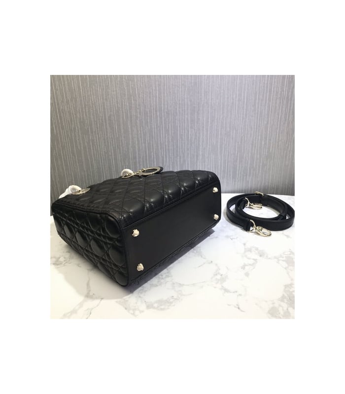 The Lady Dior bag epitomizes Dior’s vision of elegance and beauty. Refined and sophisticated, the timeless yet relevant style is crafted in black lambskin with Cannage stitching, creating the instantly recognizable quilted texture. This season’s tonal enamel ‘D.I.O.R.’ charms offer an elegant touch. The medium Lady Dior bag has a removable leather shoulder strap.