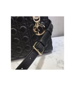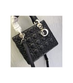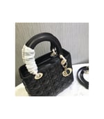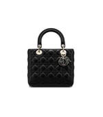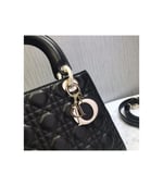 The Lady Dior bag epitomizes Dior’s vision of elegance and beauty. Refined and sophisticated, the timeless yet relevant style is crafted in black lambskin with Cannage stitching, creating the instantly recognizable quilted texture. This season’s tonal enamel ‘D.I.O.R.’ charms offer an elegant touch. The medium Lady Dior bag has a removable leather shoulder strap.