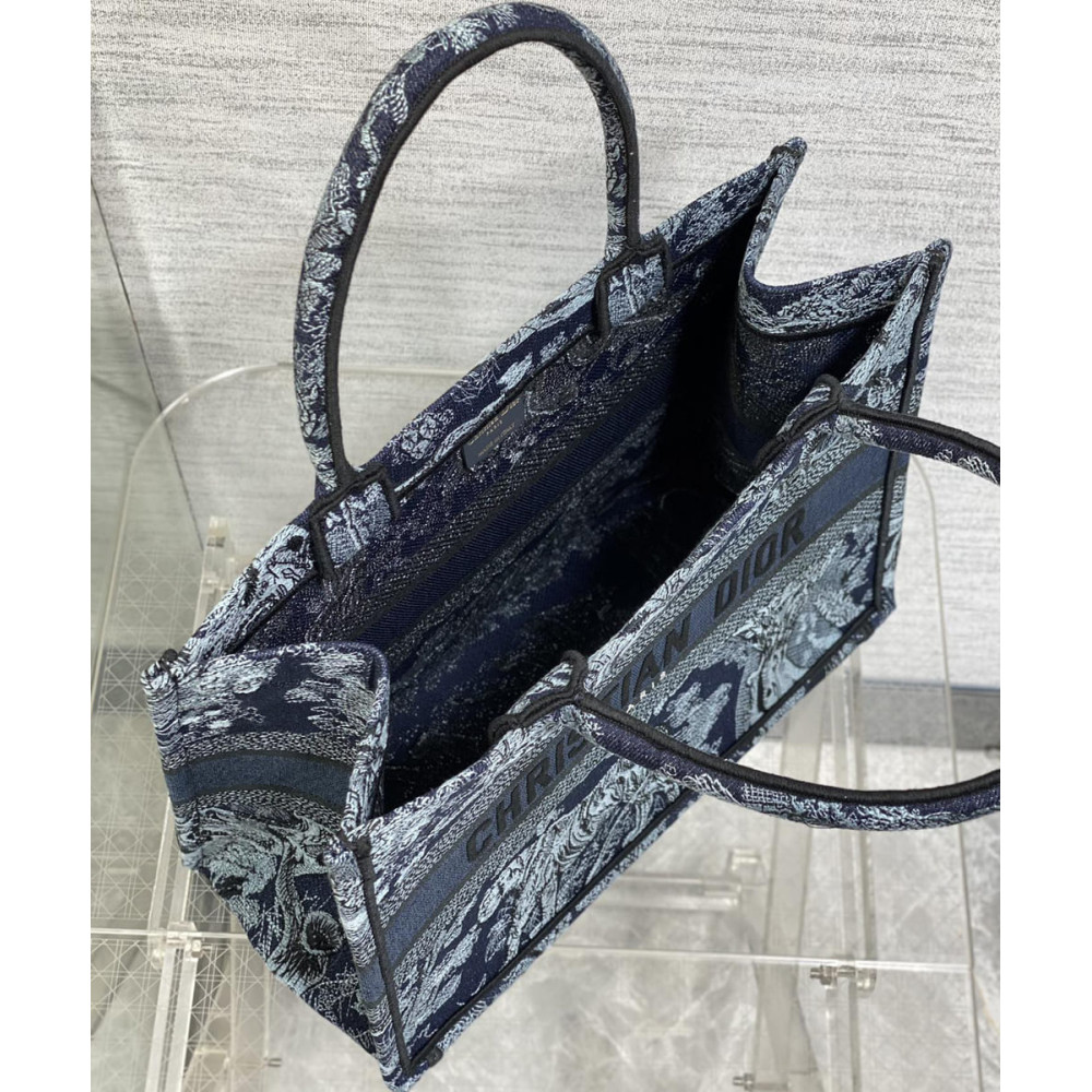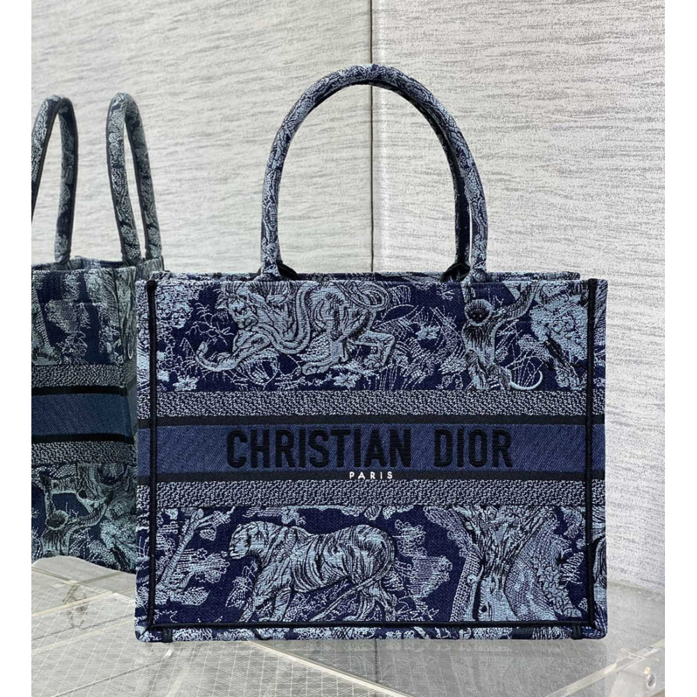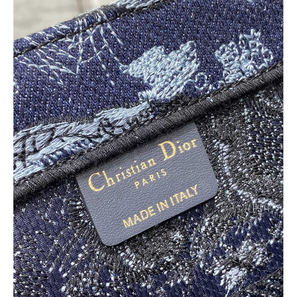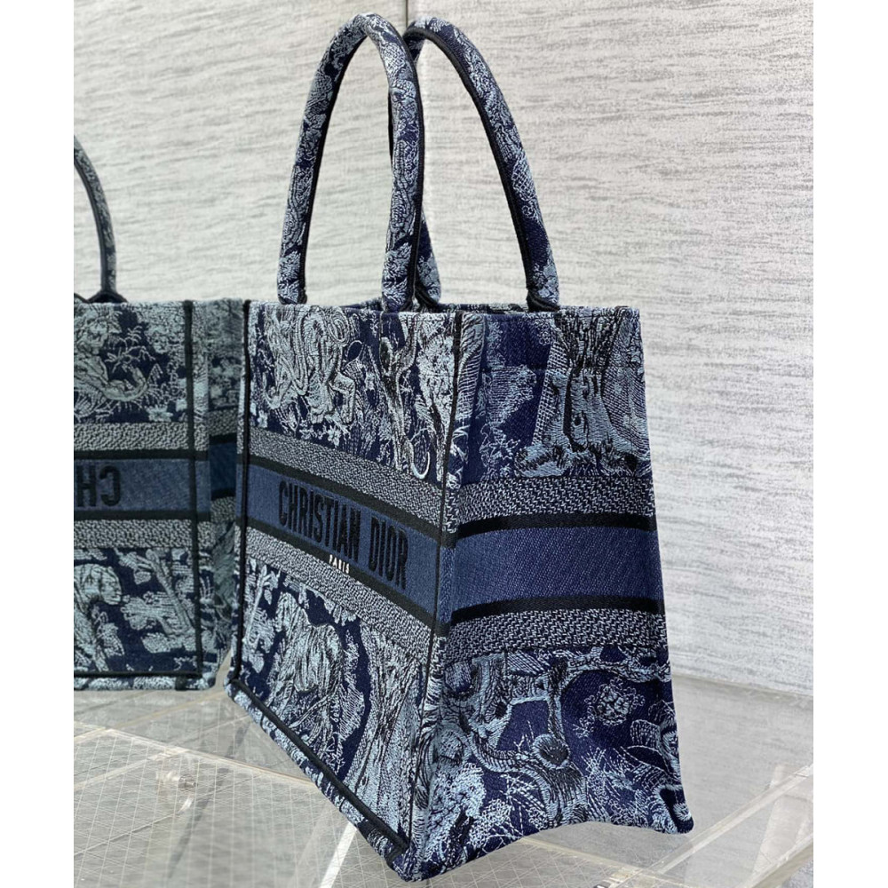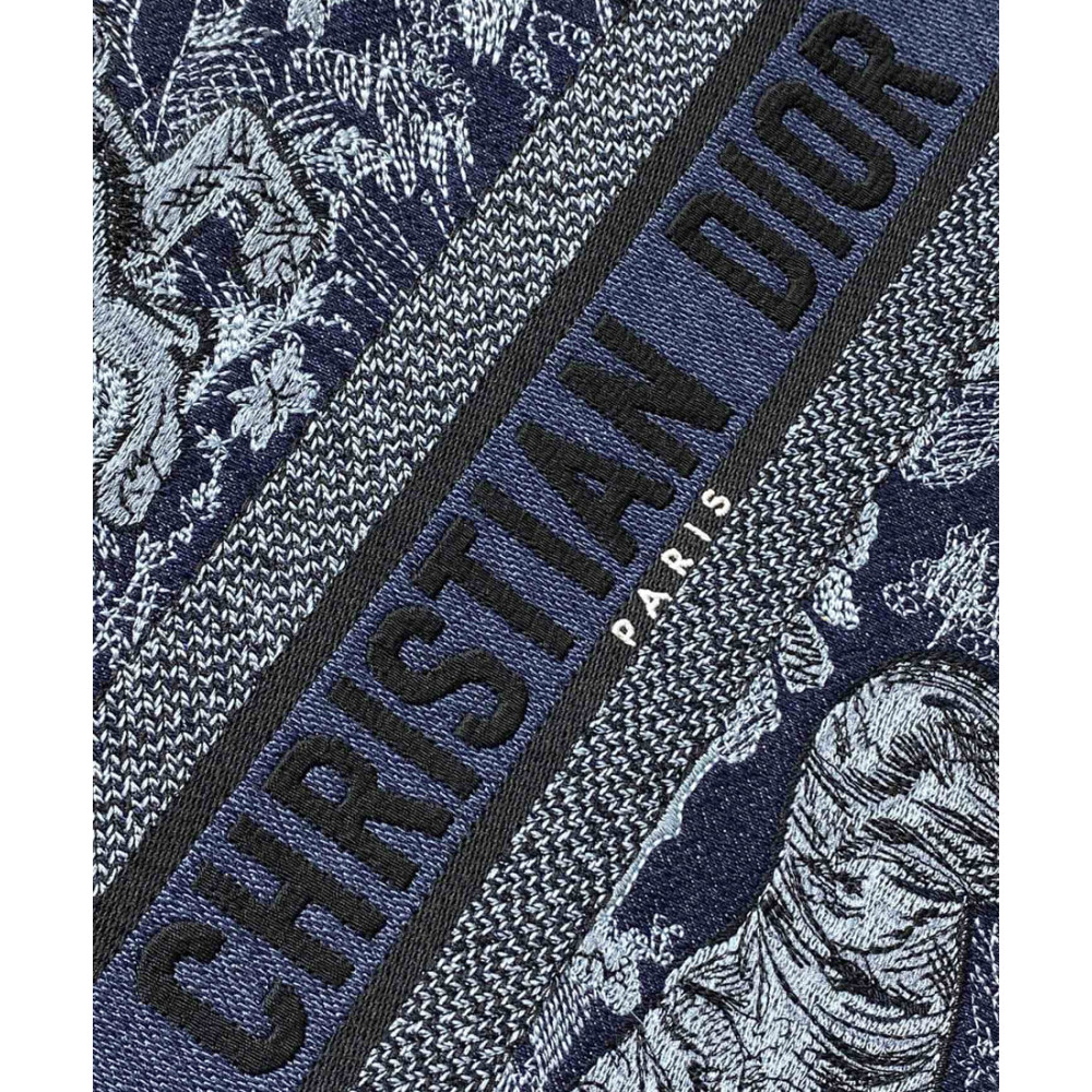 Introduced by Maria Grazia Chiuri, Creative Director of Christian Dior, the Dior Book Tote has become a staple of the Dior aesthetic. Designed to hold all the daily essentials, the style is fully embroidered with the denim blue Toile de Jouy motif enhanced by the Christian Dior Paris signature on the front. The medium tote exemplifies the House’s signature savoir-faire and may be carried by hand or worn over the shoulder.