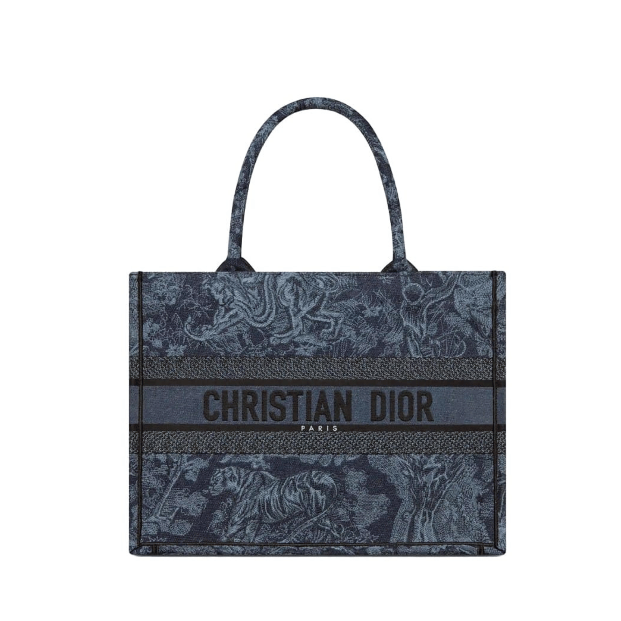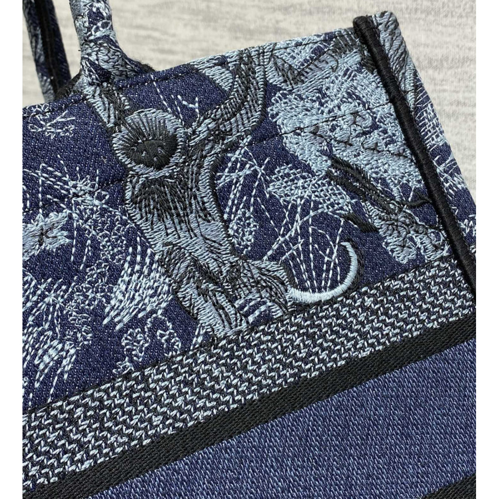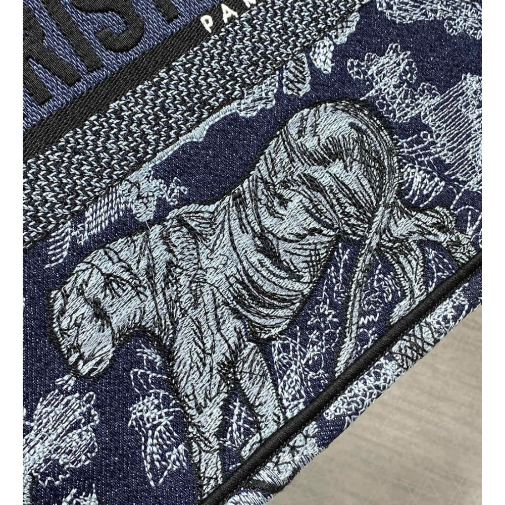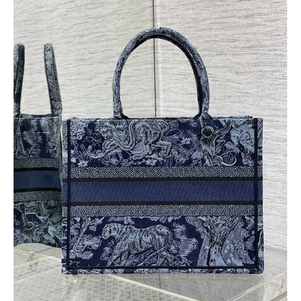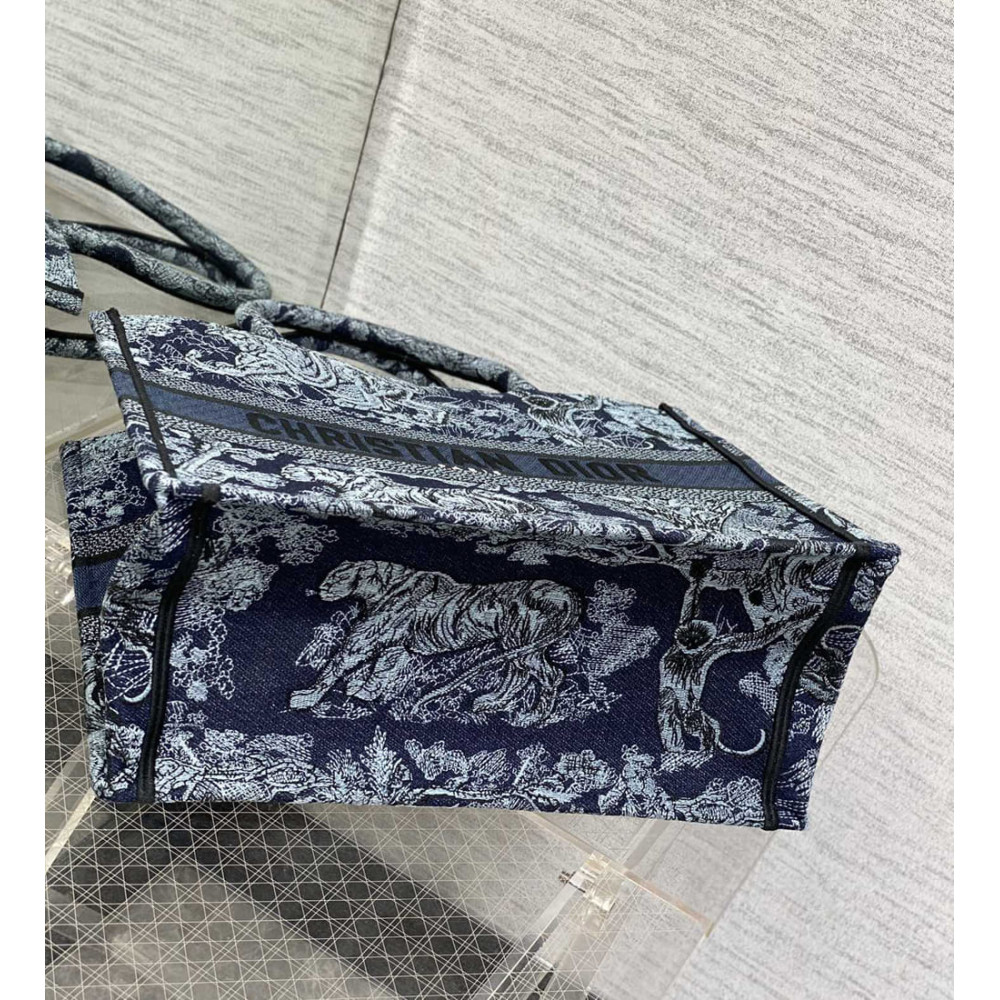 Introduced by Maria Grazia Chiuri, Creative Director of Christian Dior, the Dior Book Tote has become a staple of the Dior aesthetic. Designed to hold all the daily essentials, the style is fully embroidered with the denim blue Toile de Jouy motif enhanced by the Christian Dior Paris signature on the front. The medium tote exemplifies the House’s signature savoir-faire and may be carried by hand or worn over the shoulder.