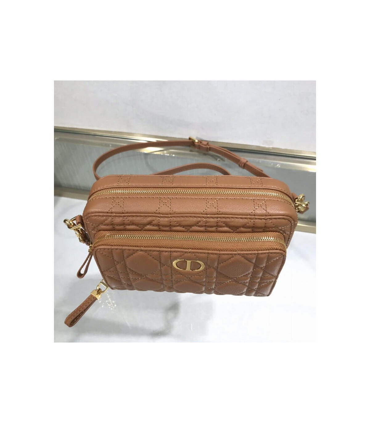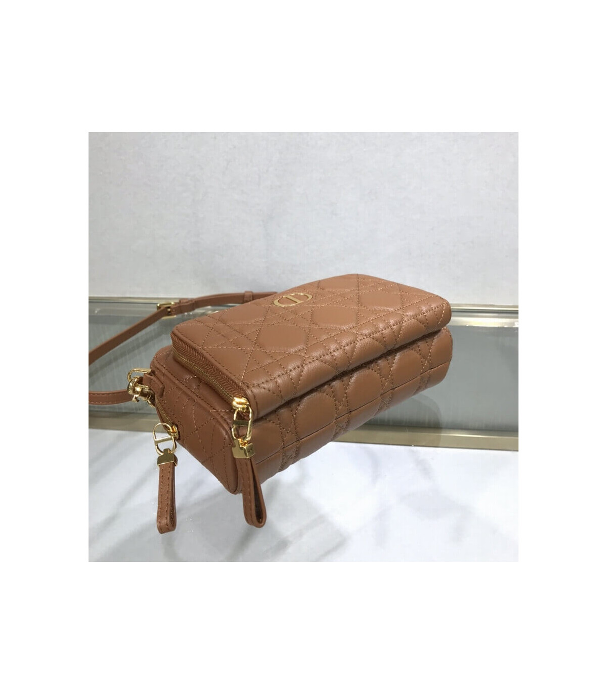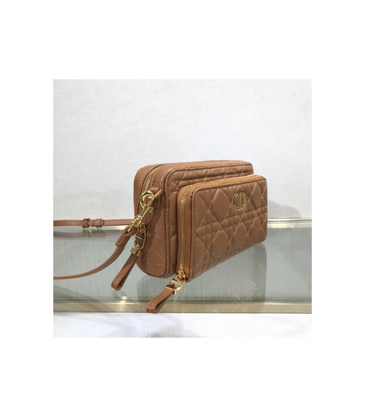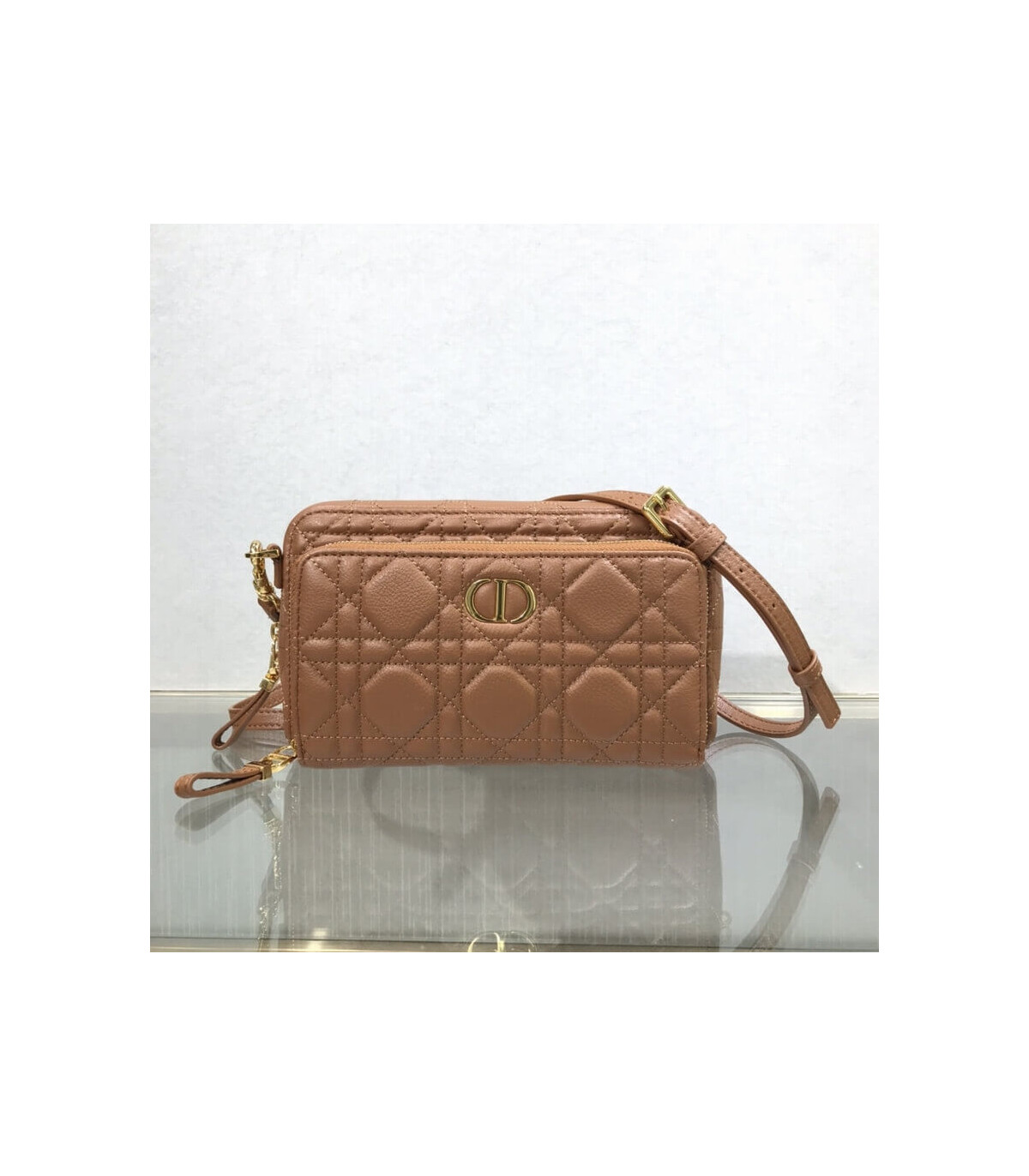 The Dior Caro double pouch, both spacious and compact, is ideal for daily life. Crafted in black calfskin, it is embellished with hallmark Cannage topstitching and features two large compartments, a zipped pocket and two card slots to hold all the essentials. The removable and adjustable strap allows it to be carried by hand, worn over the shoulder or crossbody.