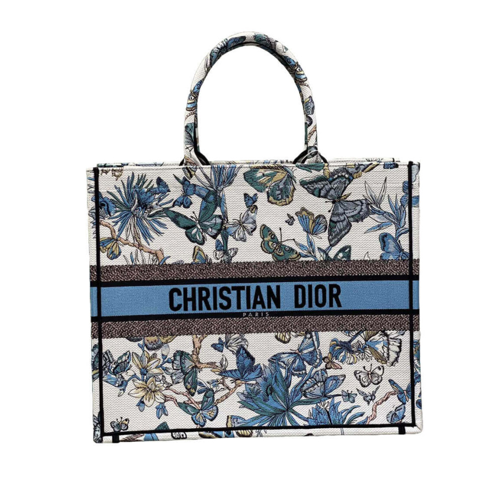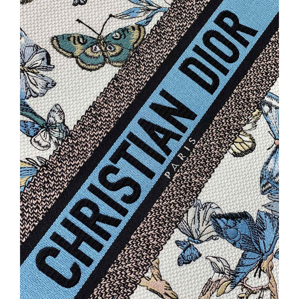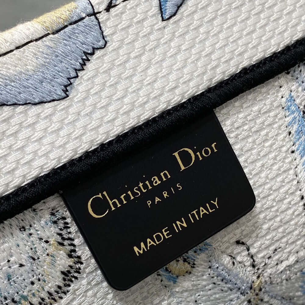 The Dior Book Tote is a House classic designed by Maria Grazia Chiuri, Creative Director of Christian Dior. Created to hold all the daily essentials, the style is fully embroidered with a white and pastel midnight blue Toile de Jouy Mexico motif by Pietro Ruffo, showcasing butterflies and traditional Mexican flowers in a concert of colors. Adorned with the Christian Dior Paris signature on the front, the large tote exemplifies the House’s signature savoir-faire and may be carried by hand or worn over the shoulder.