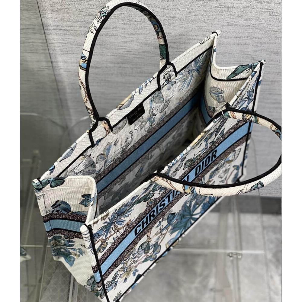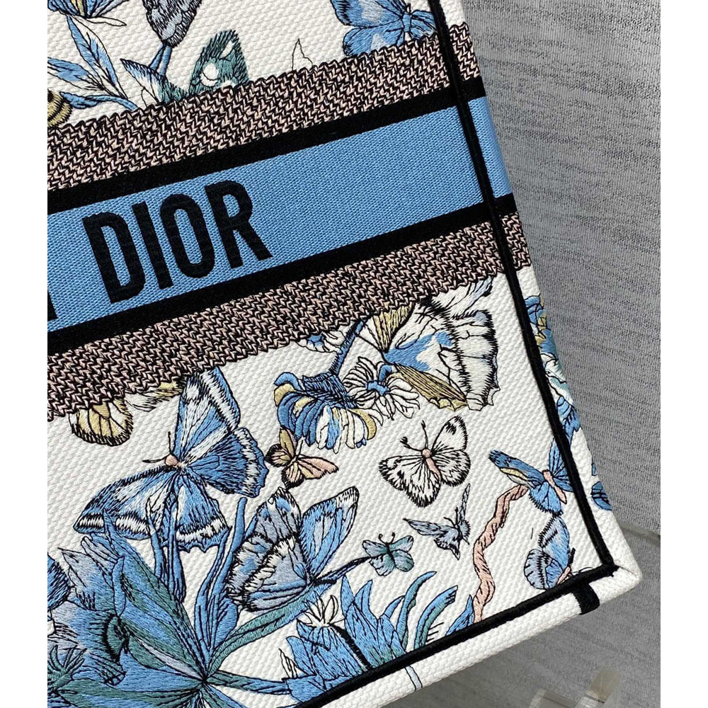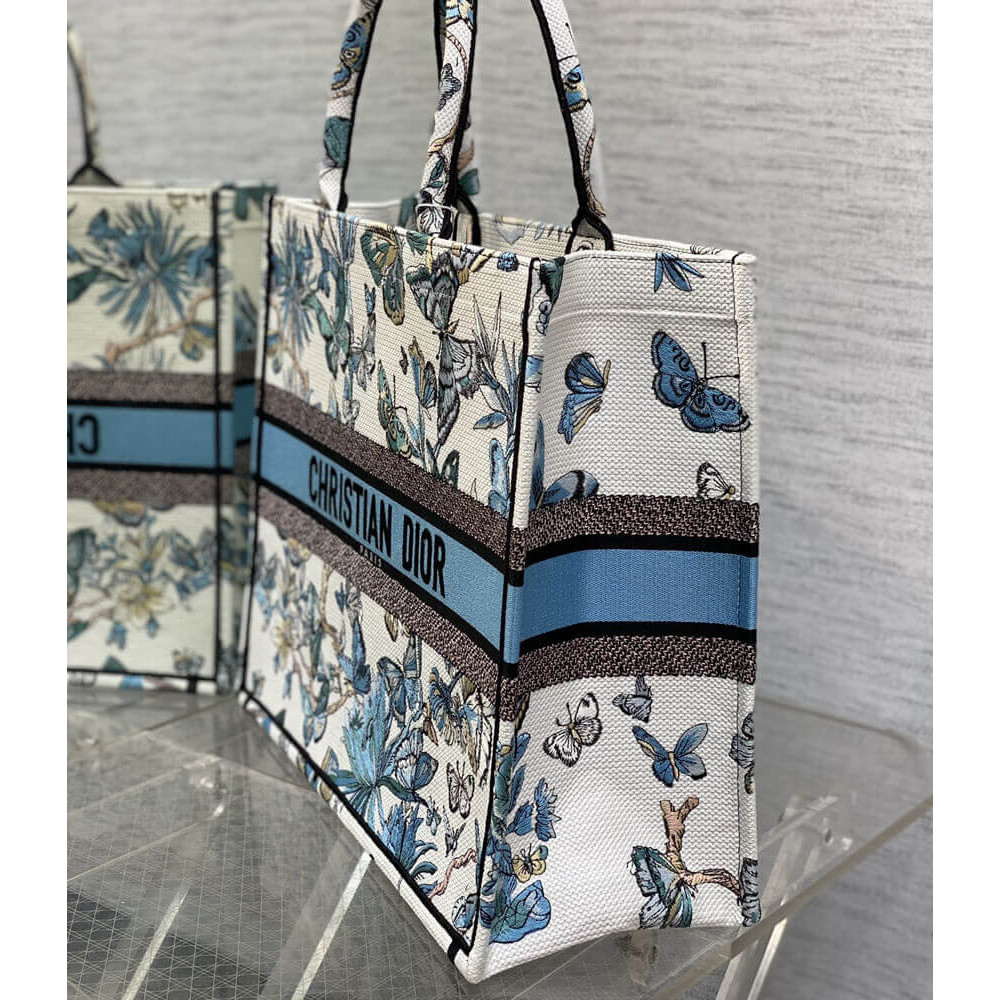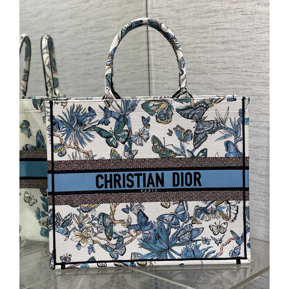 The Dior Book Tote is a House classic designed by Maria Grazia Chiuri, Creative Director of Christian Dior. Created to hold all the daily essentials, the style is fully embroidered with a white and pastel midnight blue Toile de Jouy Mexico motif by Pietro Ruffo, showcasing butterflies and traditional Mexican flowers in a concert of colors. Adorned with the Christian Dior Paris signature on the front, the large tote exemplifies the House’s signature savoir-faire and may be carried by hand or worn over the shoulder.