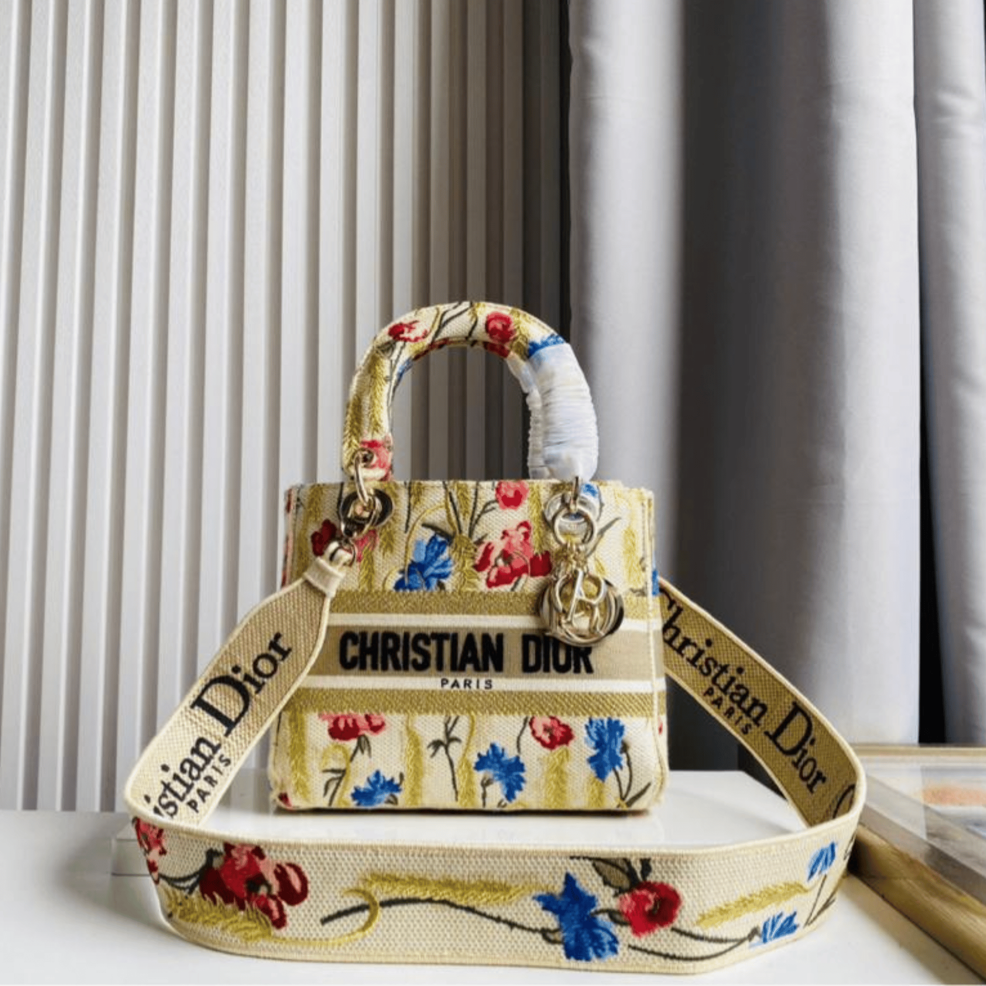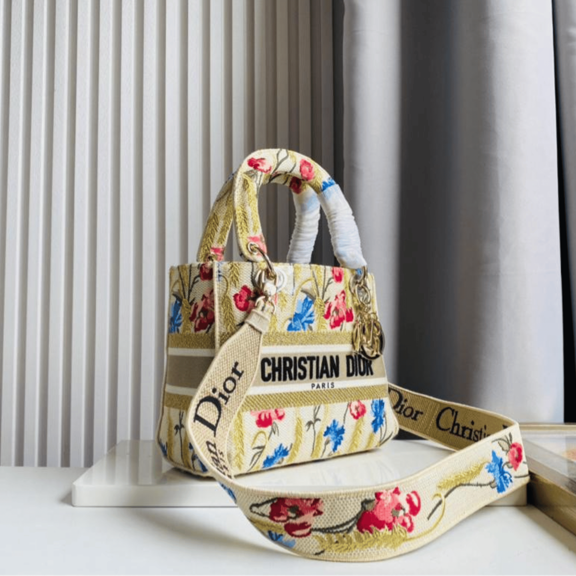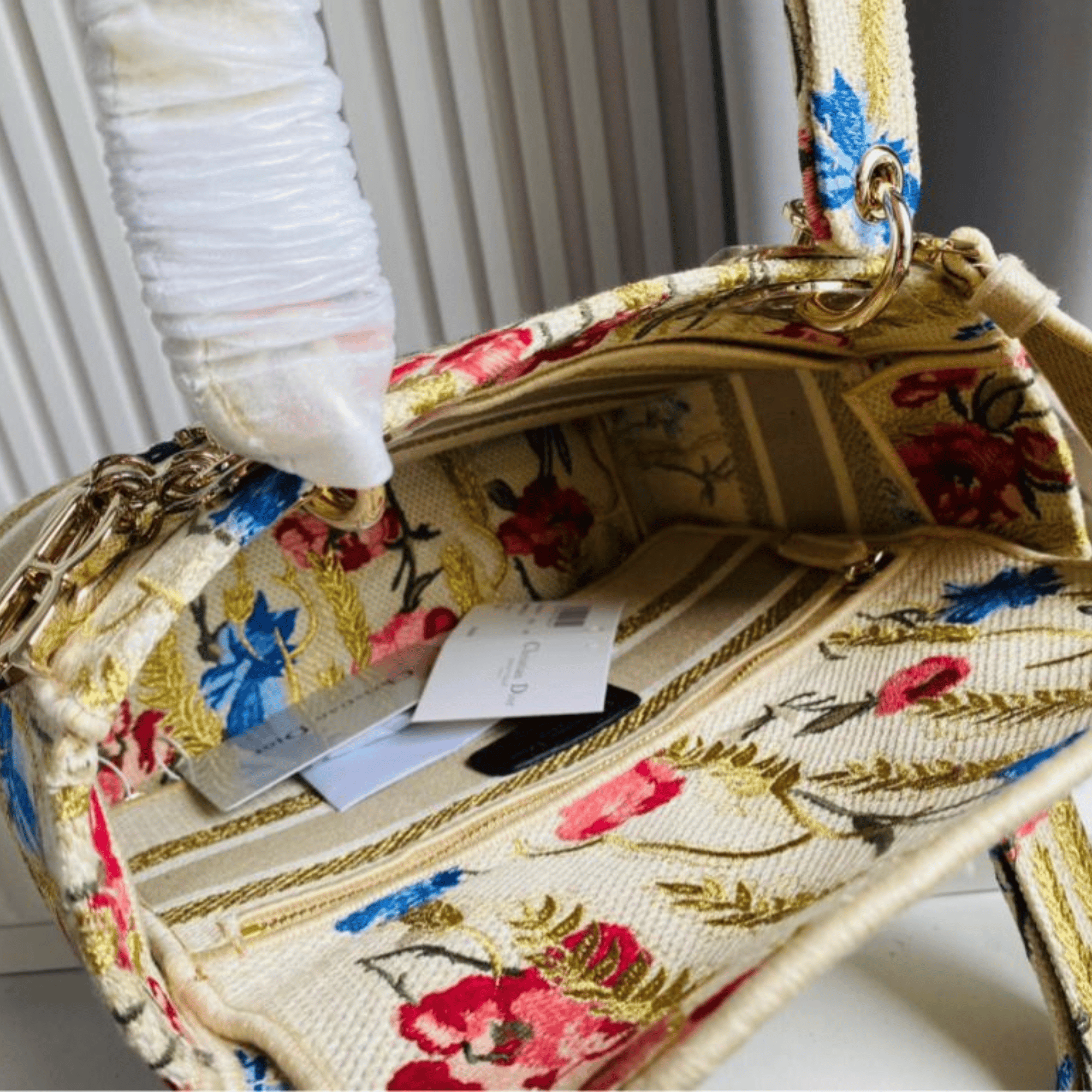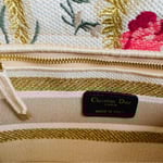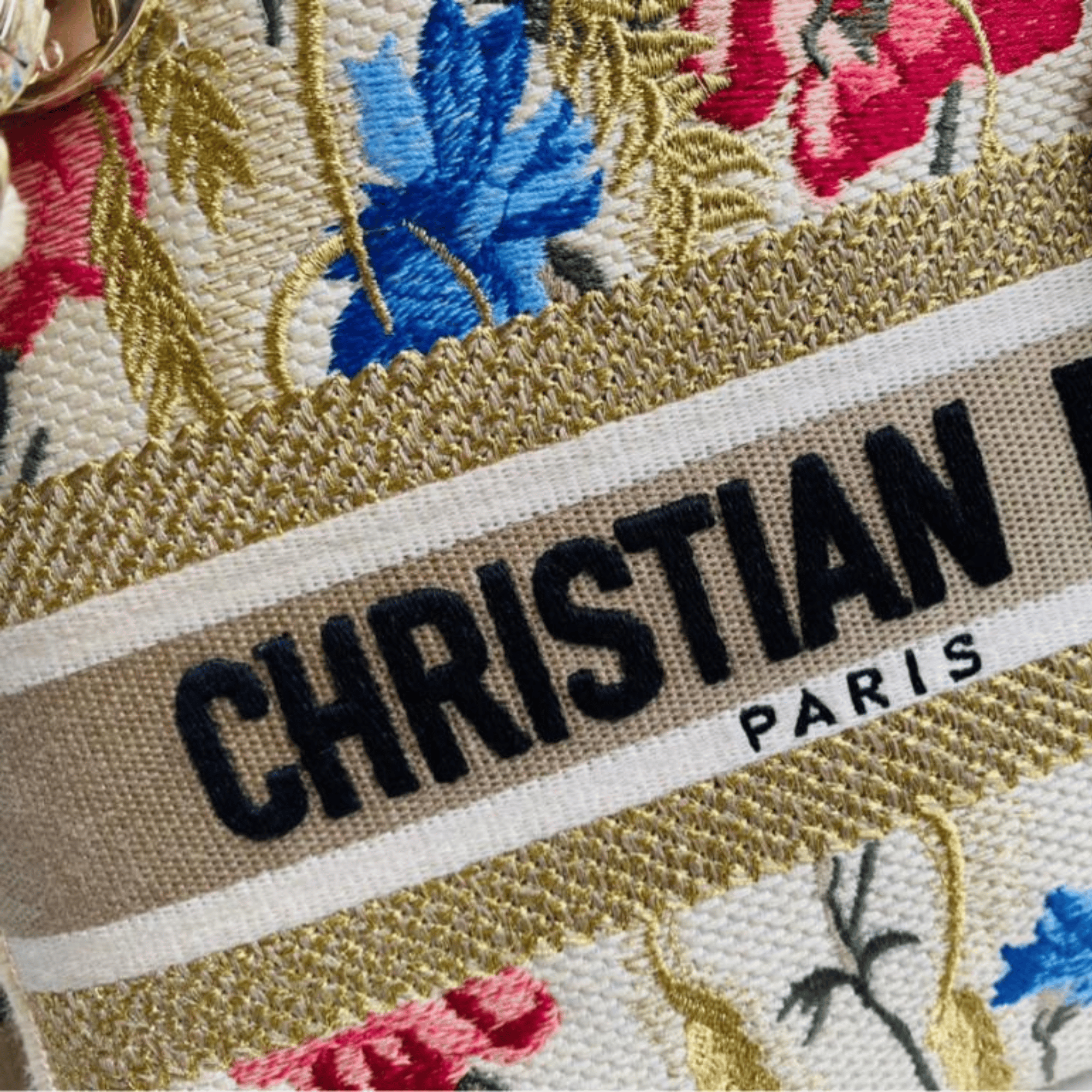 The Lady Dior handbag epitomizes Dior’s vision of elegance and beauty. Refined and sophisticated, the timeless yet relevant beige style is embroidered with the multicolor Dior Hibiscus motif accented with metallic thread, which is inspired by bucolic Apulian landscapes, one of the collection’s central themes. Along with the ‘Christian Dior’ signature, it features thick pale gold-finish metal ‘D.I.O.R.’ charms as well as a removable leather shoulder strap. The medium bag can be paired with the collection’s other Dior Hibiscus creations.