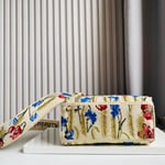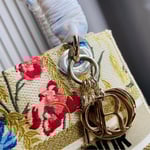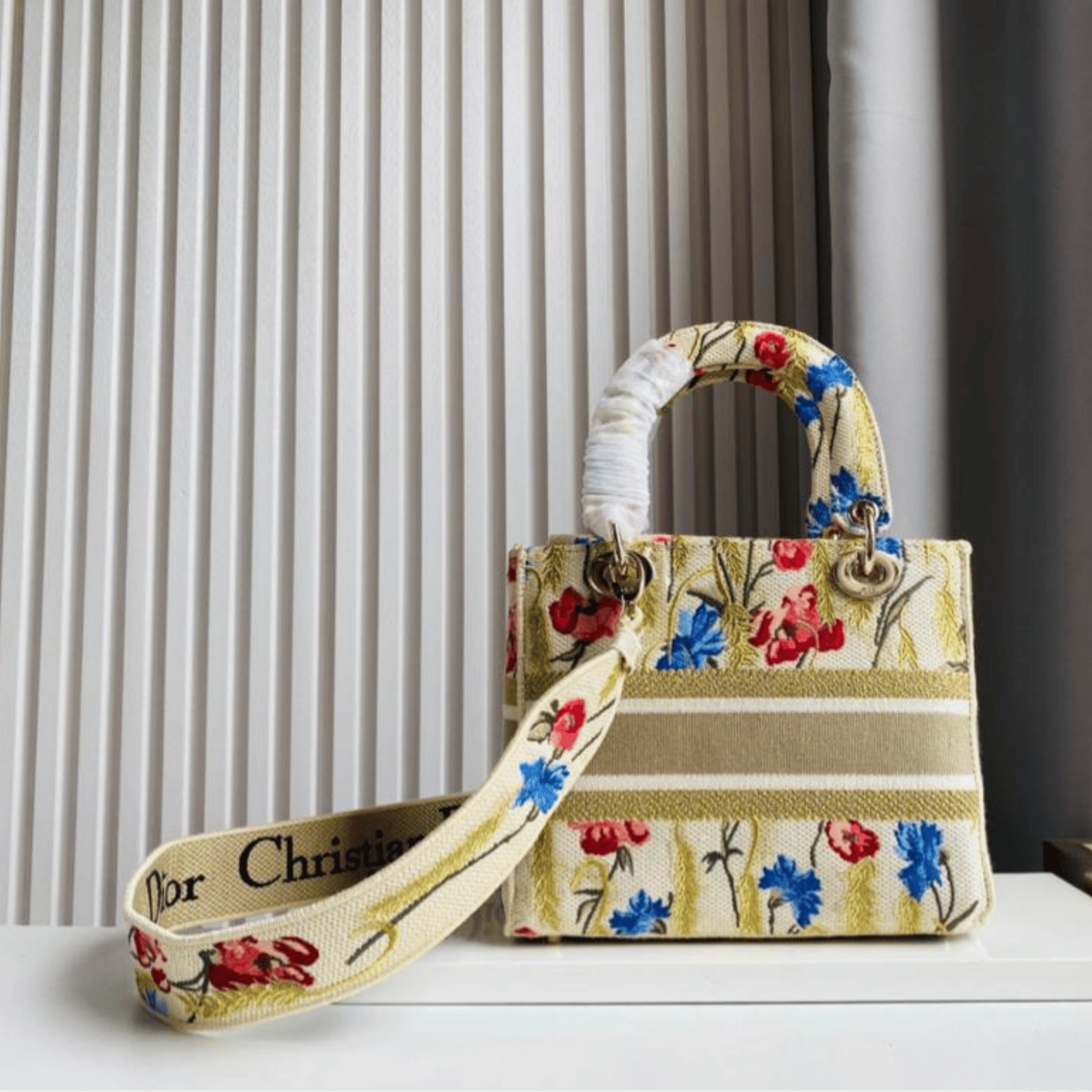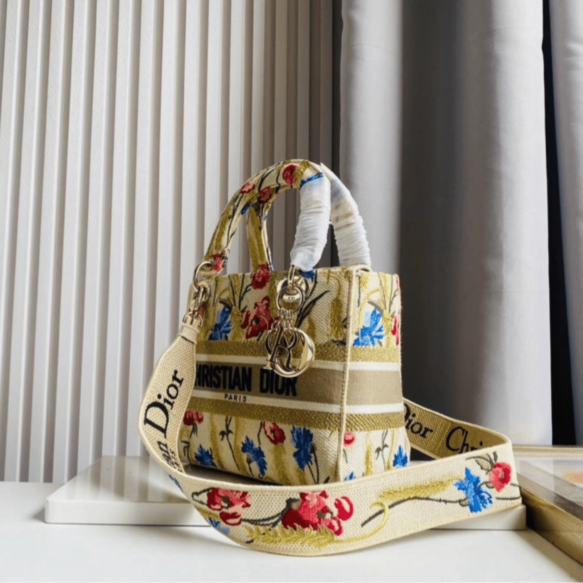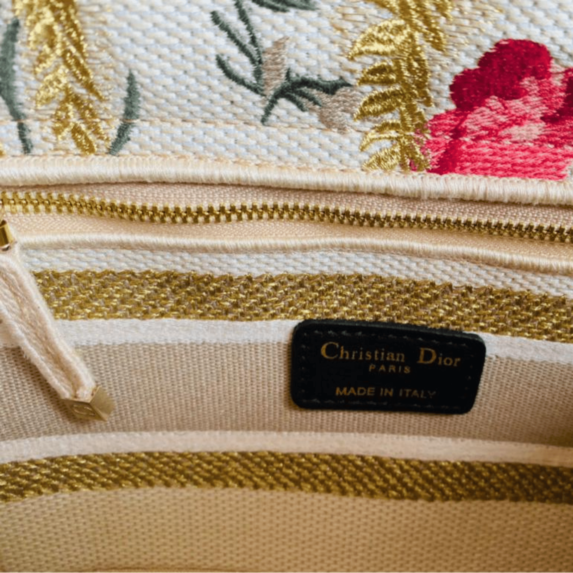 The Lady Dior handbag epitomizes Dior’s vision of elegance and beauty. Refined and sophisticated, the timeless yet relevant beige style is embroidered with the multicolor Dior Hibiscus motif accented with metallic thread, which is inspired by bucolic Apulian landscapes, one of the collection’s central themes. Along with the ‘Christian Dior’ signature, it features thick pale gold-finish metal ‘D.I.O.R.’ charms as well as a removable leather shoulder strap. The medium bag can be paired with the collection’s other Dior Hibiscus creations.