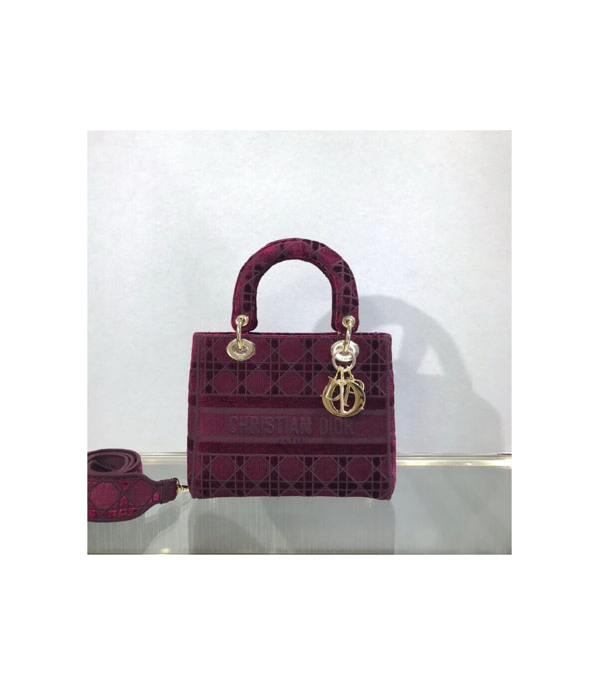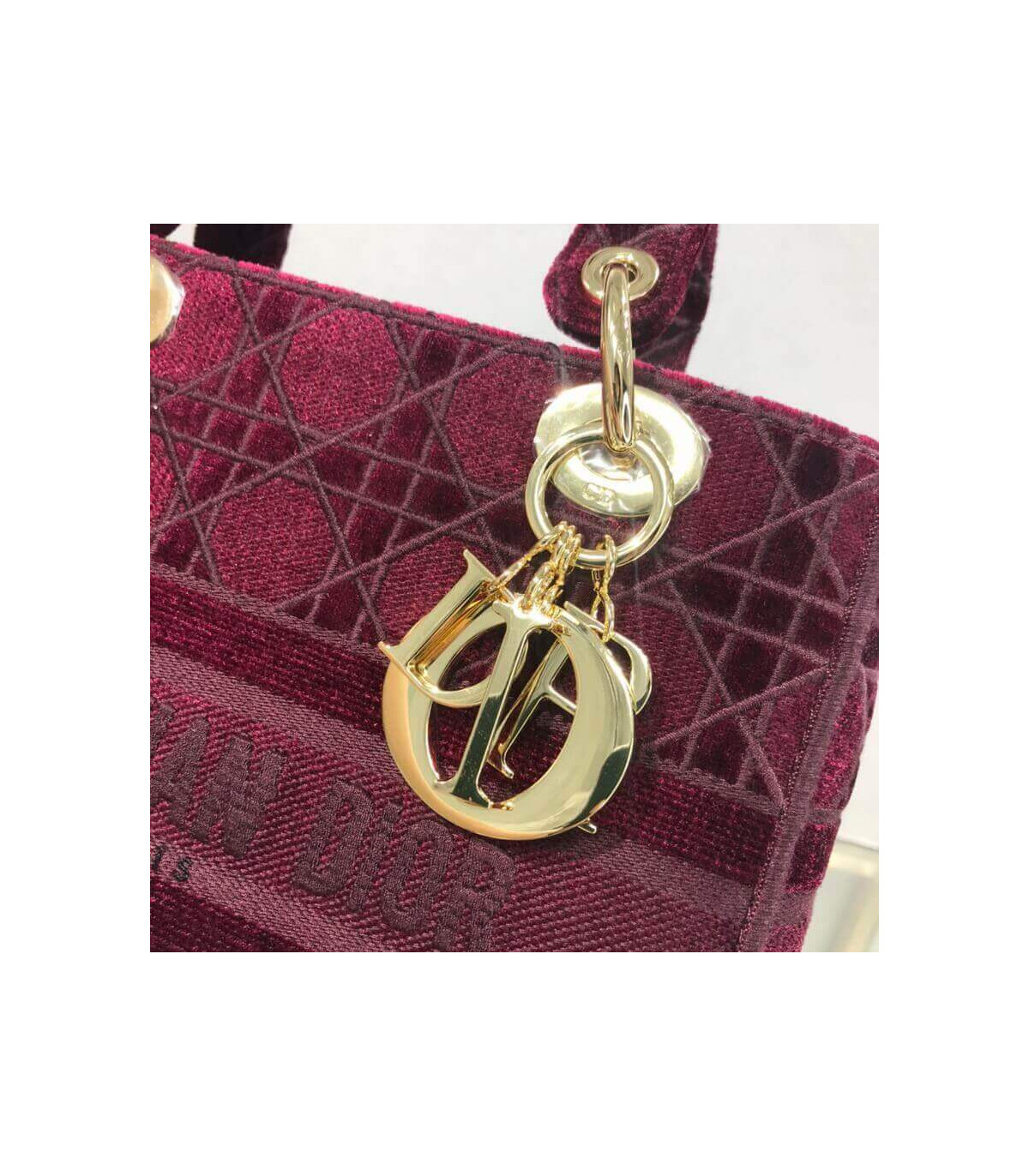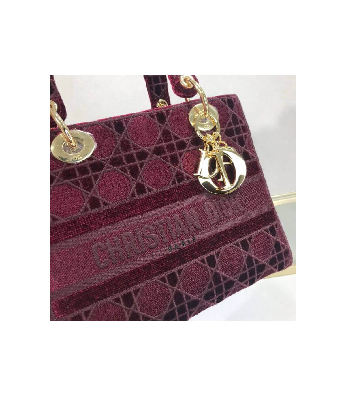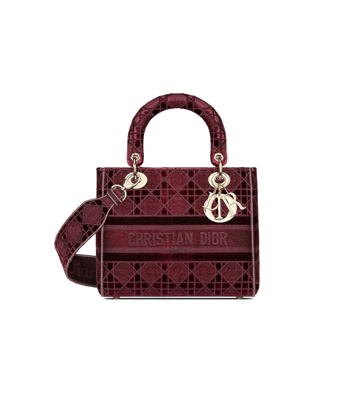 The Lady D-Lite handbag epitomizes Dior’s vision of elegance and beauty. A sleek and feminine blue velvet bag that is fully embroidered with the Cannage motif in contrasting matte cotton thread and features a tonal ‘Christian Dior’ signature on the front. The pale gold signature ‘D. I. O. R.’ charms embellish the classic silhouette. This medium style has a large, fully embroidered and removable shoulder strap and can be worn many ways.