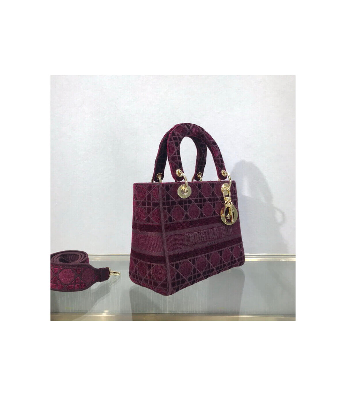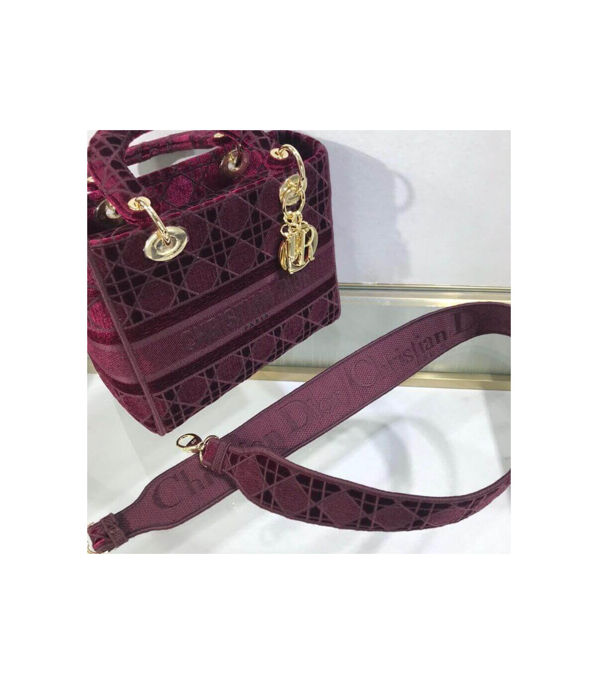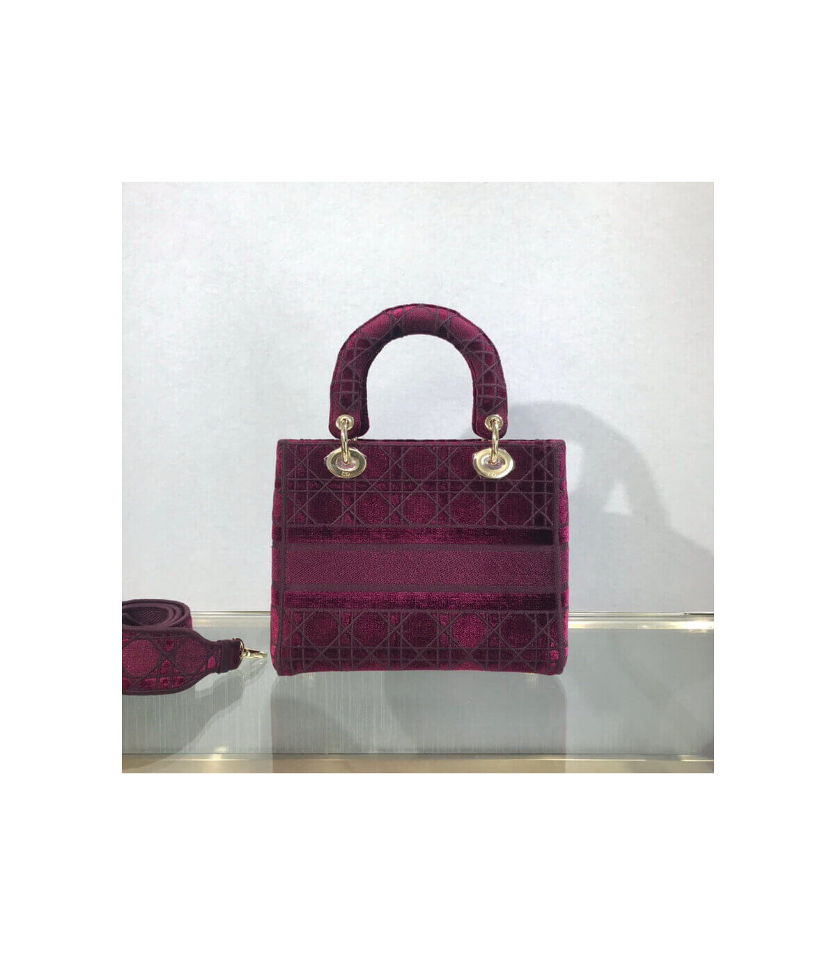 The Lady D-Lite handbag epitomizes Dior’s vision of elegance and beauty. A sleek and feminine blue velvet bag that is fully embroidered with the Cannage motif in contrasting matte cotton thread and features a tonal ‘Christian Dior’ signature on the front. The pale gold signature ‘D. I. O. R.’ charms embellish the classic silhouette. This medium style has a large, fully embroidered and removable shoulder strap and can be worn many ways.