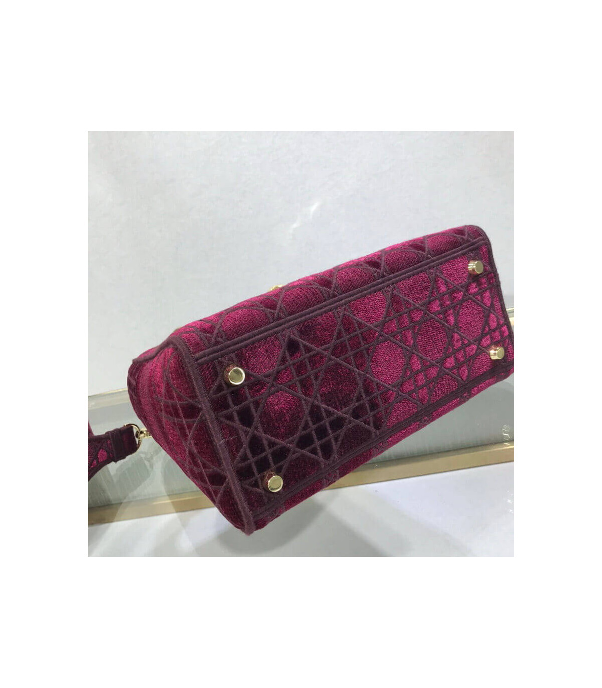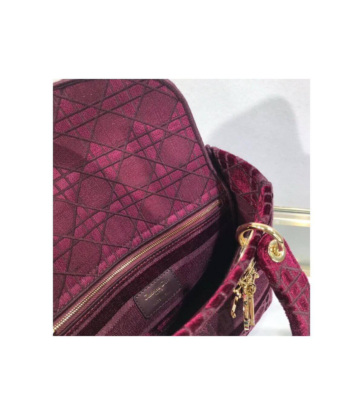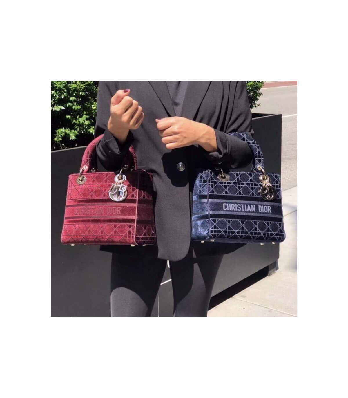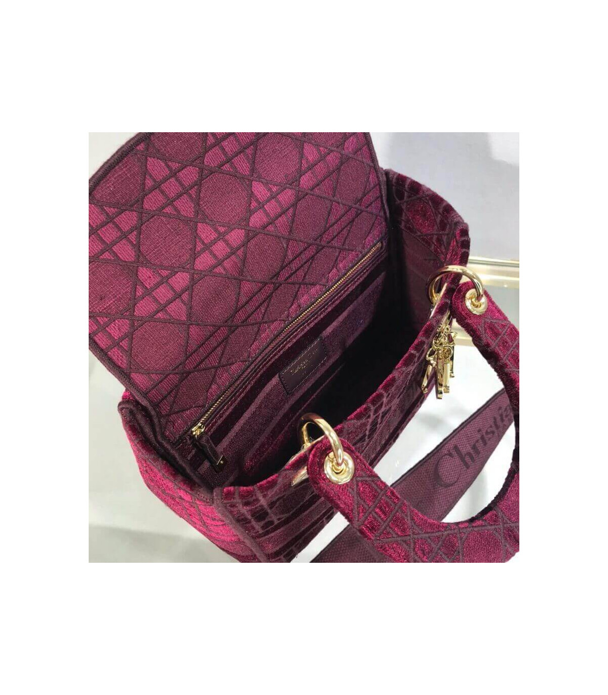 The Lady D-Lite handbag epitomizes Dior’s vision of elegance and beauty. A sleek and feminine blue velvet bag that is fully embroidered with the Cannage motif in contrasting matte cotton thread and features a tonal ‘Christian Dior’ signature on the front. The pale gold signature ‘D. I. O. R.’ charms embellish the classic silhouette. This medium style has a large, fully embroidered and removable shoulder strap and can be worn many ways.