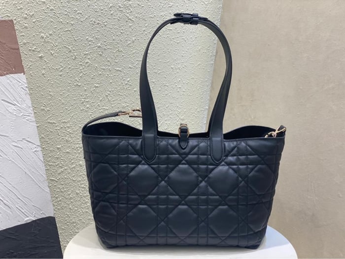 A sophisticated black quilted leather tote bag featuring elegant top handles, gold-tone Dior charm accents, and a matching detachable pouch for added versatility.