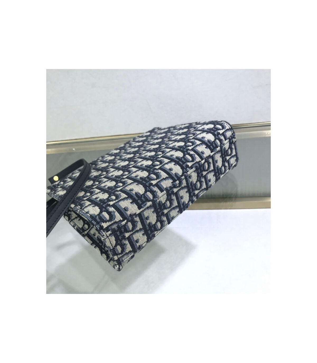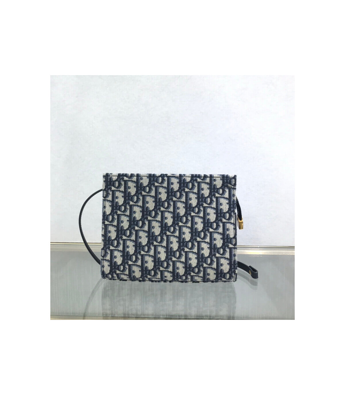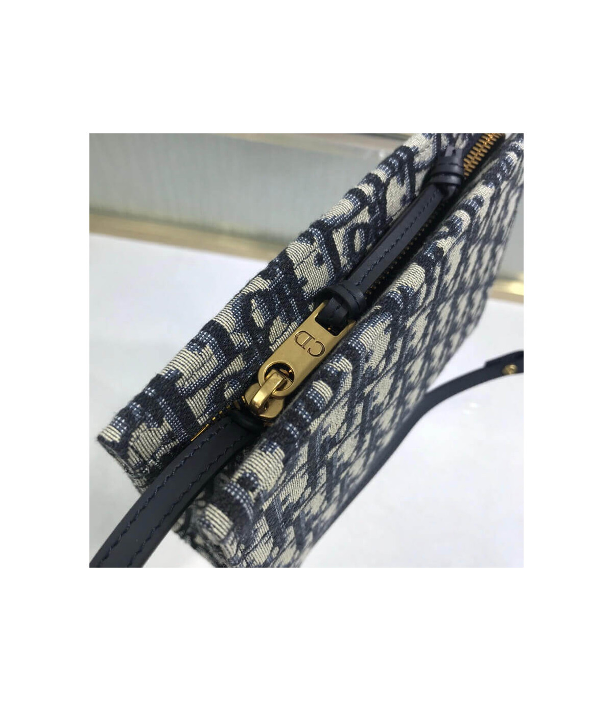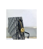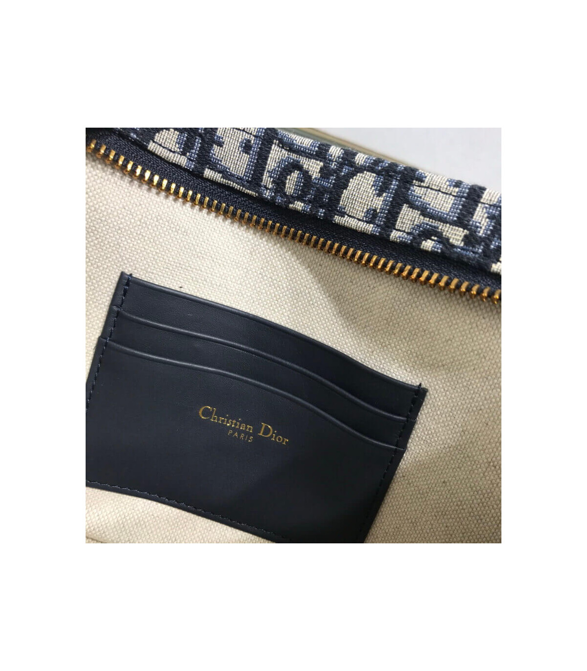 This bag is finely crafted of navy blue on beige Dior monogram canvas. The bag features a leather shoulder strap and polished aged gold hardware. The top zipper opens to a beige fabric interior with card slots.