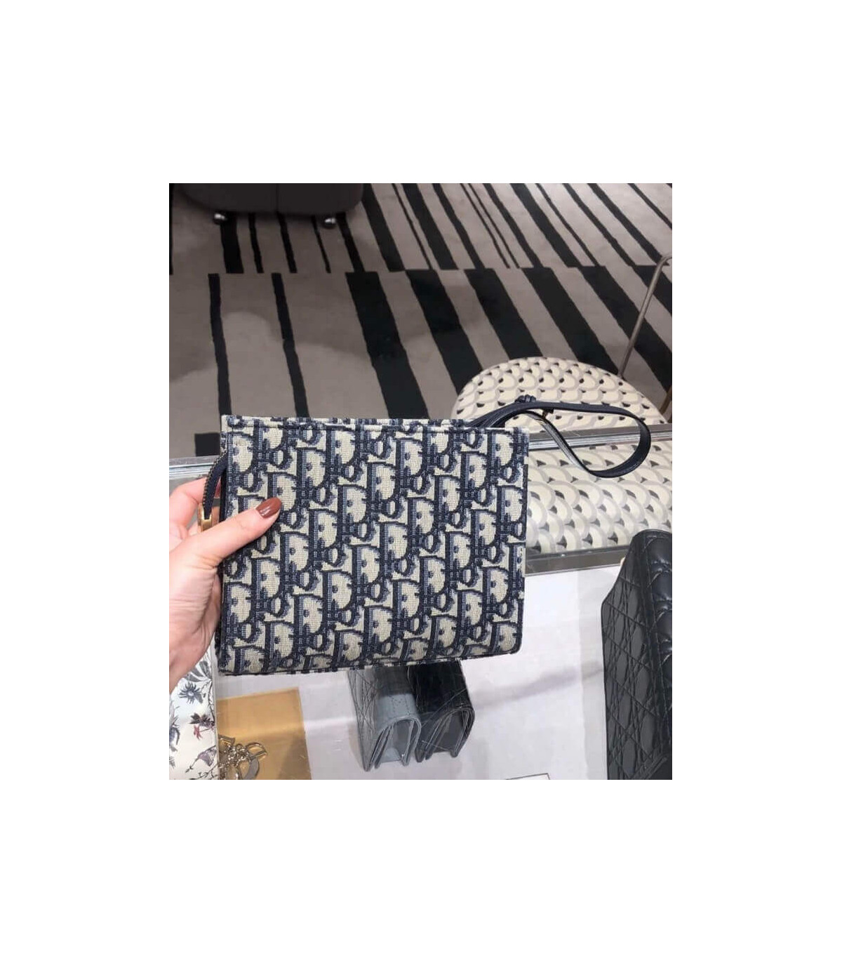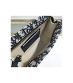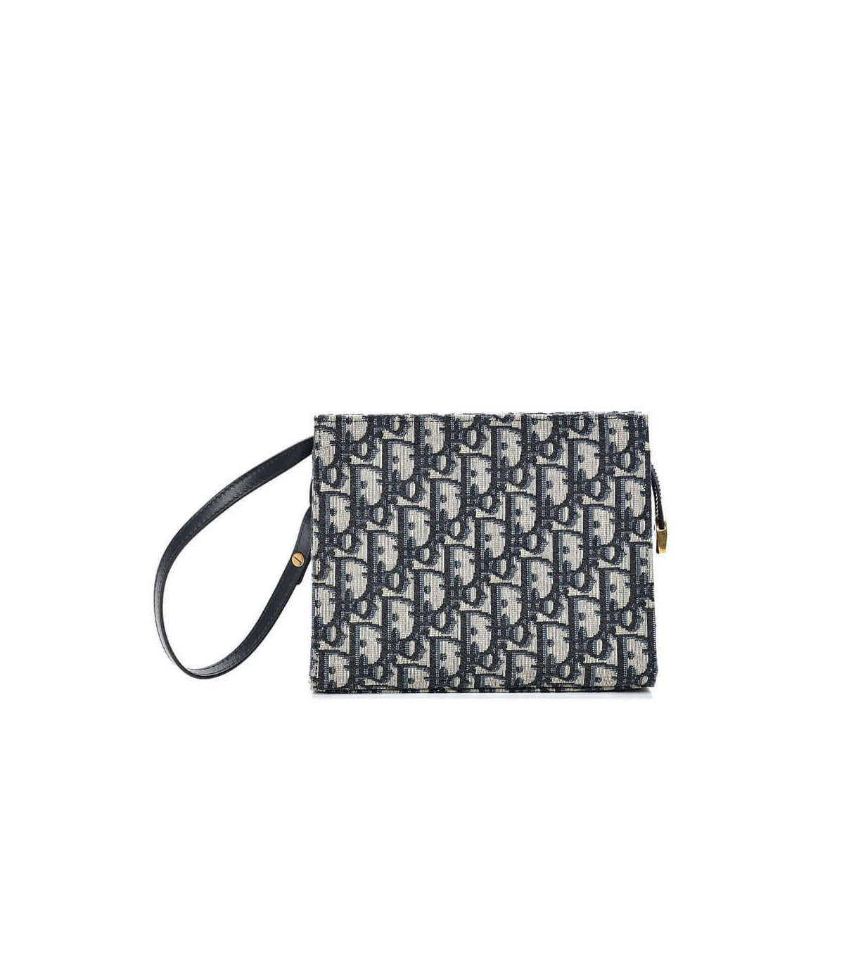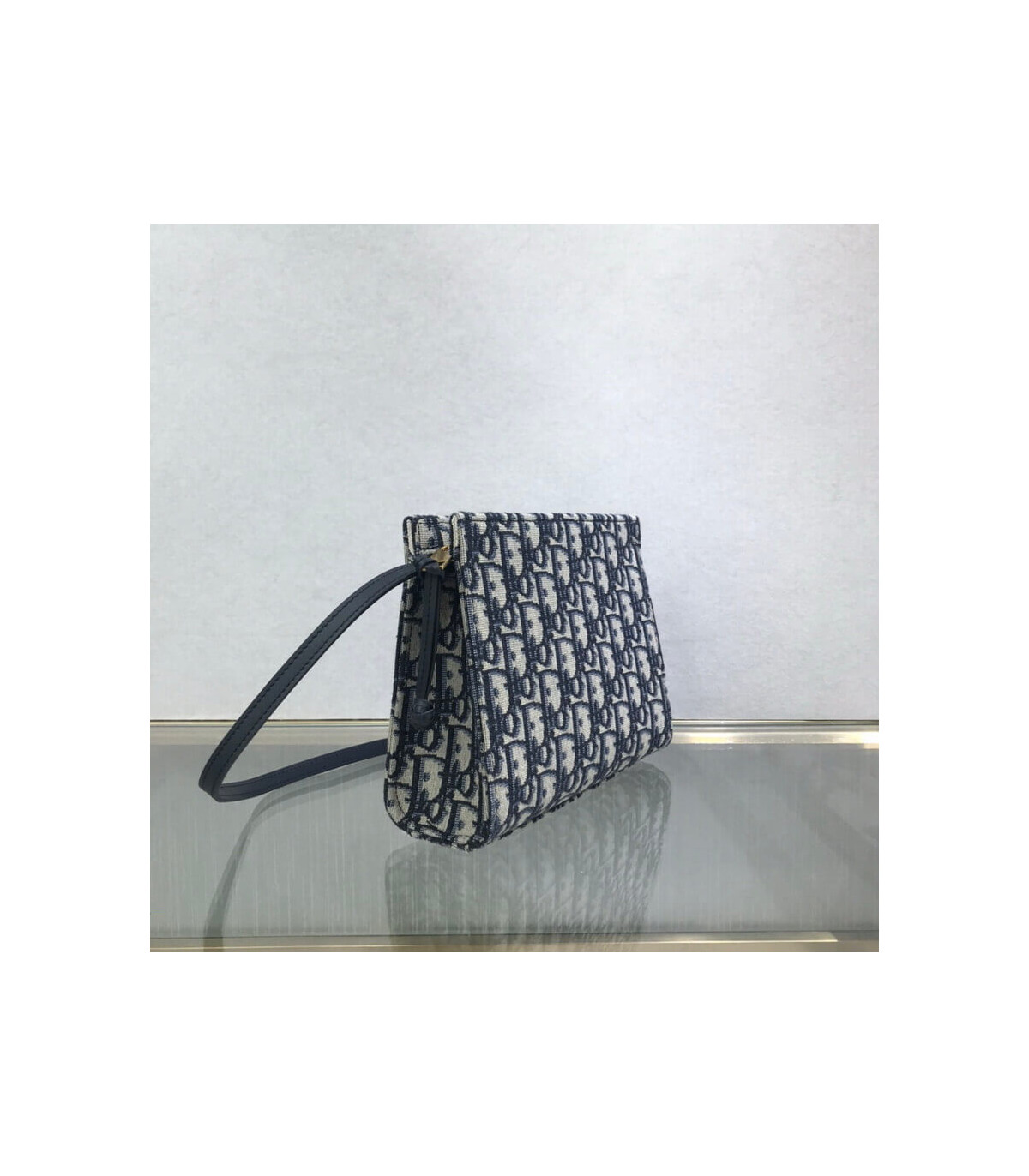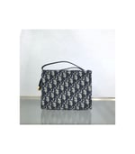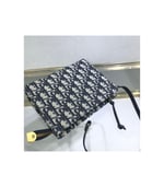 This bag is finely crafted of navy blue on beige Dior monogram canvas. The bag features a leather shoulder strap and polished aged gold hardware. The top zipper opens to a beige fabric interior with card slots.
