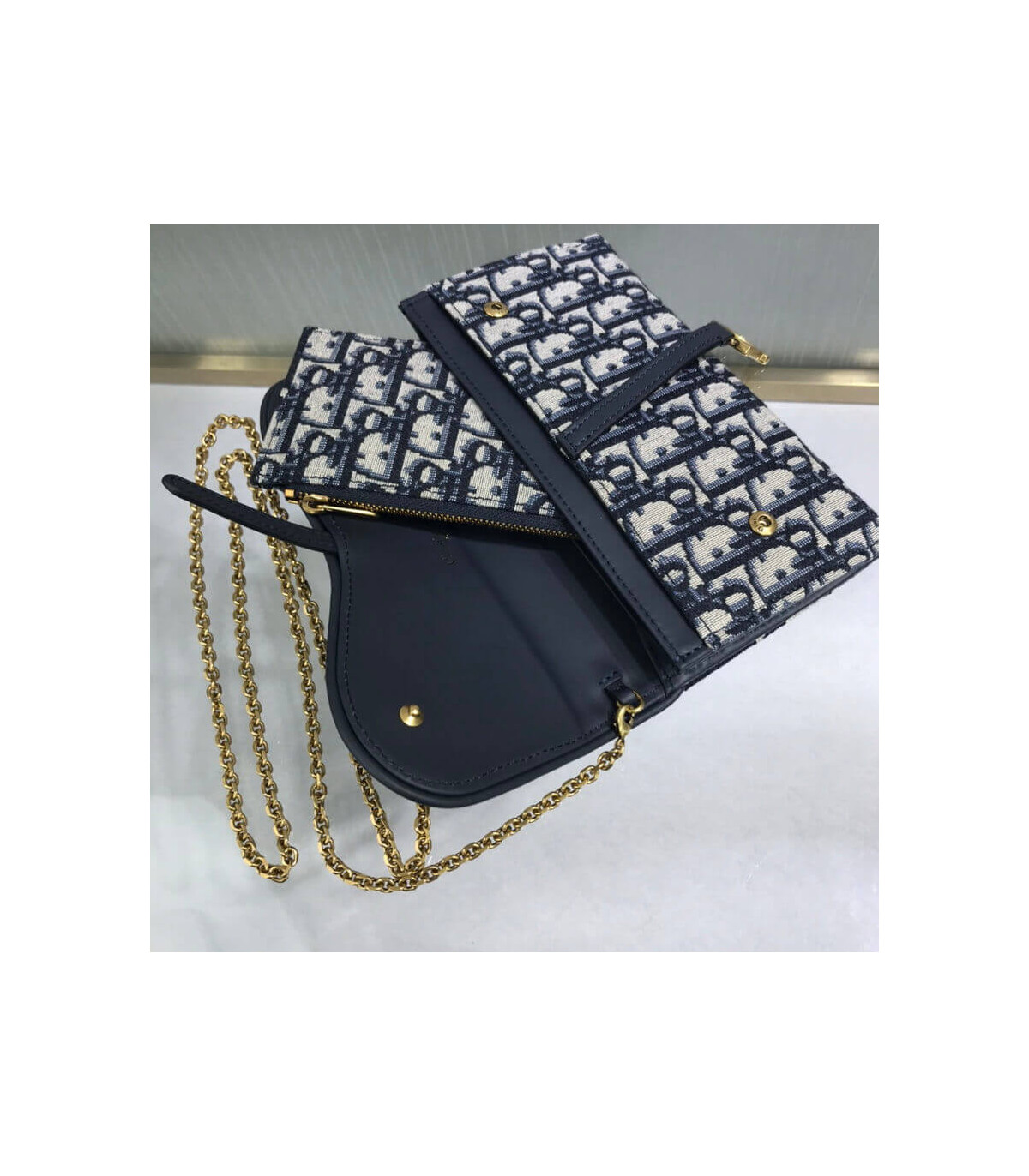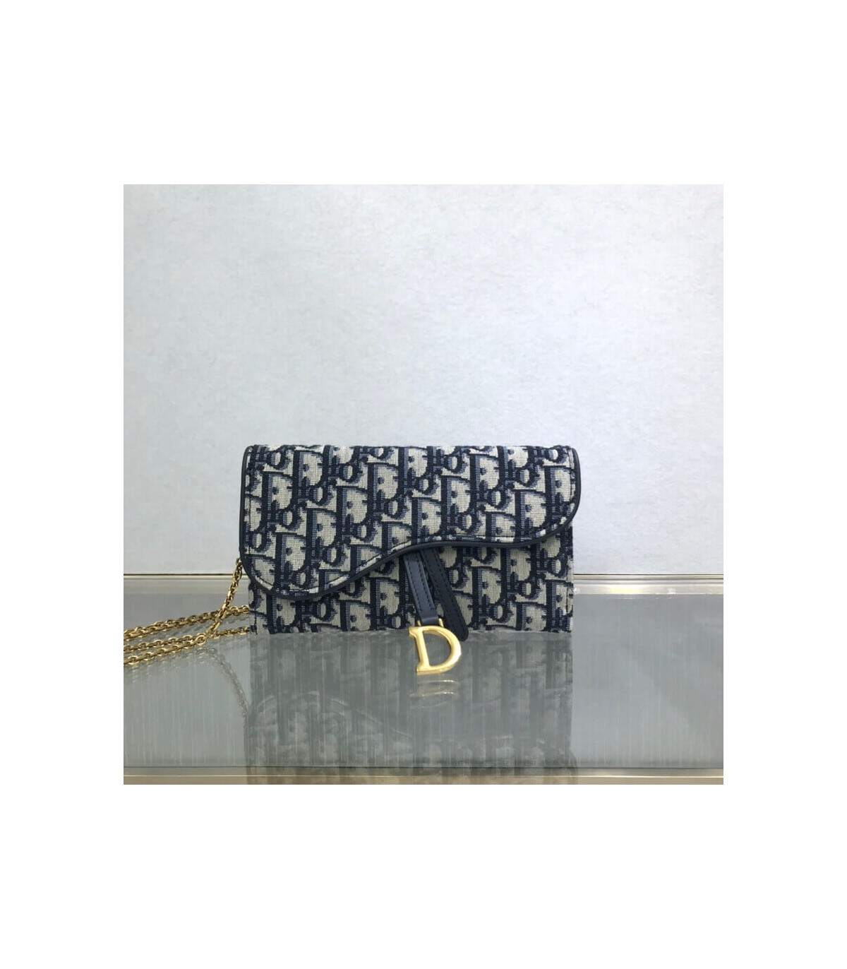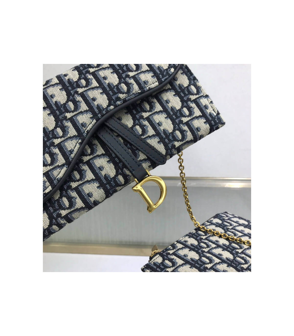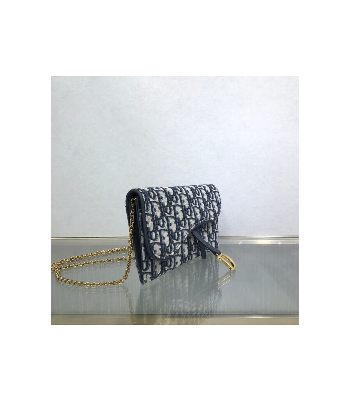 The Saddle wallet, crafted in blue Dior Oblique jacquard, is a hybrid item with a modern and streamlined design. The style is embellished with an asymmetric flap and an antique gold-finish metal ‘D’ stirrup. Thanks to its removable chain, the wallet can be worn over the shoulder, crossbody or carried by hand.