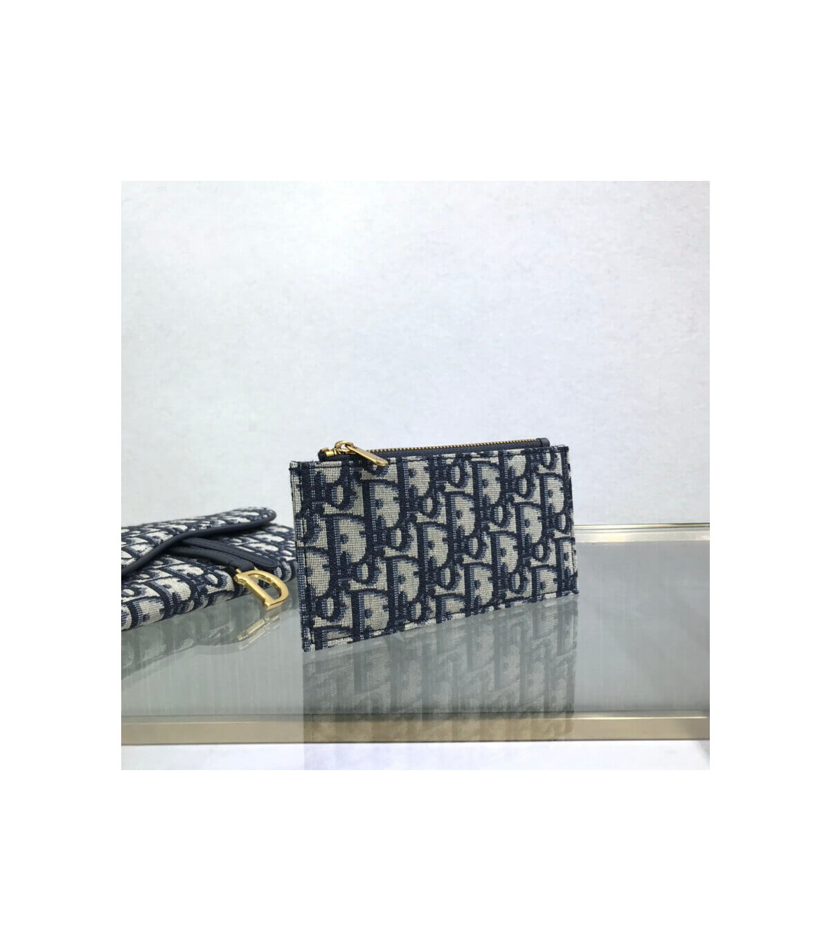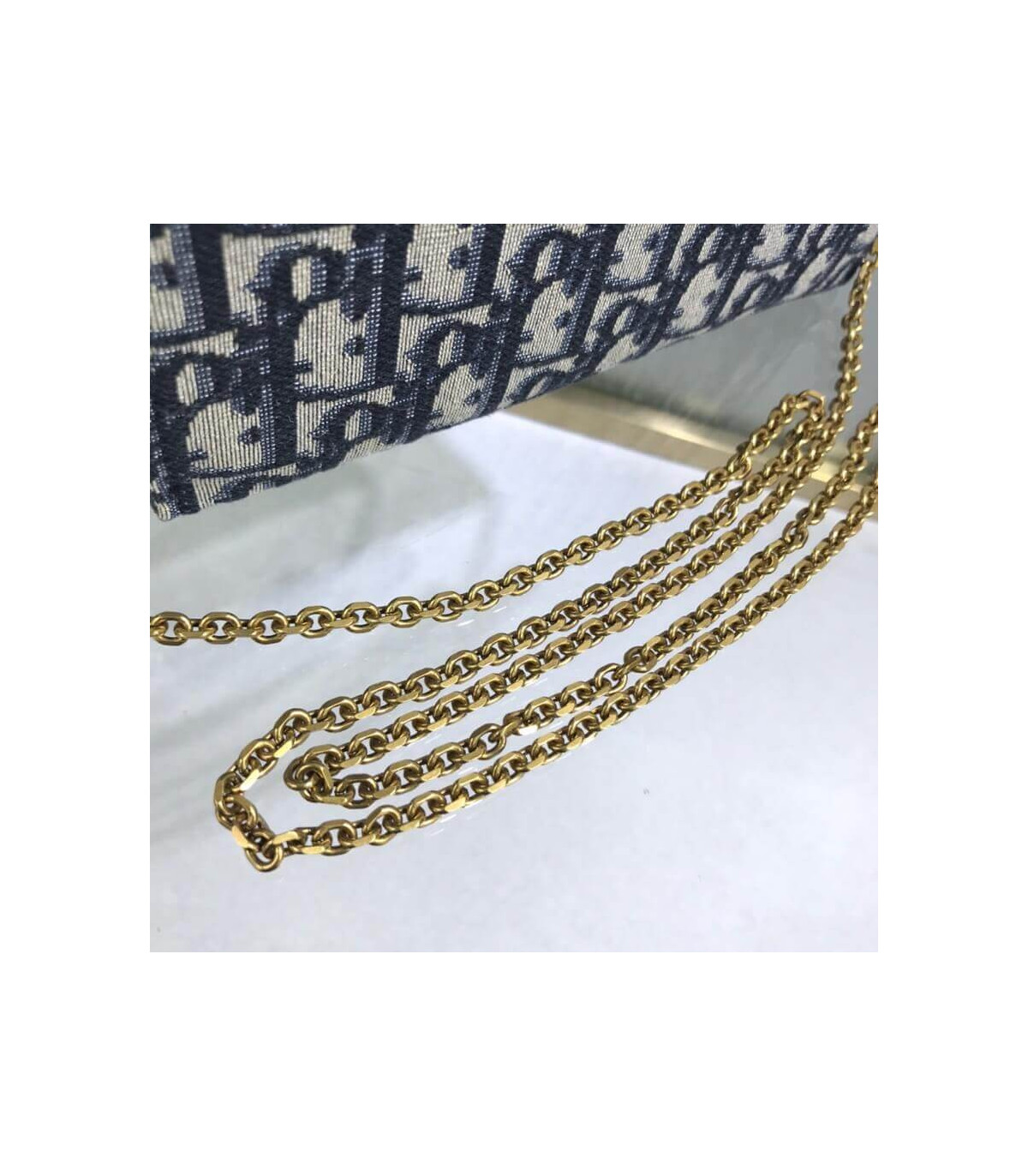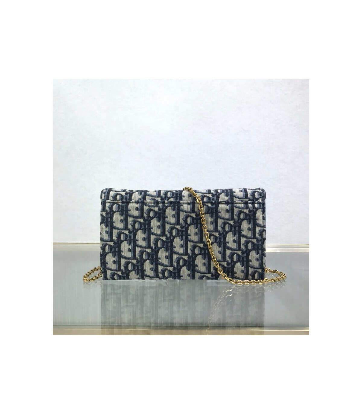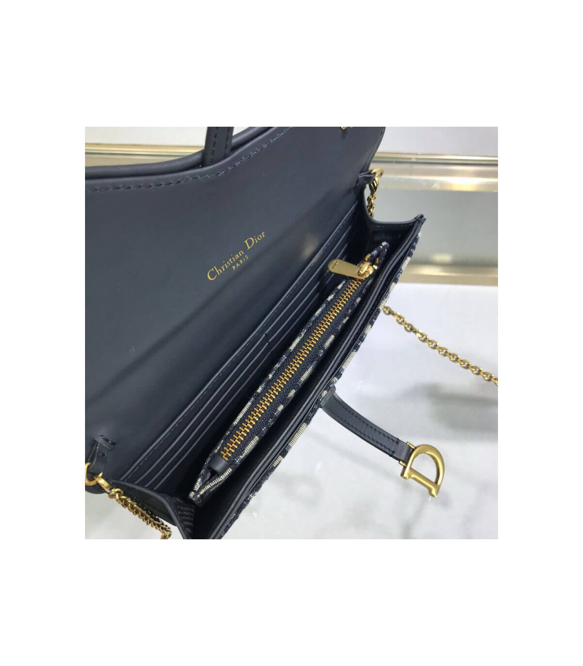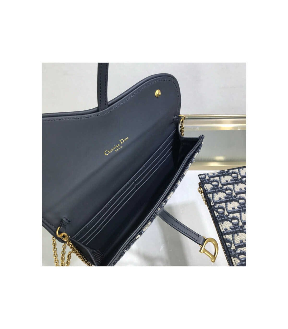The Saddle wallet, crafted in blue Dior Oblique jacquard, is a hybrid item with a modern and streamlined design. The style is embellished with an asymmetric flap and an antique gold-finish metal ‘D’ stirrup. Thanks to its removable chain, the wallet can be worn over the shoulder, crossbody or carried by hand.