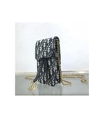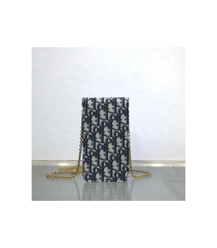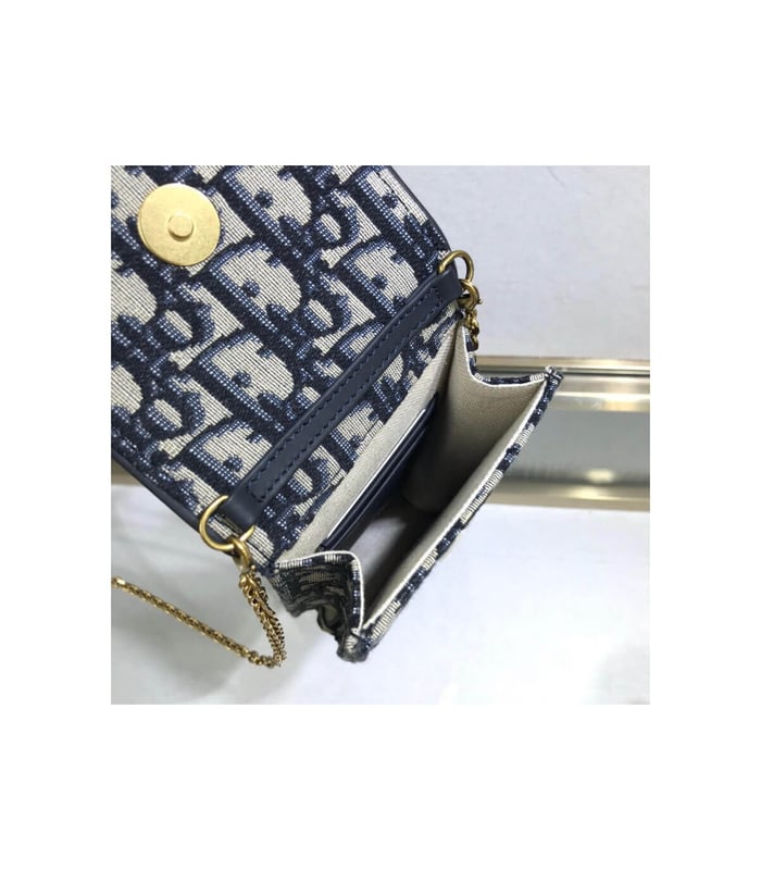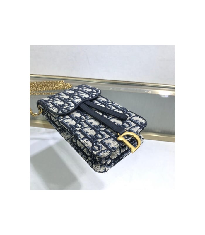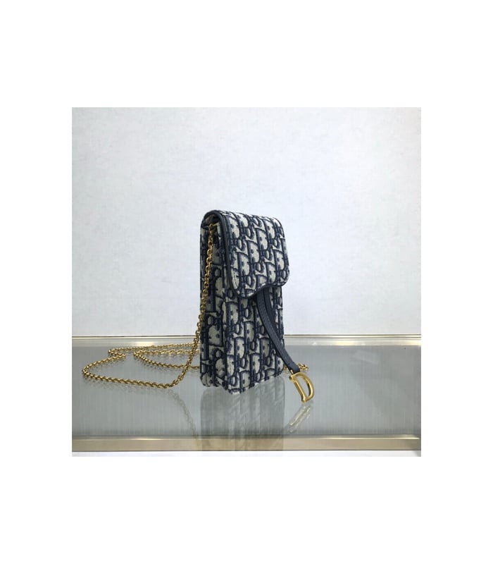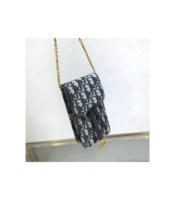 The vertical pouch, crafted in blue Dior Oblique jacquard, plays with the Saddle line’s codes. Its rectangular design with an asymmetrical flap and ‘D’ charm hold all the essentials. The interior features a main compartment with two card slots. The pouch has a removable chain and may be carried by hand, worn over the shoulder or crossbody.