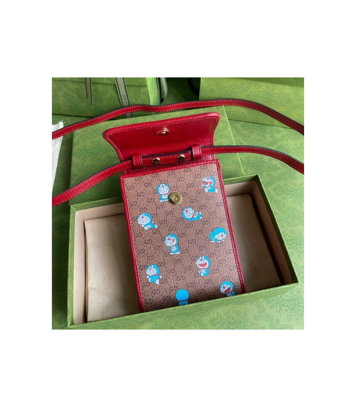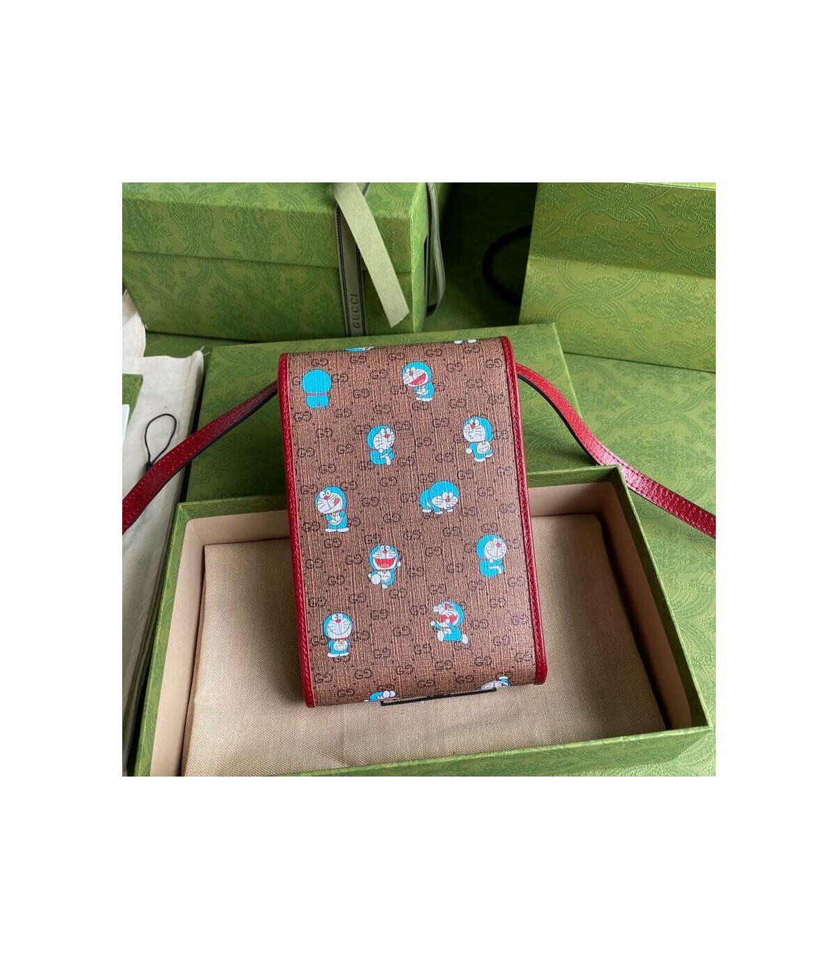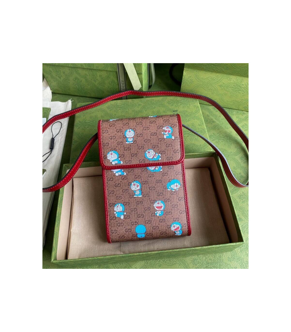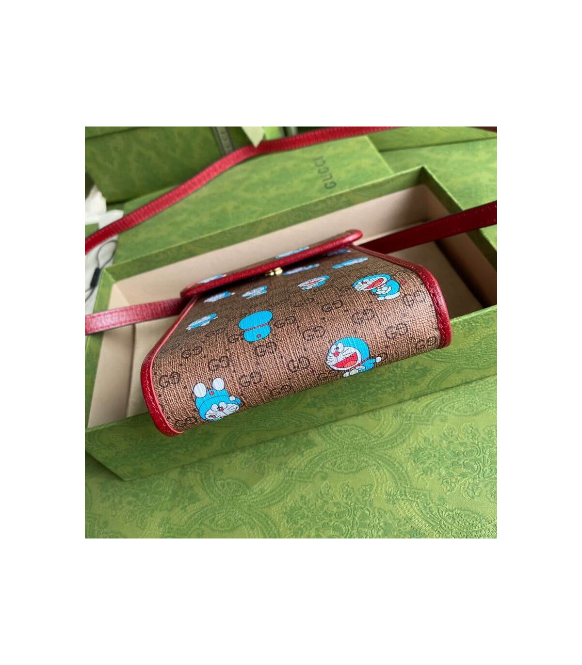 This bag is part of a special collaboration between Doraemon and Gucci. Born on September 3rd, 2112, a cat-type robot was sent from the 22nd century to help a young boy called Nobita with secret gadgets from his four-dimensional pouch. A playful character, Doraemon hates mice and loves Dorayaki, a sweet pancake.