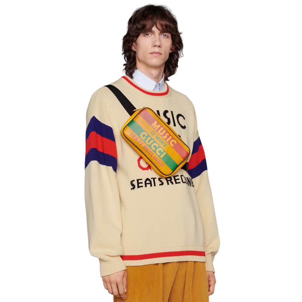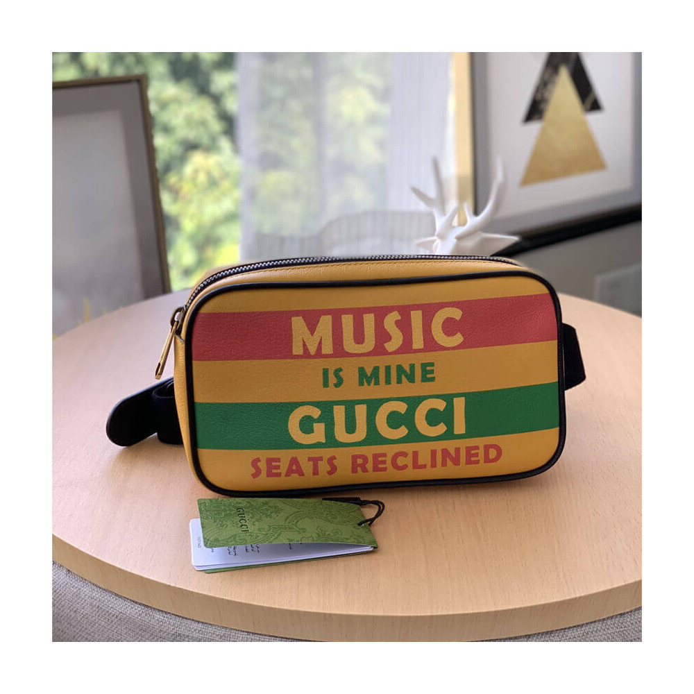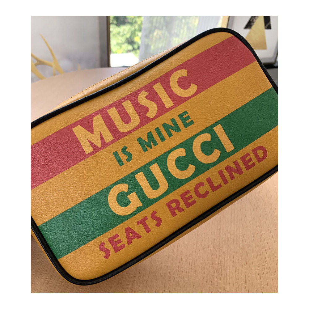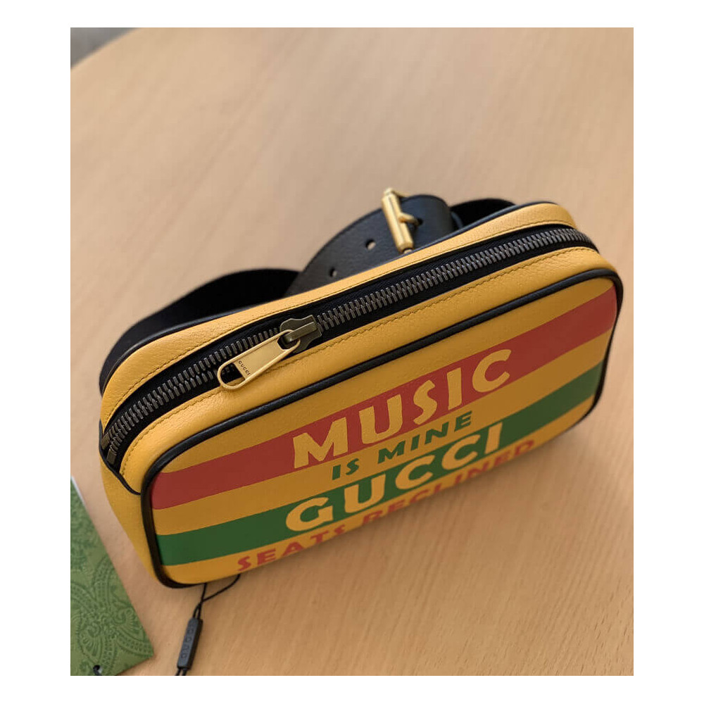 During its 100 years, Gucci has established itself as one of the most influential fashion houses. Becoming a status quo and household name within pop culture, songs have repeatedly celebrated Gucci with their lyrics. Paying homage to that, a mix of pieces from Aria are defined by lyrics of contemporary songs courtesy of ? Sony Music Publishing. Crafted from yellow leather, this belt bag is defined by a print featuring the words to “The R” By E. Barrier and W. Griffin.