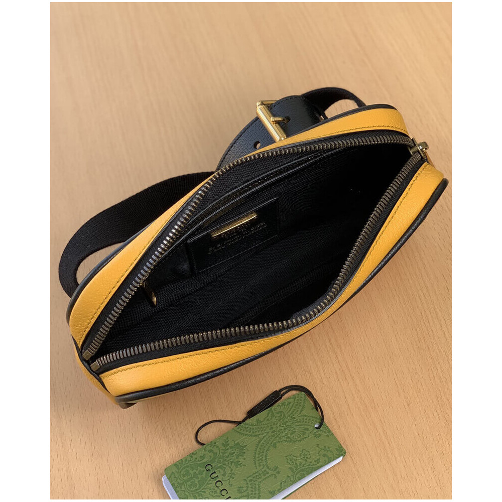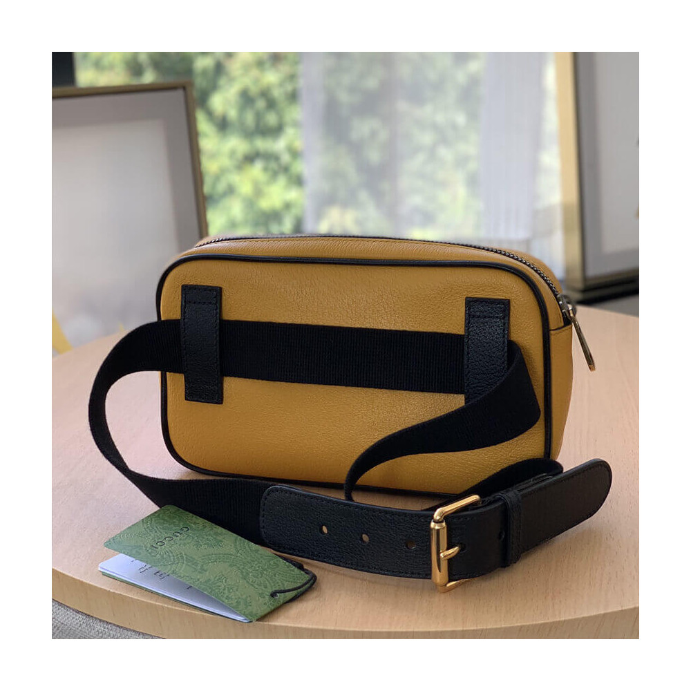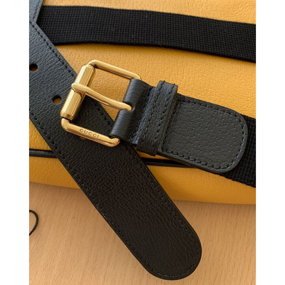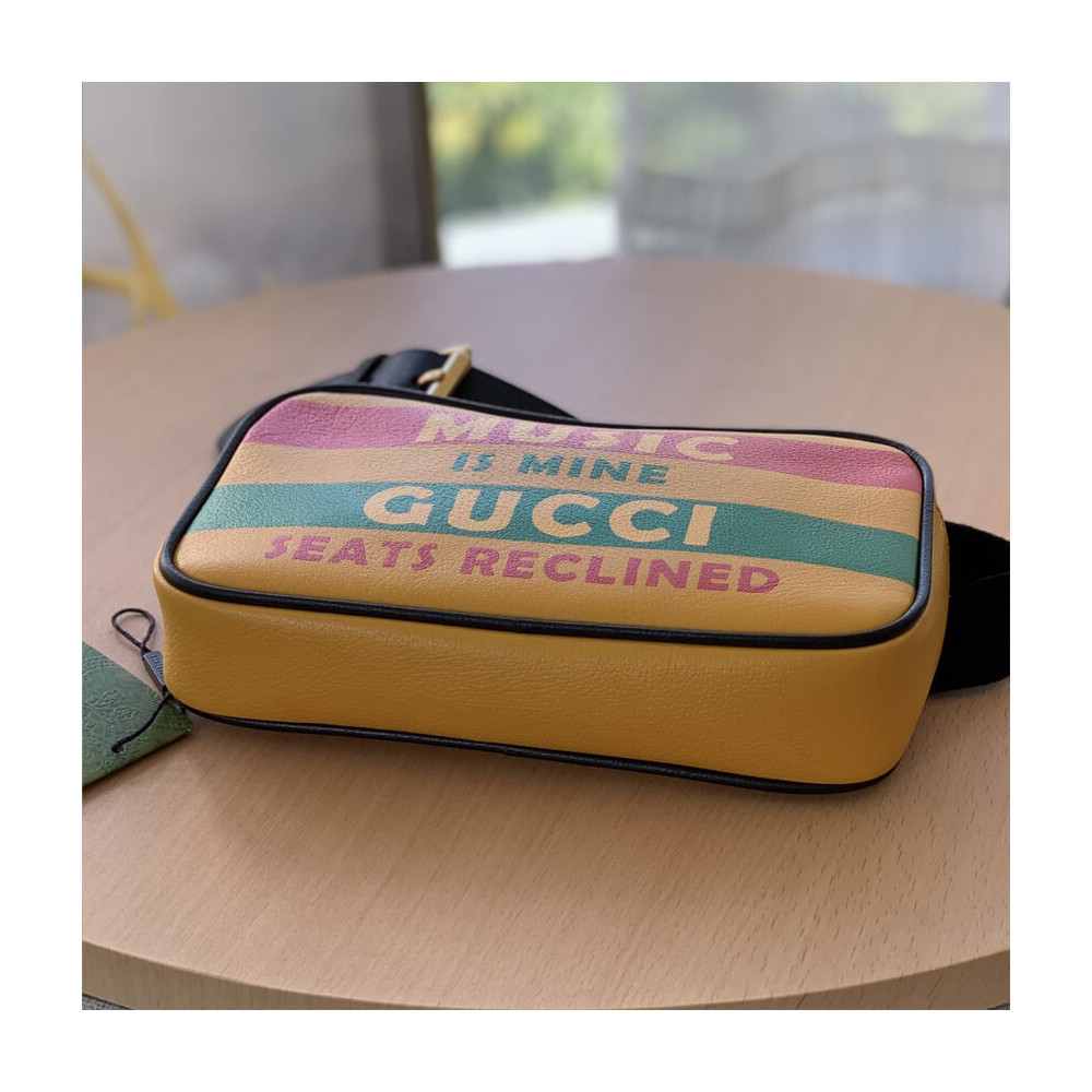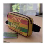 During its 100 years, Gucci has established itself as one of the most influential fashion houses. Becoming a status quo and household name within pop culture, songs have repeatedly celebrated Gucci with their lyrics. Paying homage to that, a mix of pieces from Aria are defined by lyrics of contemporary songs courtesy of ? Sony Music Publishing. Crafted from yellow leather, this belt bag is defined by a print featuring the words to “The R” By E. Barrier and W. Griffin.
