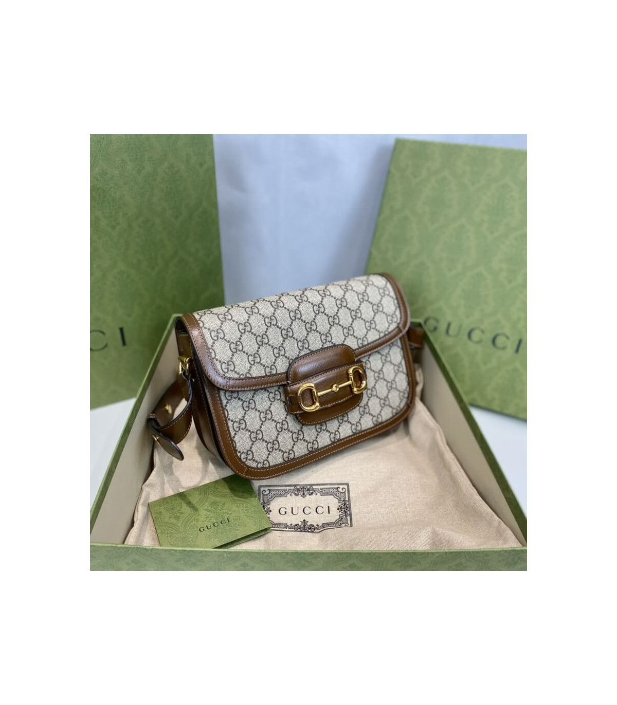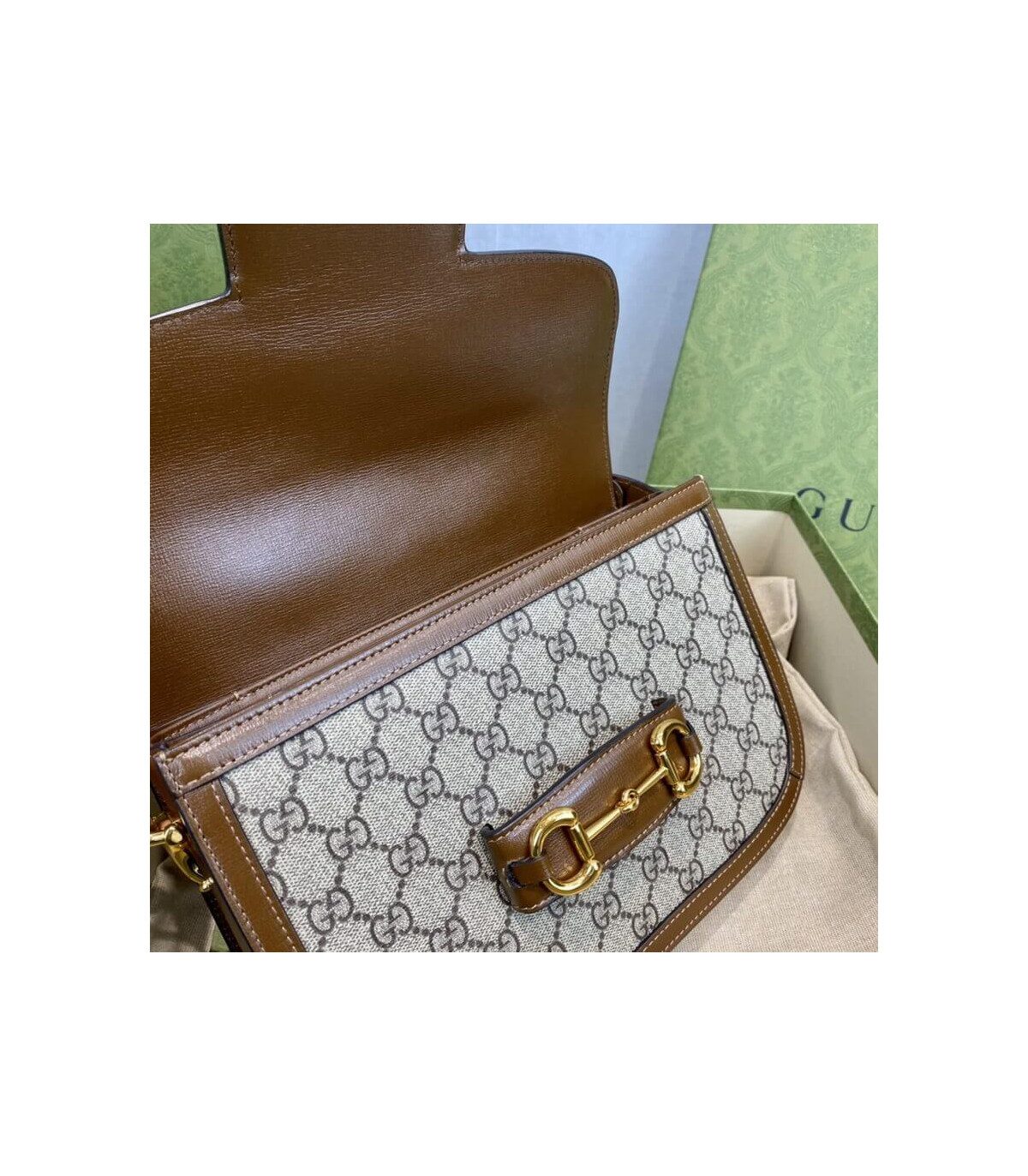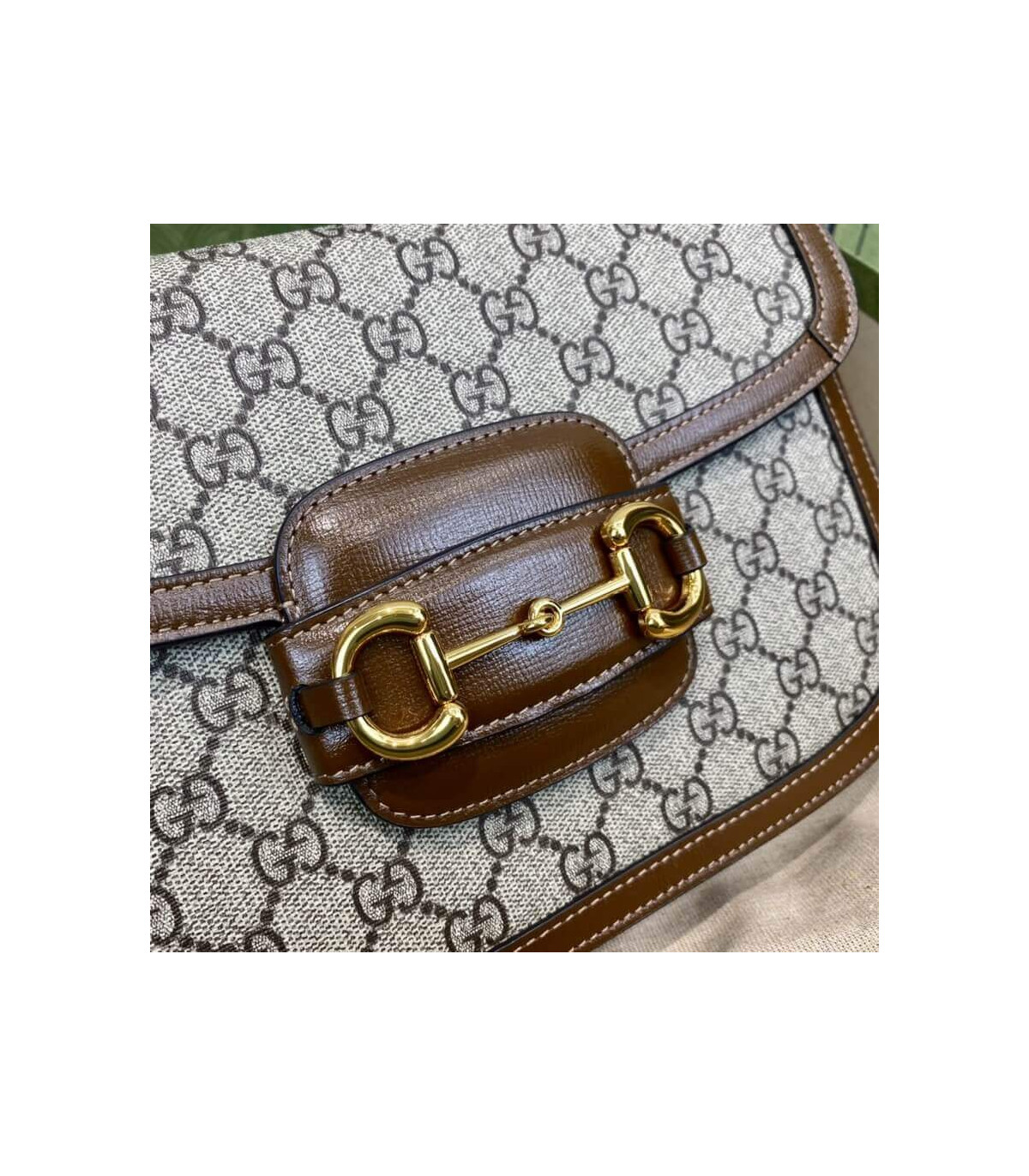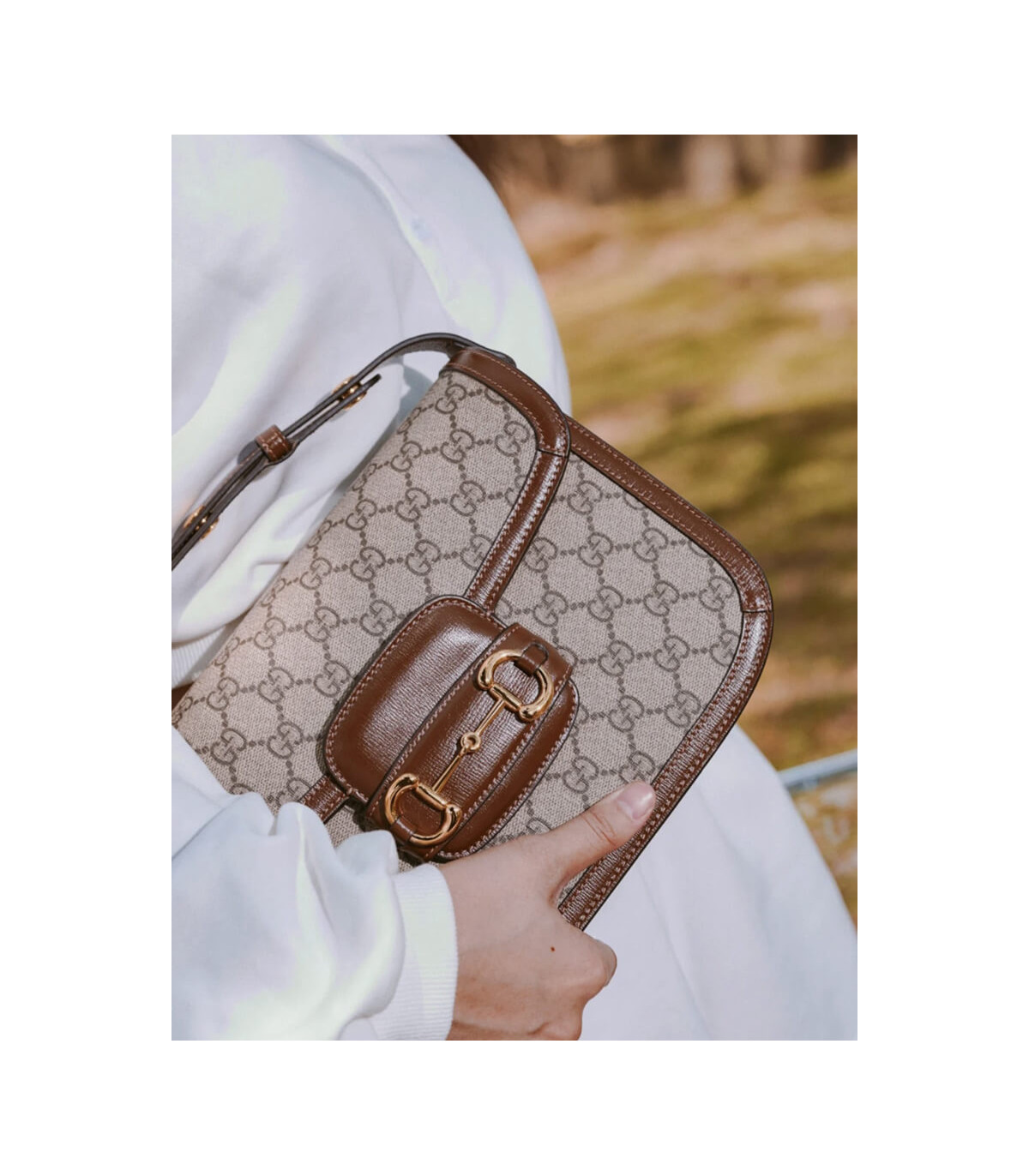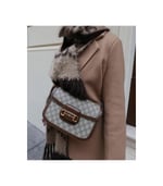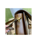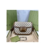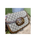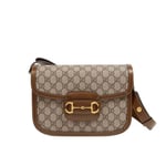 Crafted from beige/ebony GG Supreme canvas with brown leather trim, the bag combines timeless monogram style with eco-conscious material. The gold-toned Horsebit hardware is paired with an innovative adjustable shoulder strap mechanism, allowing the piece to be worn on the shoulder or as a crossbody.