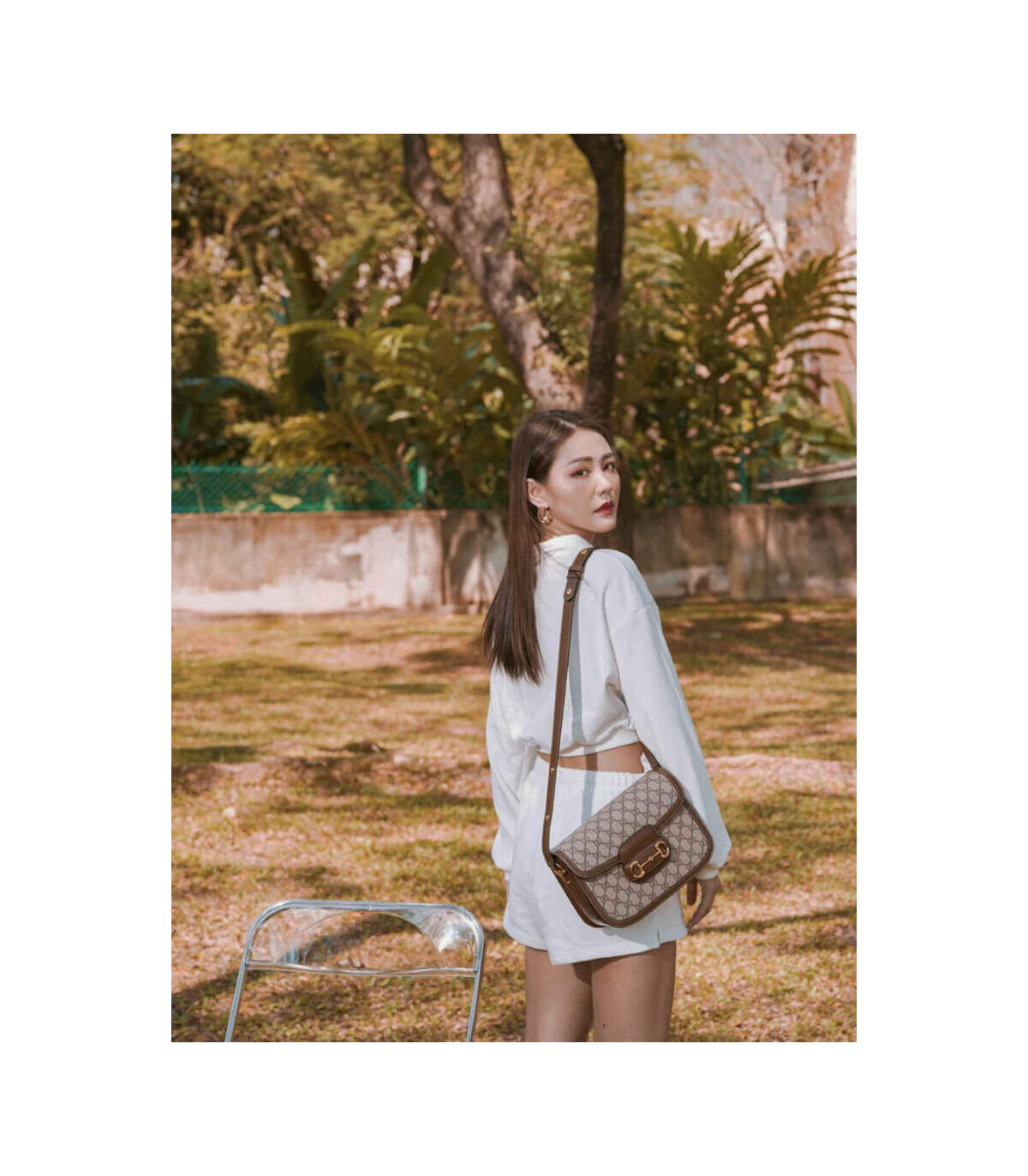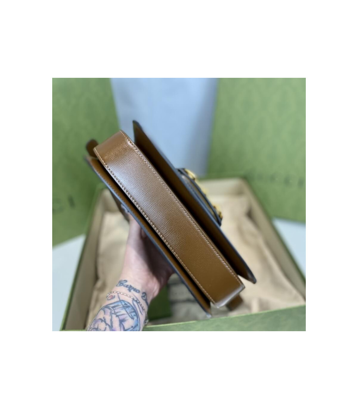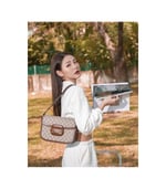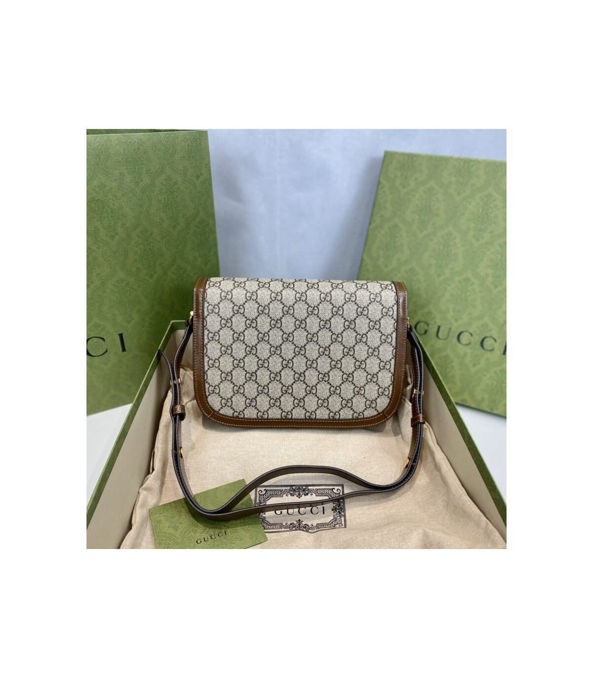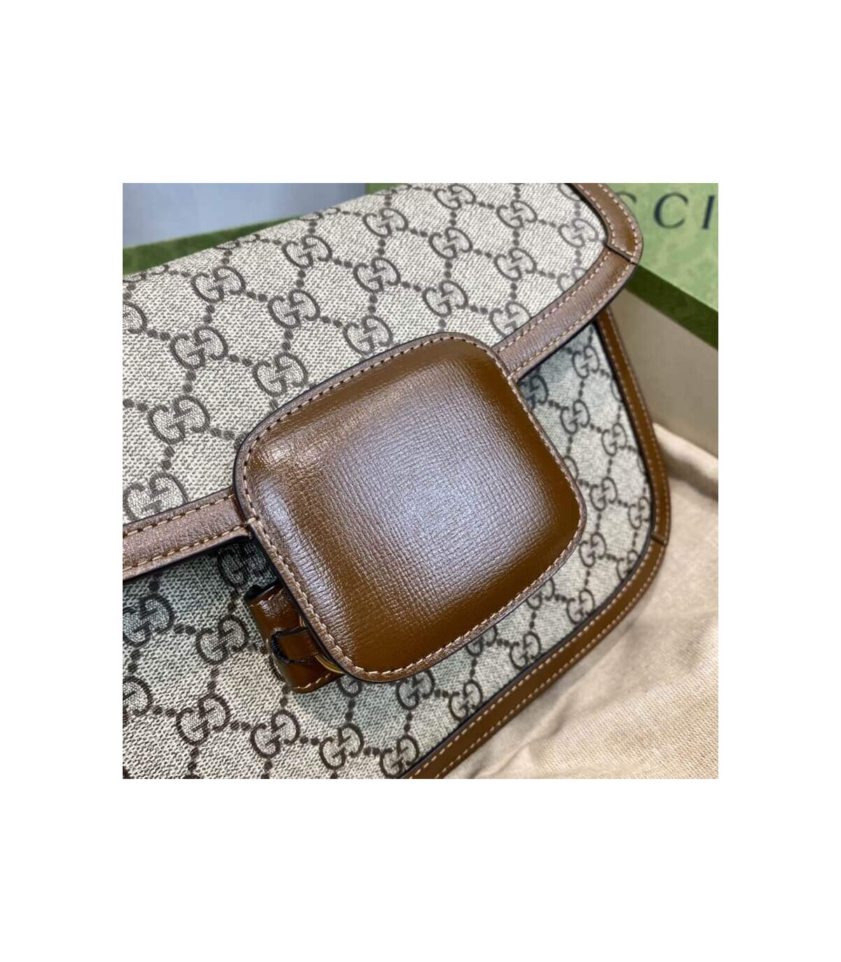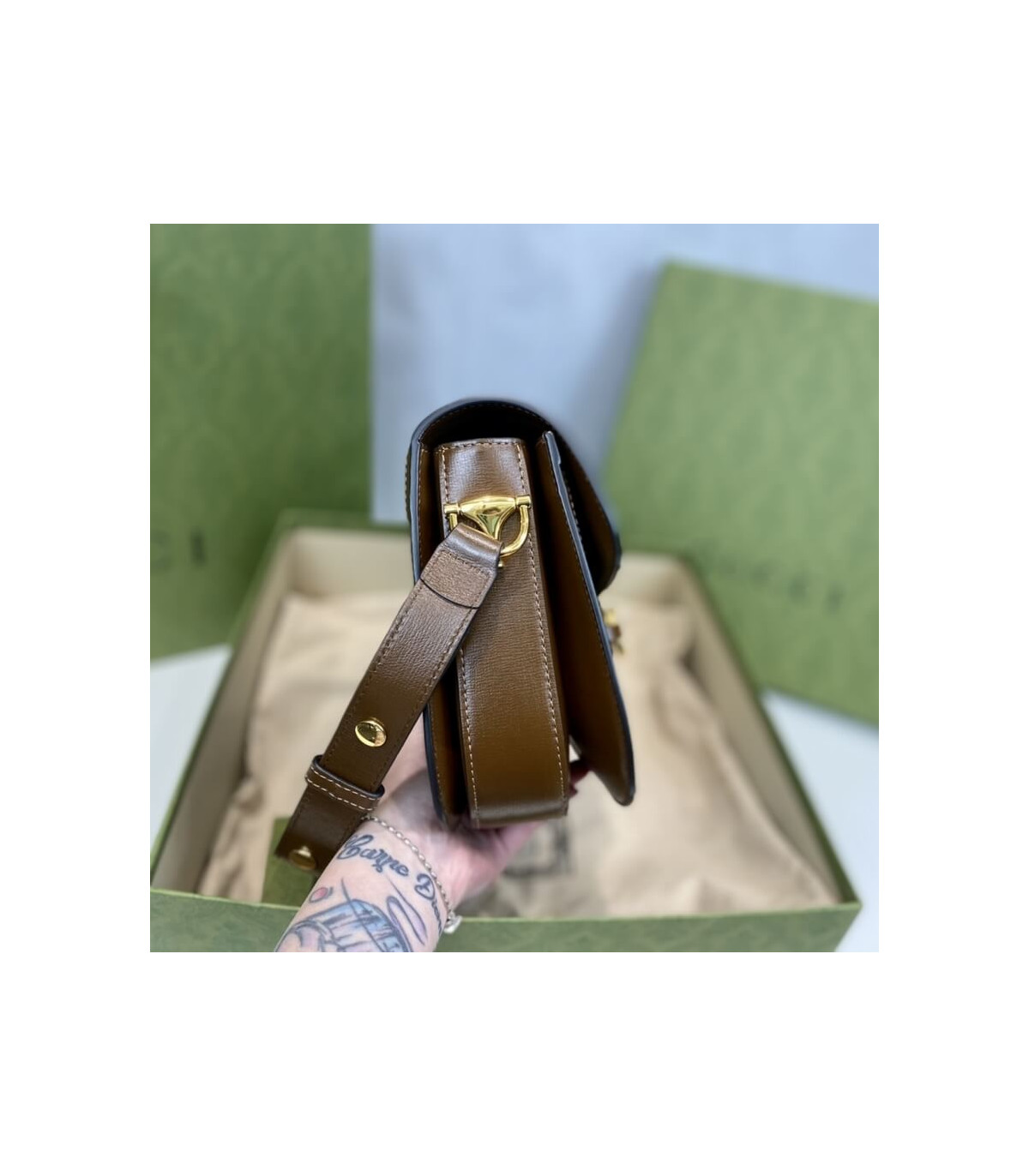 Crafted from beige/ebony GG Supreme canvas with brown leather trim, the bag combines timeless monogram style with eco-conscious material. The gold-toned Horsebit hardware is paired with an innovative adjustable shoulder strap mechanism, allowing the piece to be worn on the shoulder or as a crossbody.