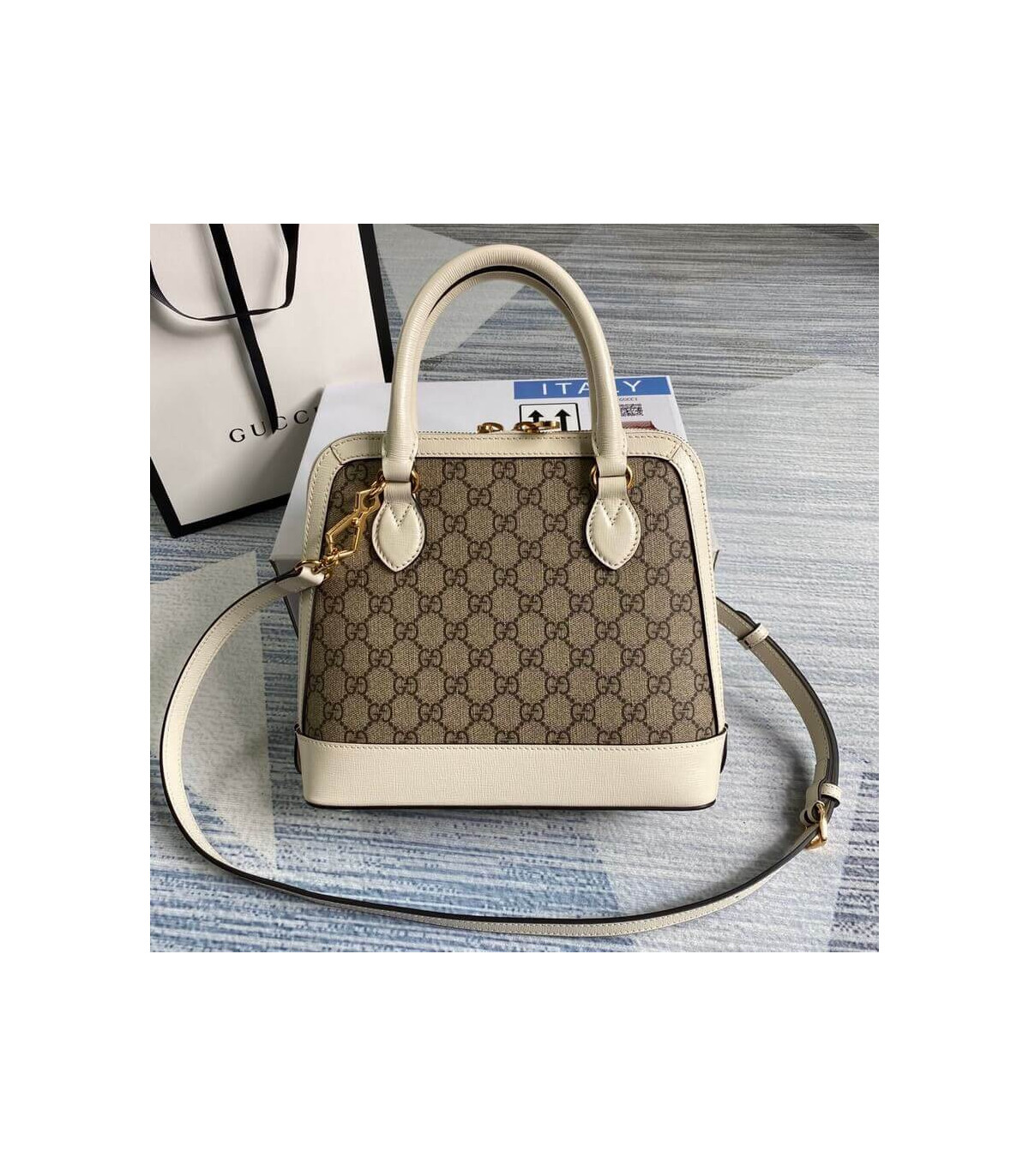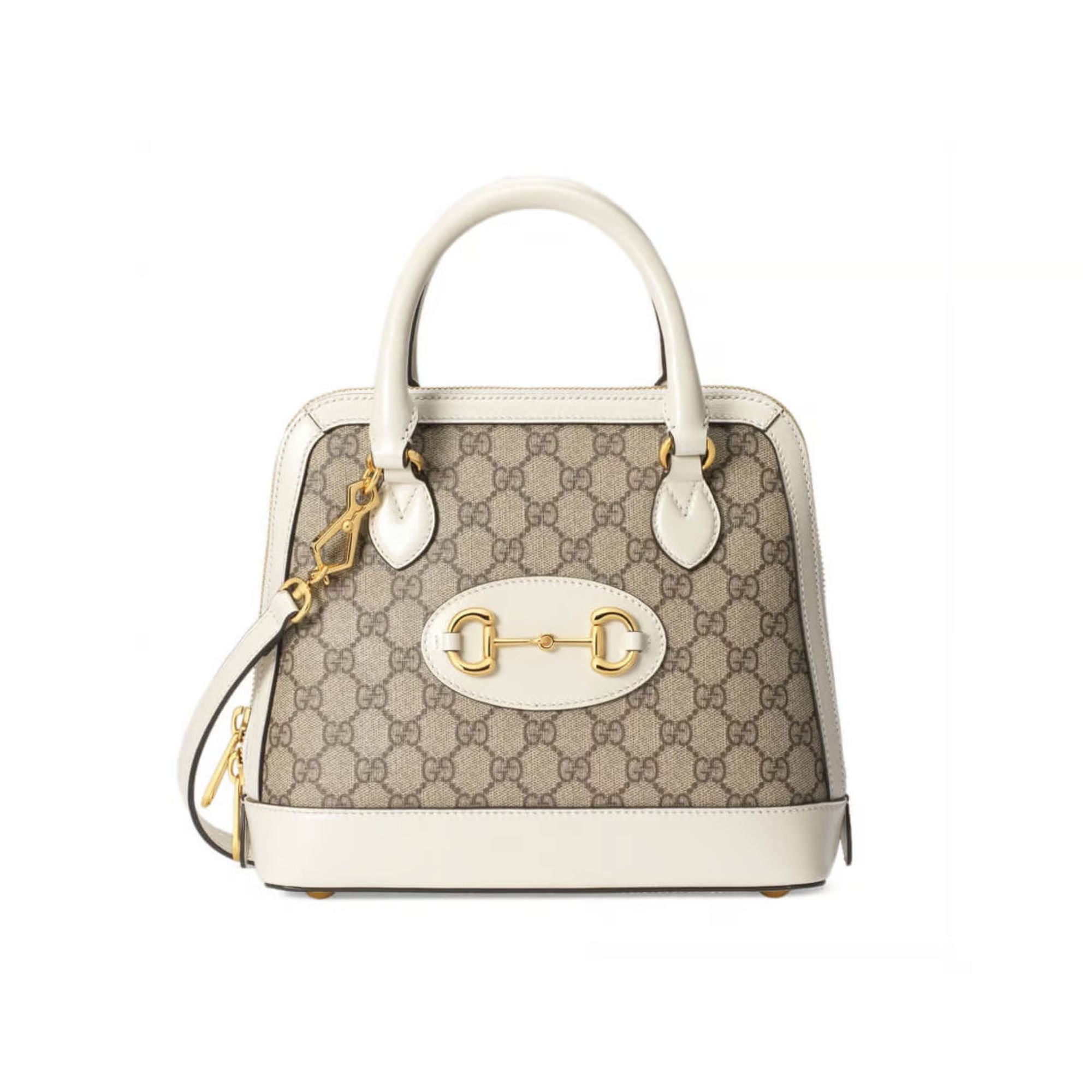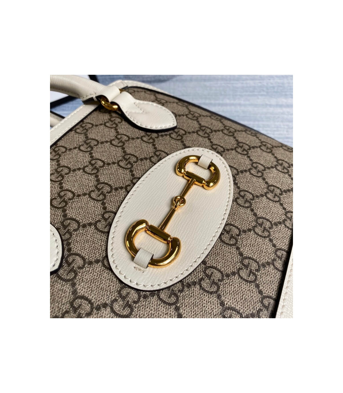 Crafted from beige/ebony GG Supreme canvas with crisp white leather trim, the bag features a cotton-linen lining and gold-toned hardware. A detachable and adjustable shoulder strap adds versatility, while protective metal feet and practical interior compartments ensure both style and function.