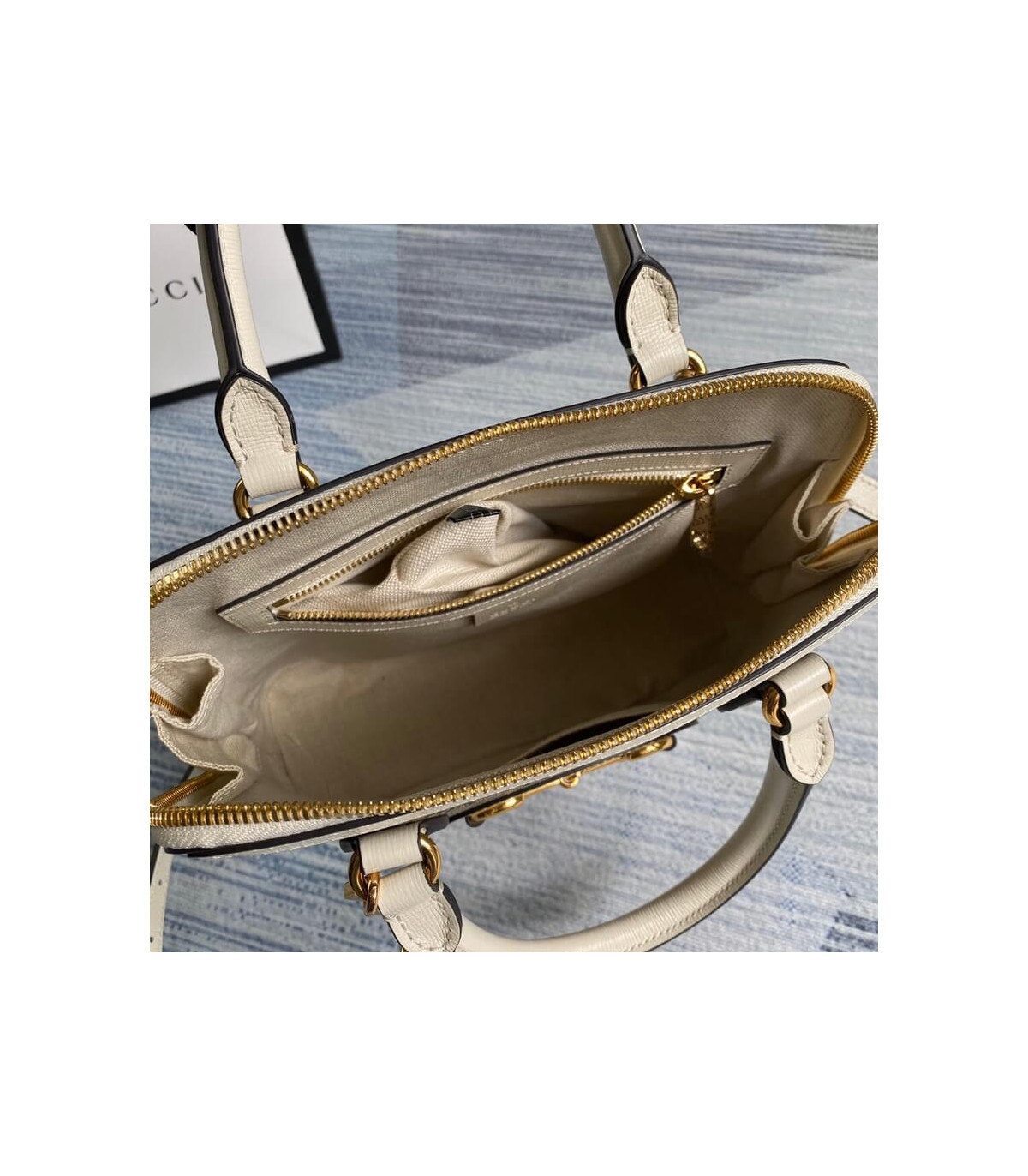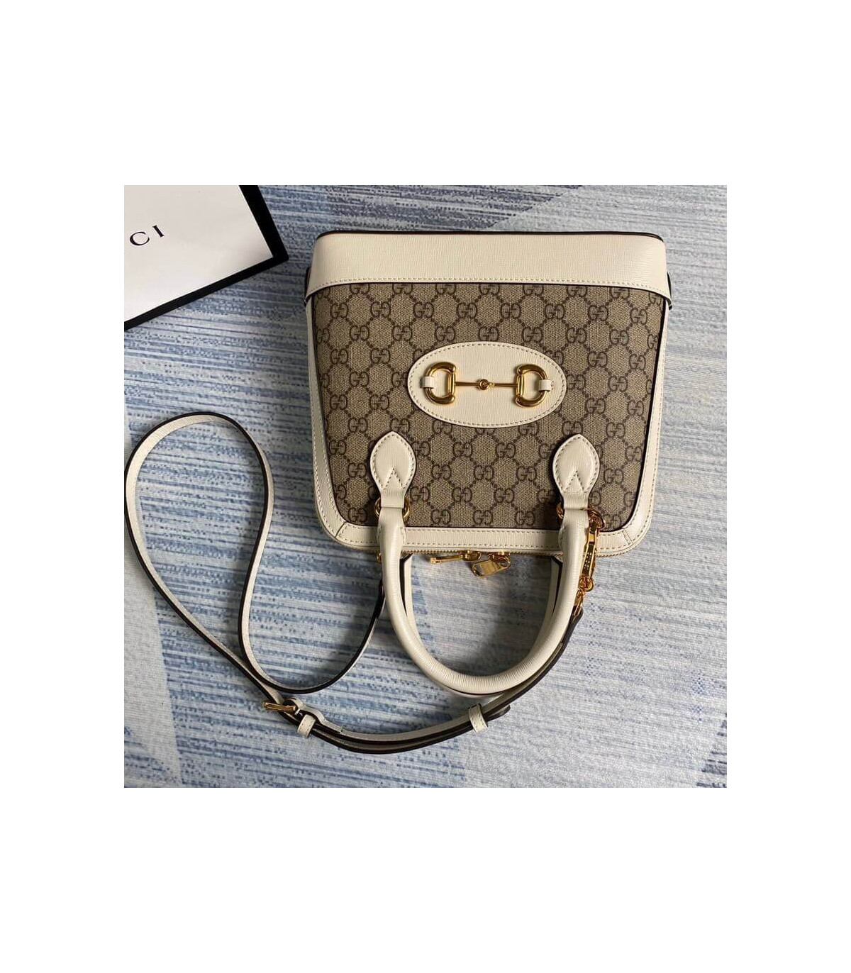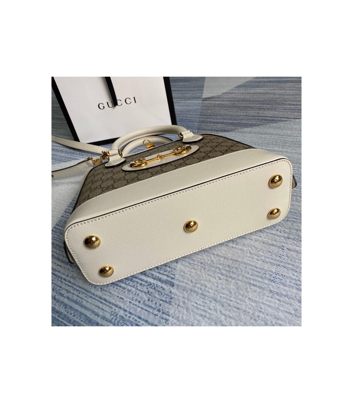 Crafted from beige/ebony GG Supreme canvas with crisp white leather trim, the bag features a cotton-linen lining and gold-toned hardware. A detachable and adjustable shoulder strap adds versatility, while protective metal feet and practical interior compartments ensure both style and function.