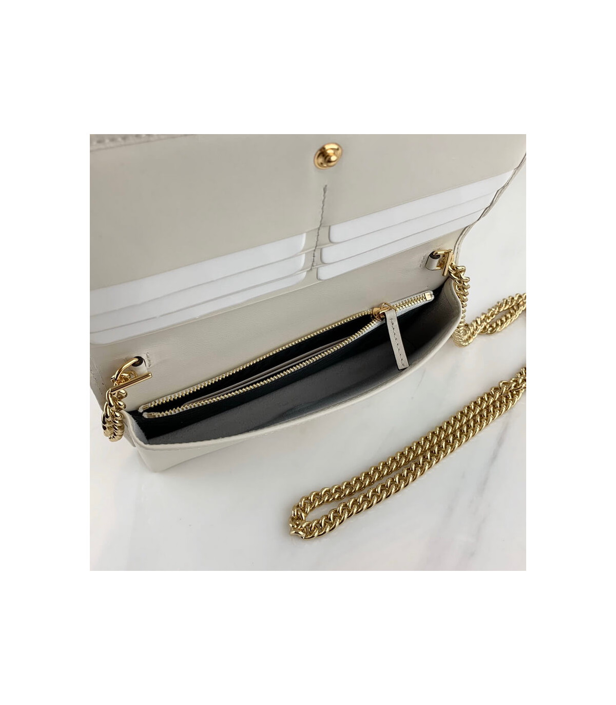 Featuring a folded, snap-button silhouette, the compact style opens to reveal a thoughtfully organized interior with card slots and pockets. A detachable gold-toned chain strap completes the versatile design.