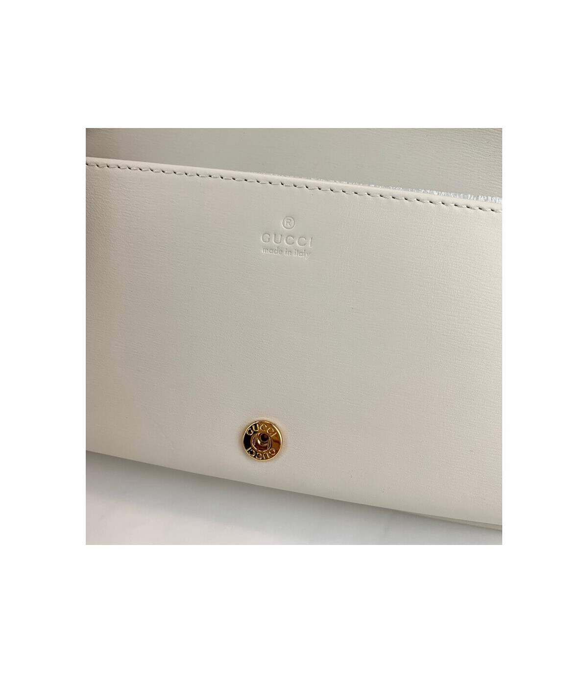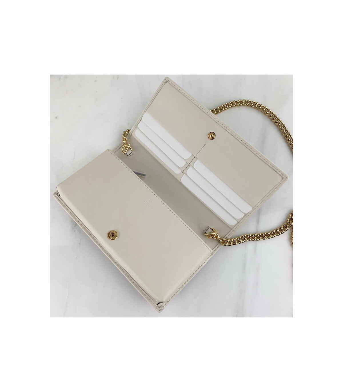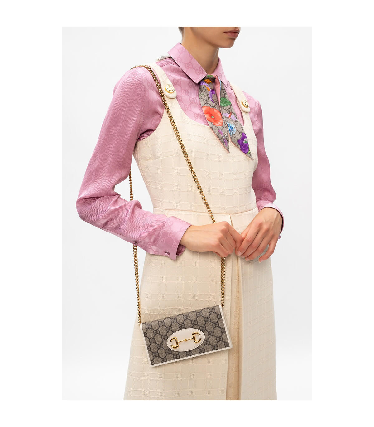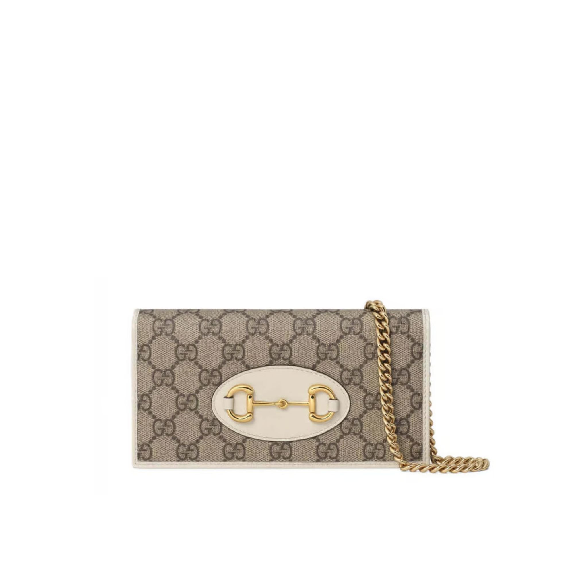 Part of the Gucci 1955 Horsebit accessories collection, this elegant chain wallet is crafted from the House’s signature beige/ebony GG Supreme canvas—an eco-conscious material with a timeless appeal. The iconic Horsebit detail, inspired by the House’s equestrian heritage, anchors the design, while white leather trim adds a fresh contrast.