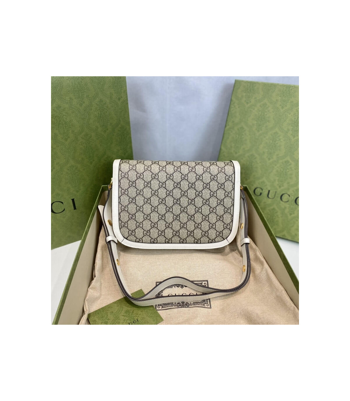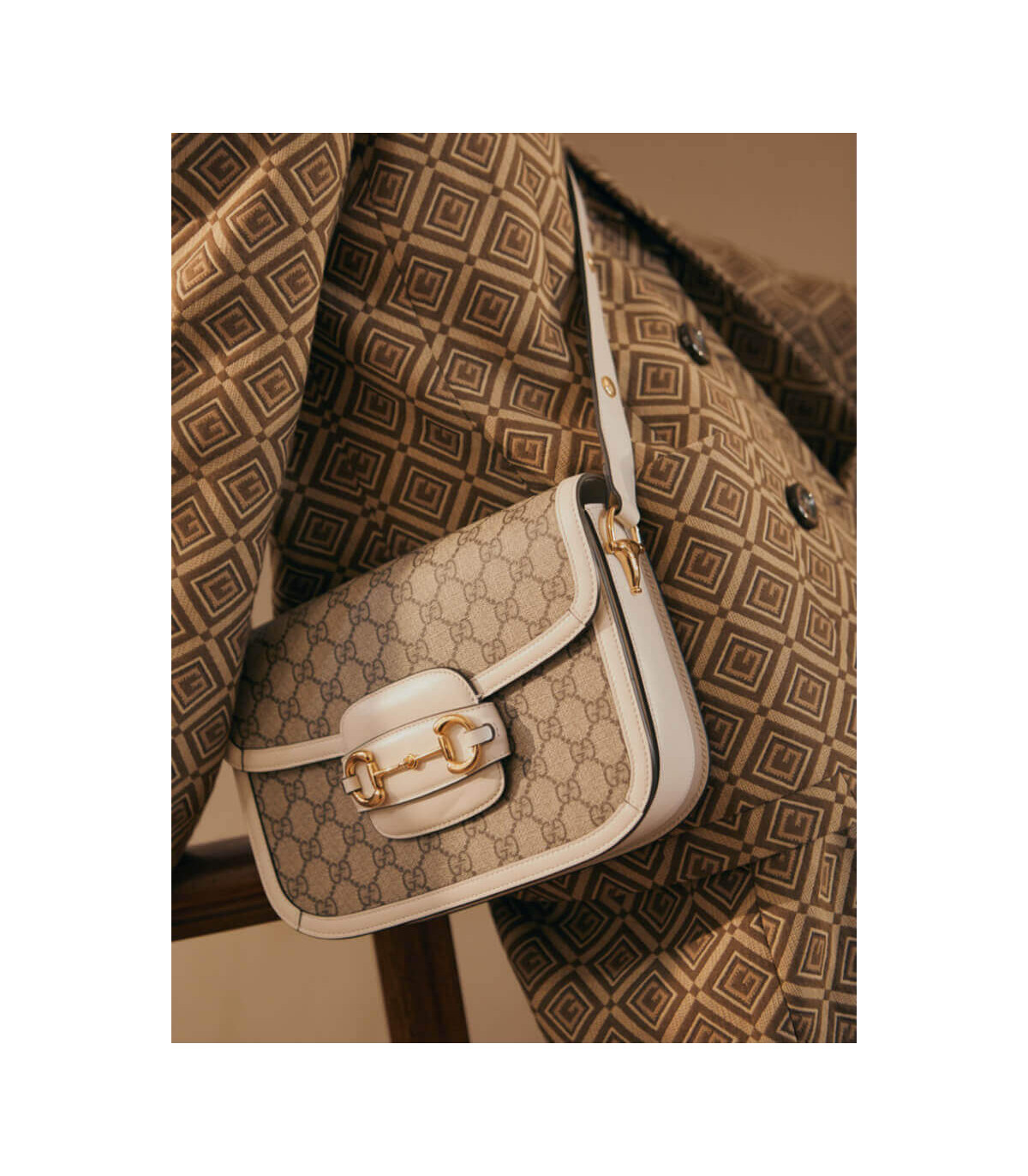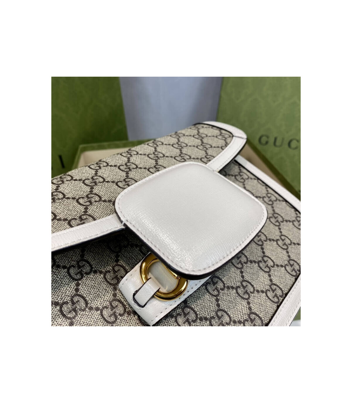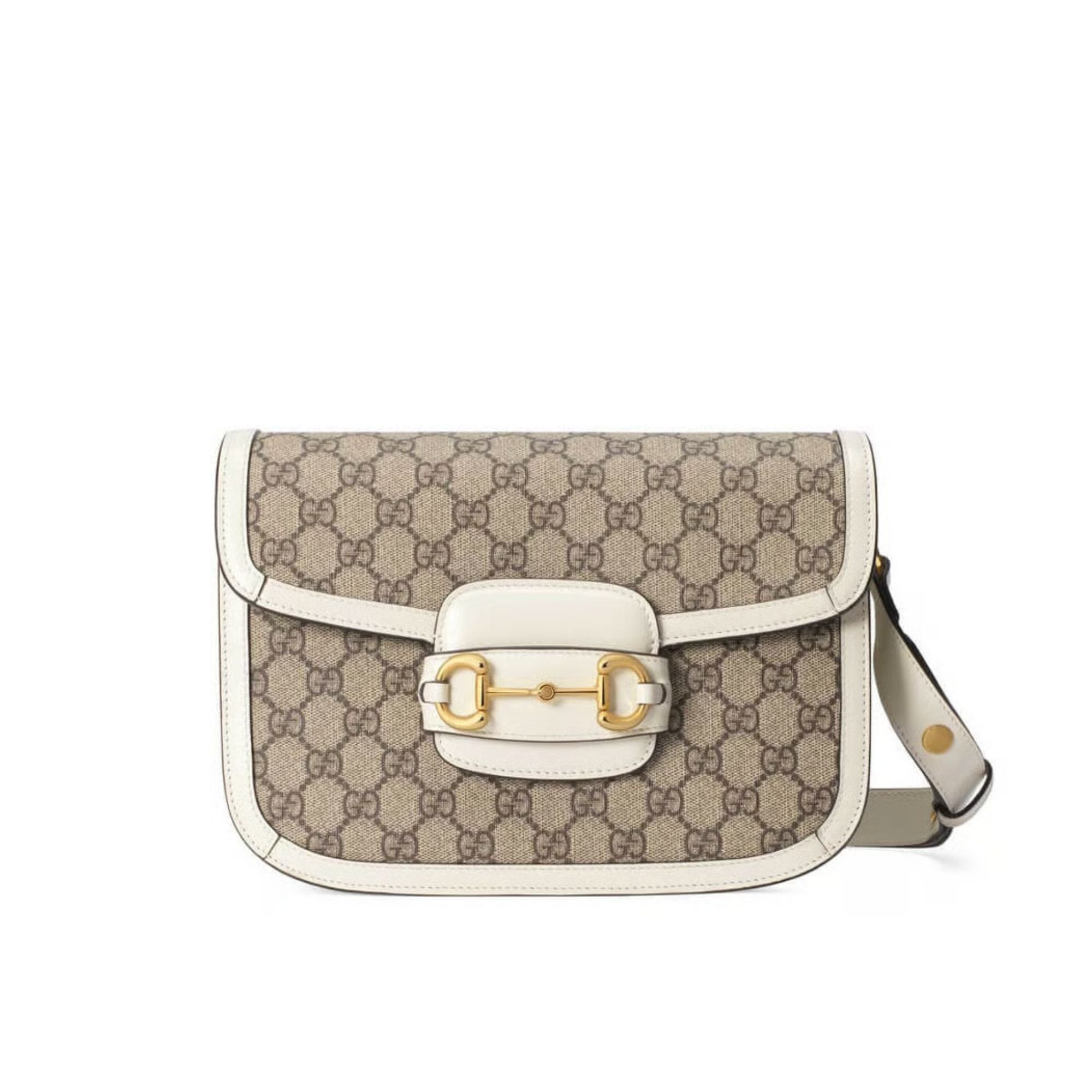 Crafted in beige/ebony GG Supreme canvas, a material with low environmental impact, the bag is finished with white leather trim and gold-toned hardware. A specially designed shoulder strap mechanism allows for versatile wear—either over the shoulder or as a crossbody.