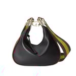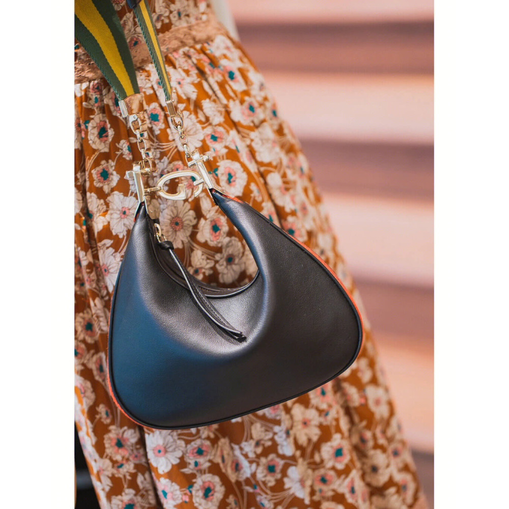 An ode to the timeless Hollywood glamour that shaped Gucci Love Parade, classic elements from the House’s archives are reintroduced. Distinguished by its crescent moon shape, the accessory is further defined by a G shaped hook closure. Paired with soft materials, the heritage hardware creates a refined design with vintage appeal. This small version is crafted in black leather with orange and black Web trim.