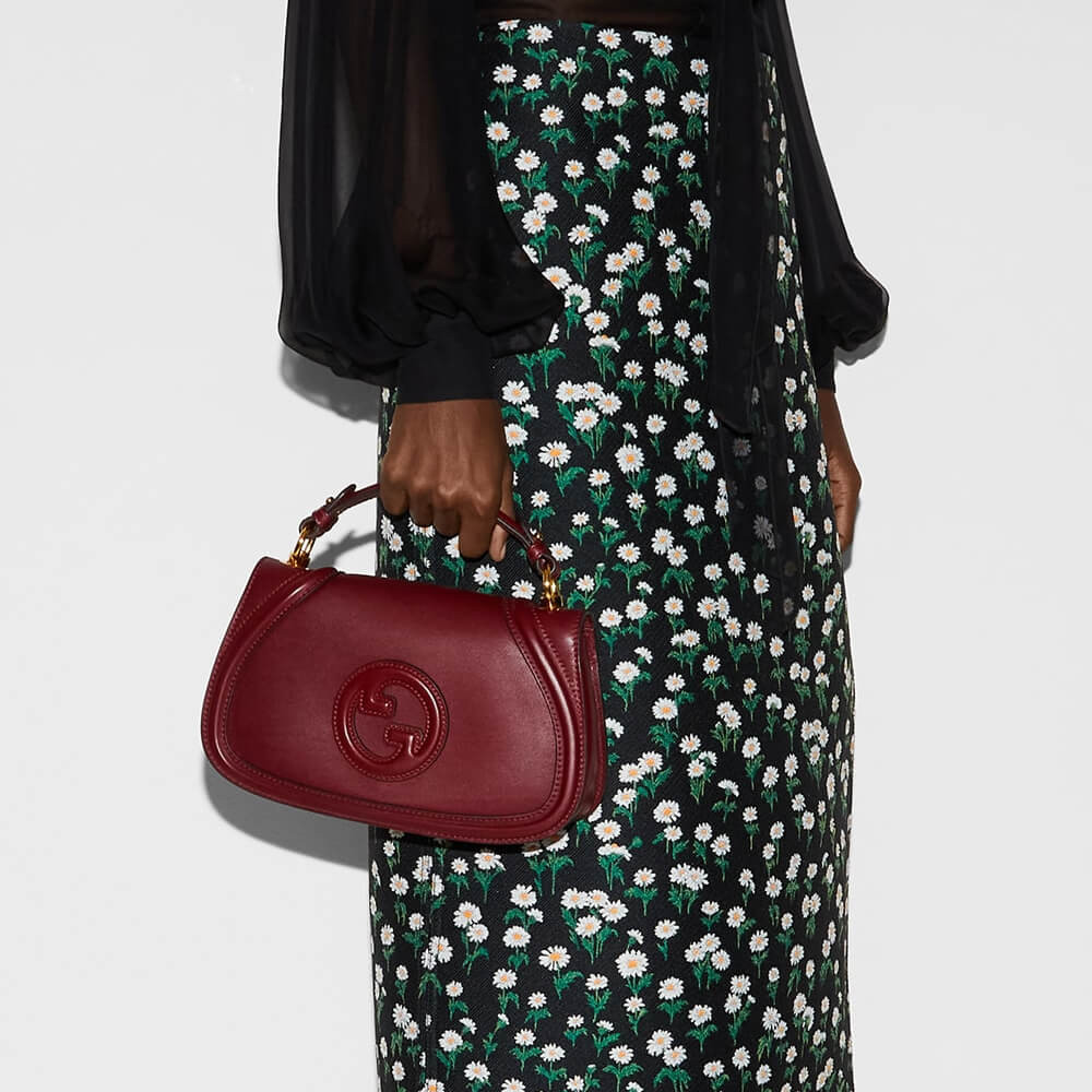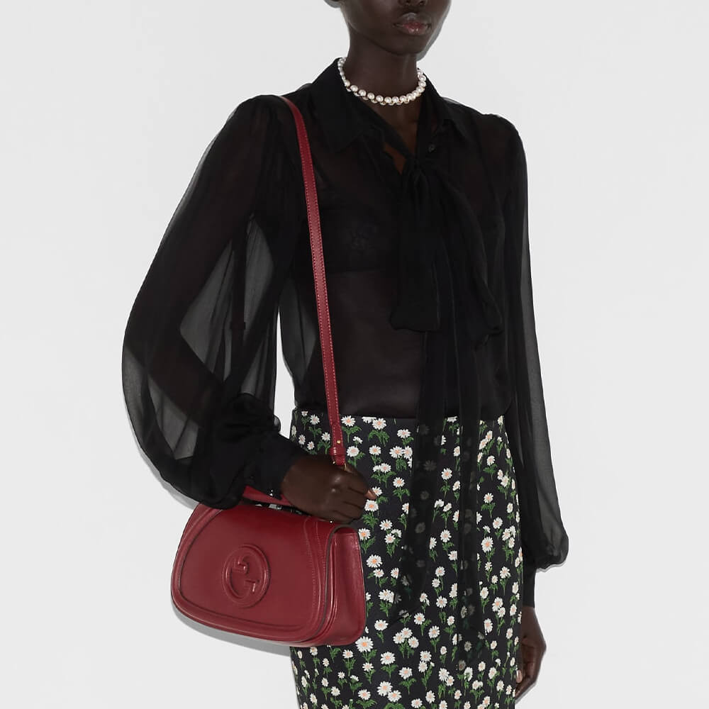 The new Gucci Blondie bag, whose distinctive logo first appeared in the House’s collections in the early 1970s, weaves together past and present in a fusion of nostalgia and modernity. This small top handle bag with a detachable and adjustable leather shoulder strap is crafted from black smooth leather.